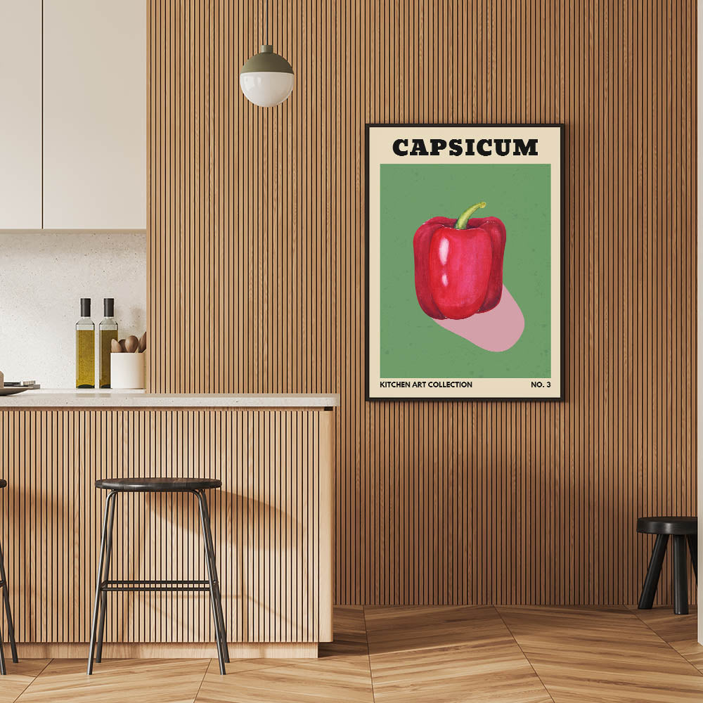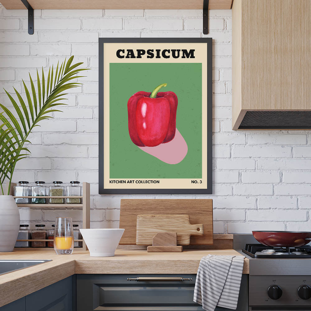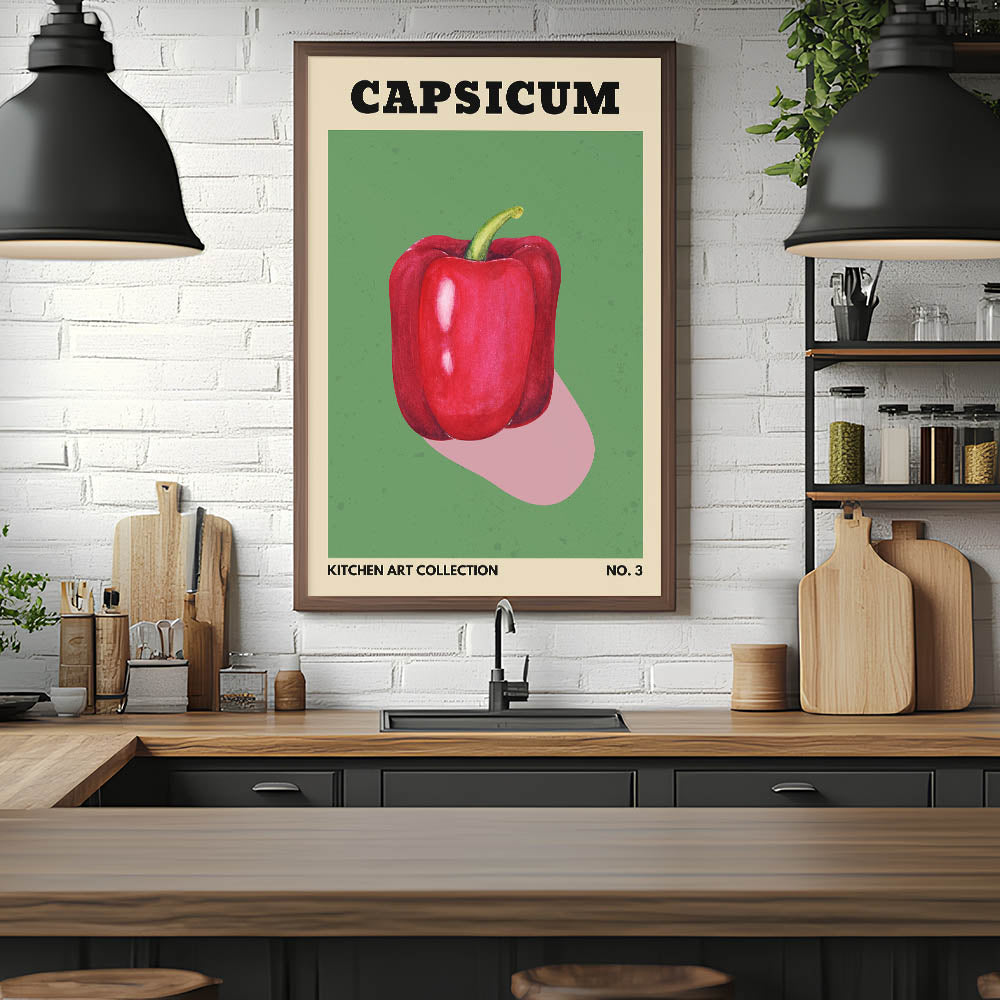 Bring bold color and modern design into your kitchen with this fruit illustration print, featuring a vibrant red capsicum against a rich green background. The vintage typography and contemporary layout create a trendy yet nostalgic aesthetic, making this fruit kitchen art ideal for food lovers, chefs, and home decor enthusiasts.