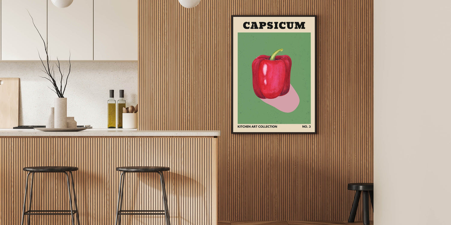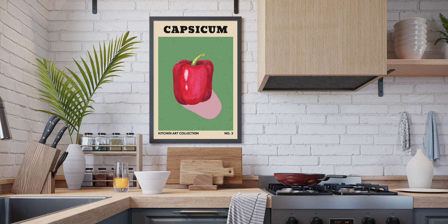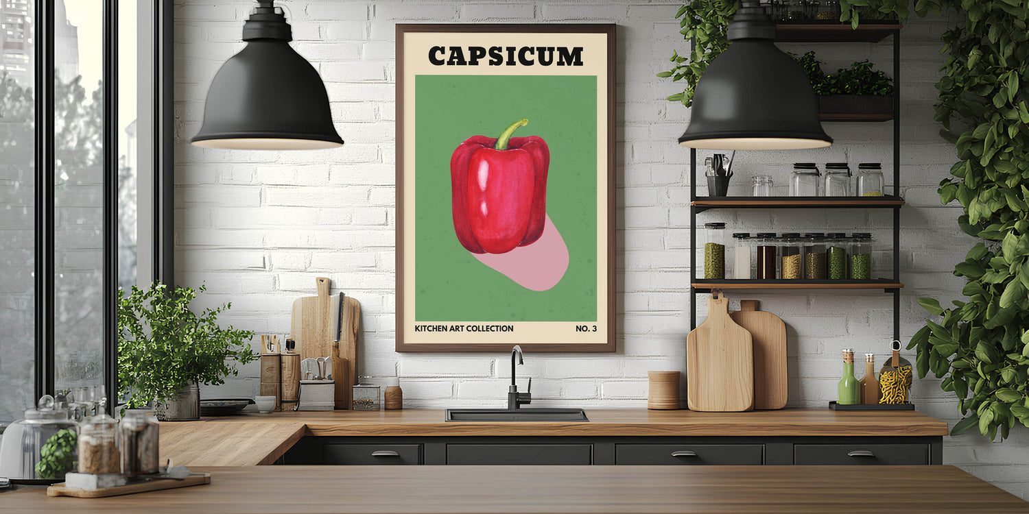 Bring bold color and modern design into your kitchen with this fruit illustration print, featuring a vibrant red capsicum against a rich green background. The vintage typography and contemporary layout create a trendy yet nostalgic aesthetic, making this fruit kitchen art ideal for food lovers, chefs, and home decor enthusiasts.