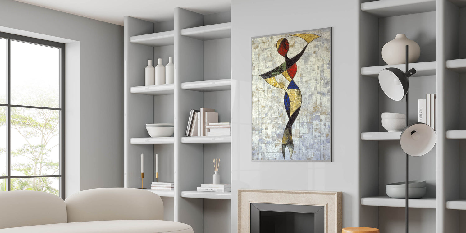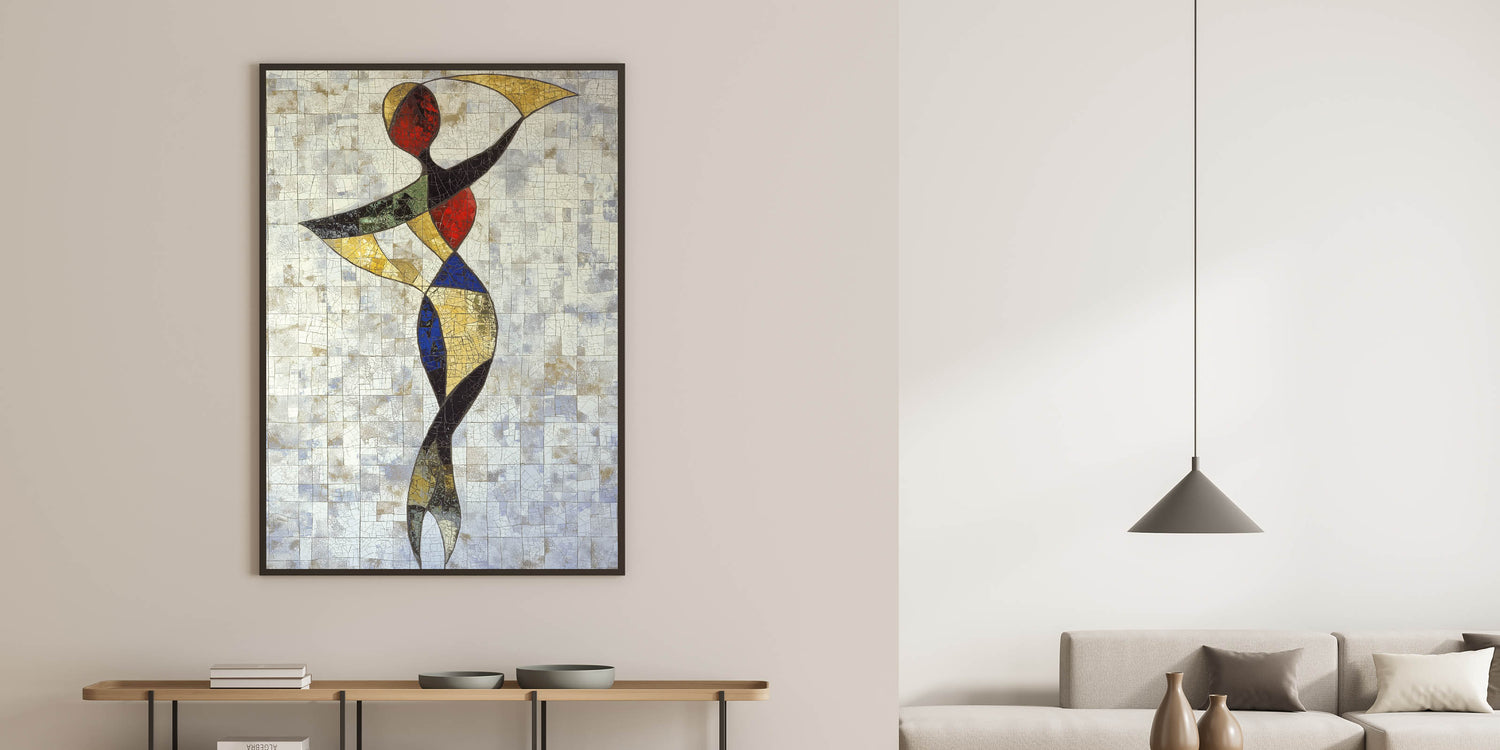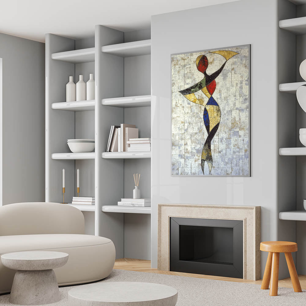 Enhance your space with this stunning mosaic-inspired abstract wall art, featuring an expressive figure in bold geometric shapes and vibrant colors. This canvas wall art brings a modern artistic touch to living room décor, making it an eye-catching centerpiece for contemporary interiors.
