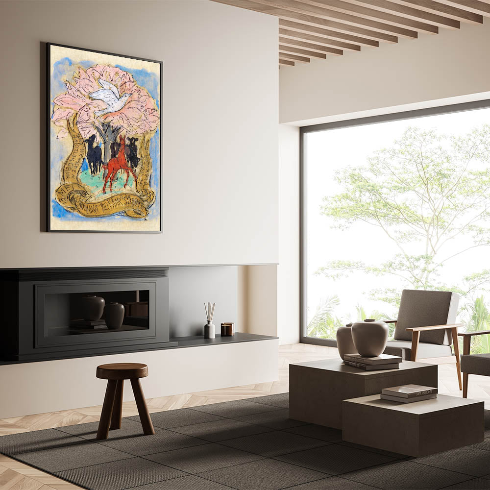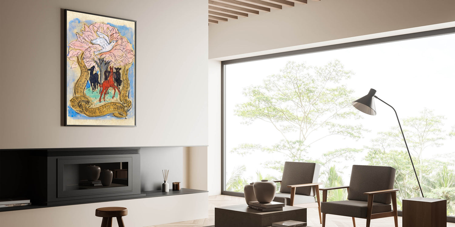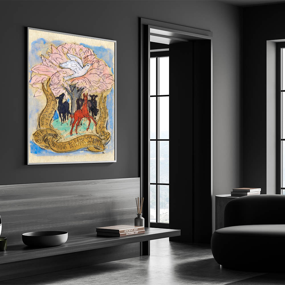 Celebrate the essence of life and artistry with the "Birth Celebration" Modern Wall Art. Inspired by Leo Gestel's 1935 design, this unique artwork combines expressive linework, vibrant colors, and whimsical imagery of a dove, horses, and floral elements. Perfect for anyone seeking abstract modern art that evokes joy and symbolism.