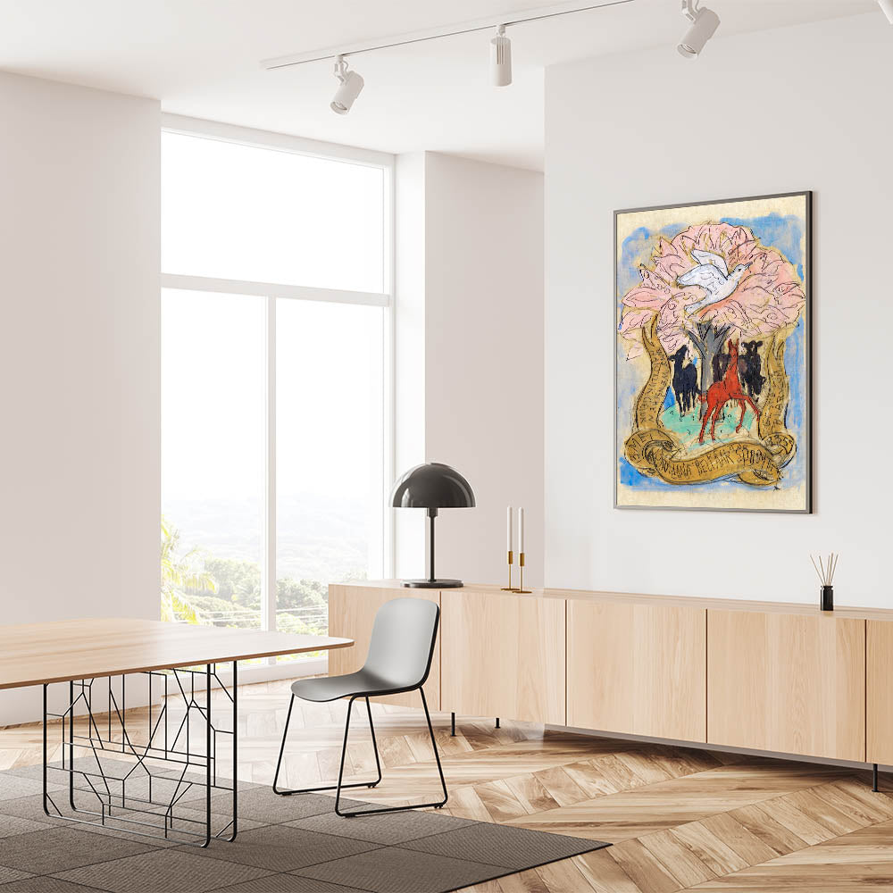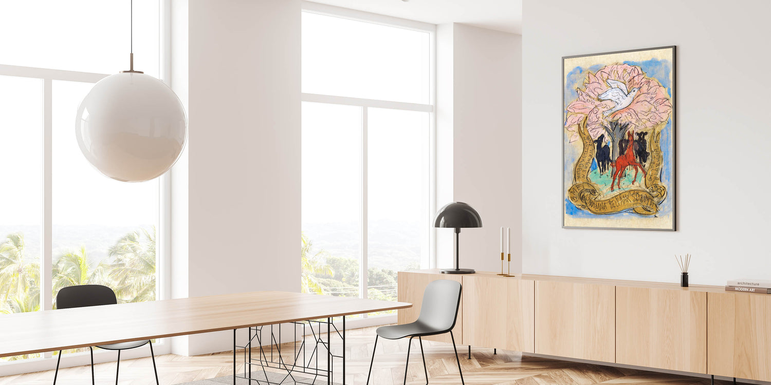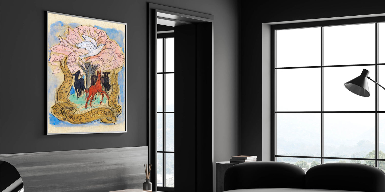 Celebrate the essence of life and artistry with the "Birth Celebration" Modern Wall Art. Inspired by Leo Gestel's 1935 design, this unique artwork combines expressive linework, vibrant colors, and whimsical imagery of a dove, horses, and floral elements. Perfect for anyone seeking abstract modern art that evokes joy and symbolism.