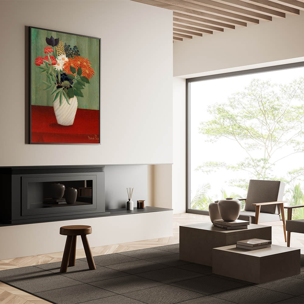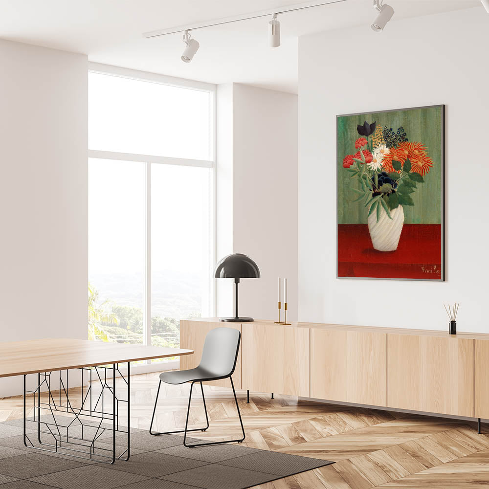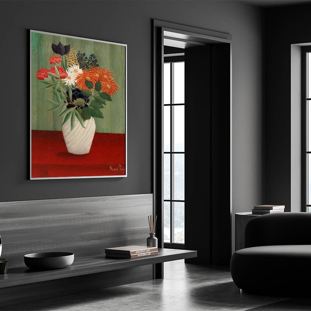 Brighten your space with Modern Wall Art, featuring Bouquet of Flowers with China Asters and Tokyo by Henri Rousseau. This enchanting still life showcases a meticulously arranged bouquet of vibrant blooms in a classic white vase, set against a soft green backdrop and a bold red table. Perfect for lovers of unique modern art, this piece radiates charm and sophistication, making it an ideal addition to trendy home decor.
