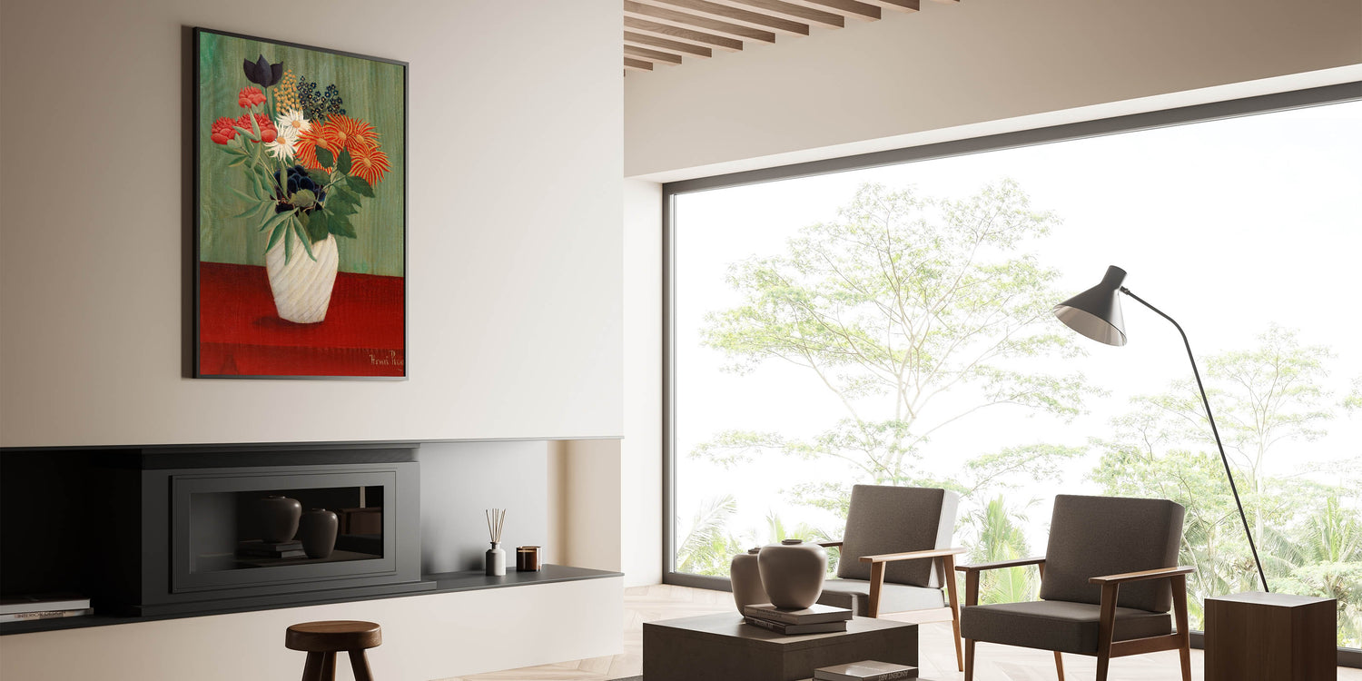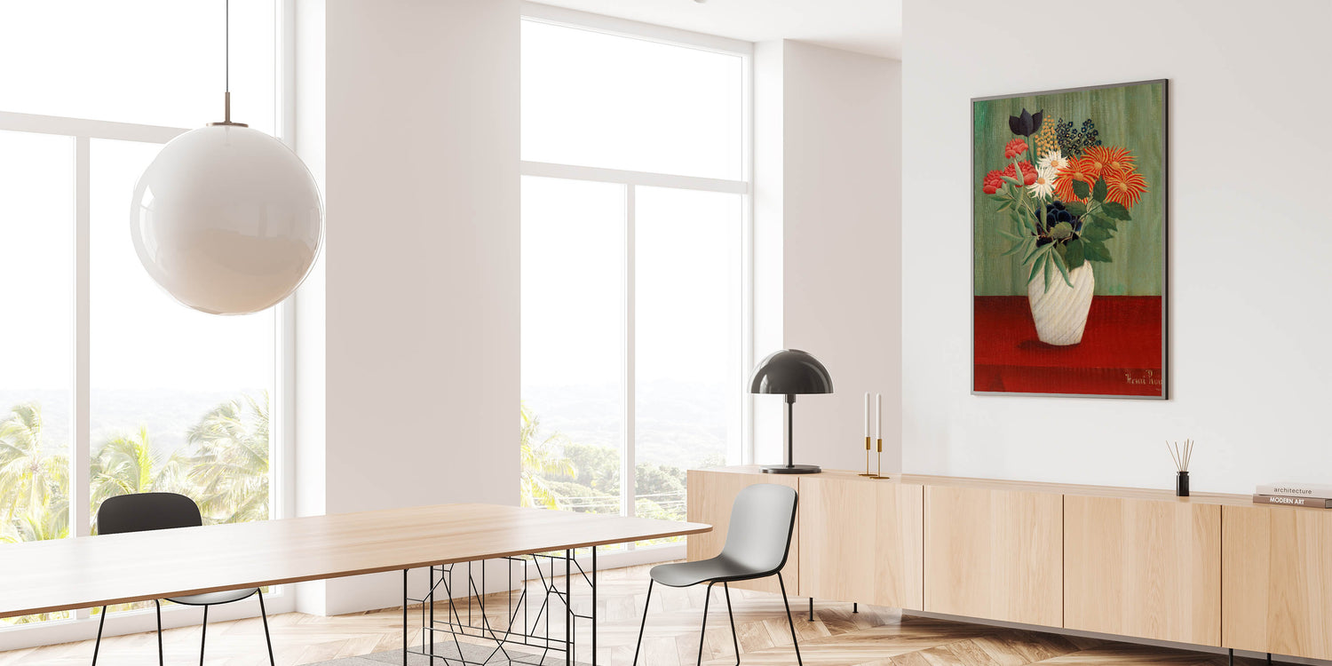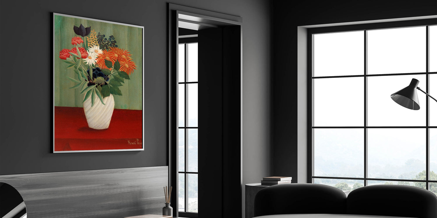 Brighten your space with Modern Wall Art, featuring Bouquet of Flowers with China Asters and Tokyo by Henri Rousseau. This enchanting still life showcases a meticulously arranged bouquet of vibrant blooms in a classic white vase, set against a soft green backdrop and a bold red table. Perfect for lovers of unique modern art, this piece radiates charm and sophistication, making it an ideal addition to trendy home decor.