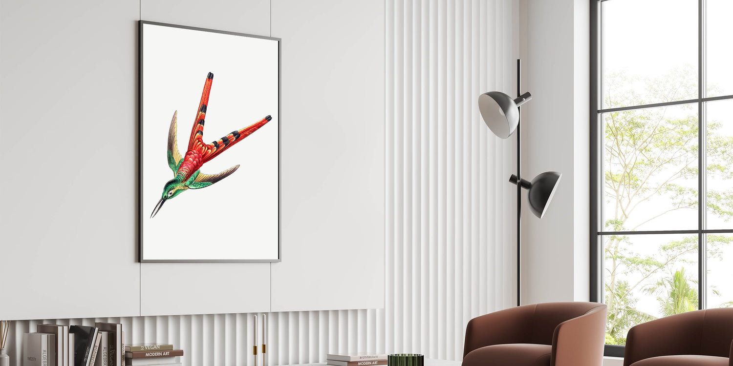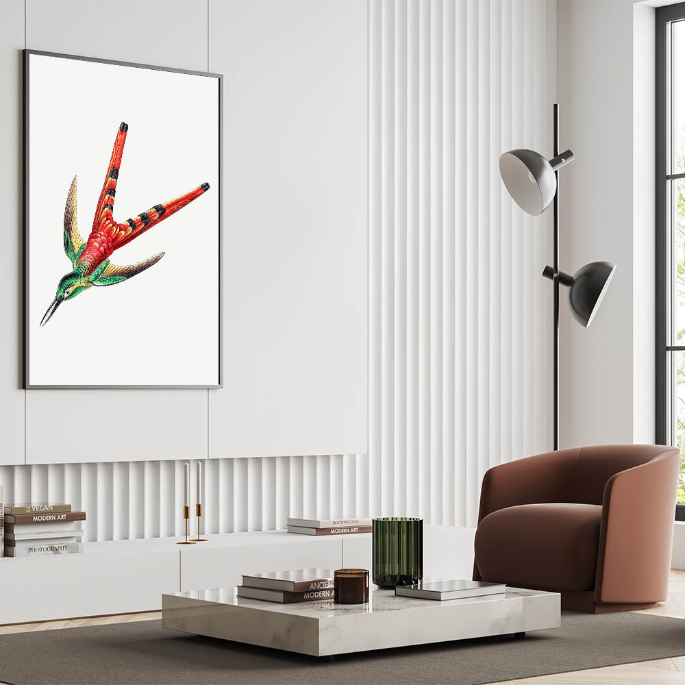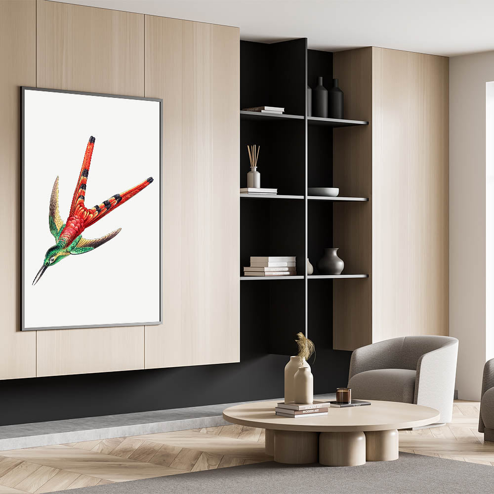 Infuse your space with energy and vibrancy with this Colorful Hummingbird illustration. This striking piece of modern wall art features a meticulously detailed hummingbird in flight, blending bold tones of red, green, yellow, and black. Perfect for nature lovers and those seeking unique modern art, this artwork is a true celebration of color and movement, ideal for modern decor trends.