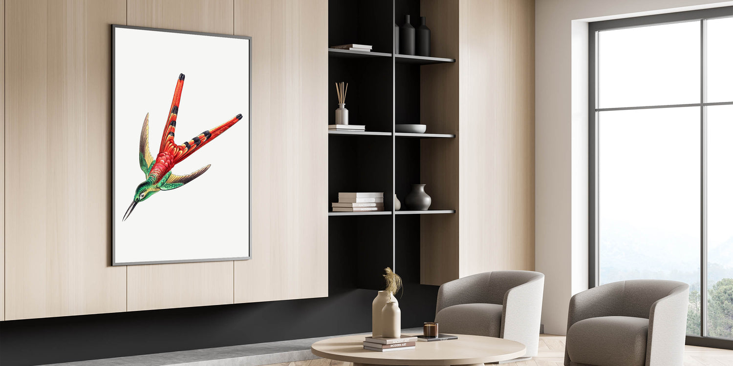 Whether hung in a living room, bedroom, or office, this modern art print adds a sense of joy and liveliness to your decor. Let the trendy home decor appeal of this hummingbird bring nature’s elegance indoors.
