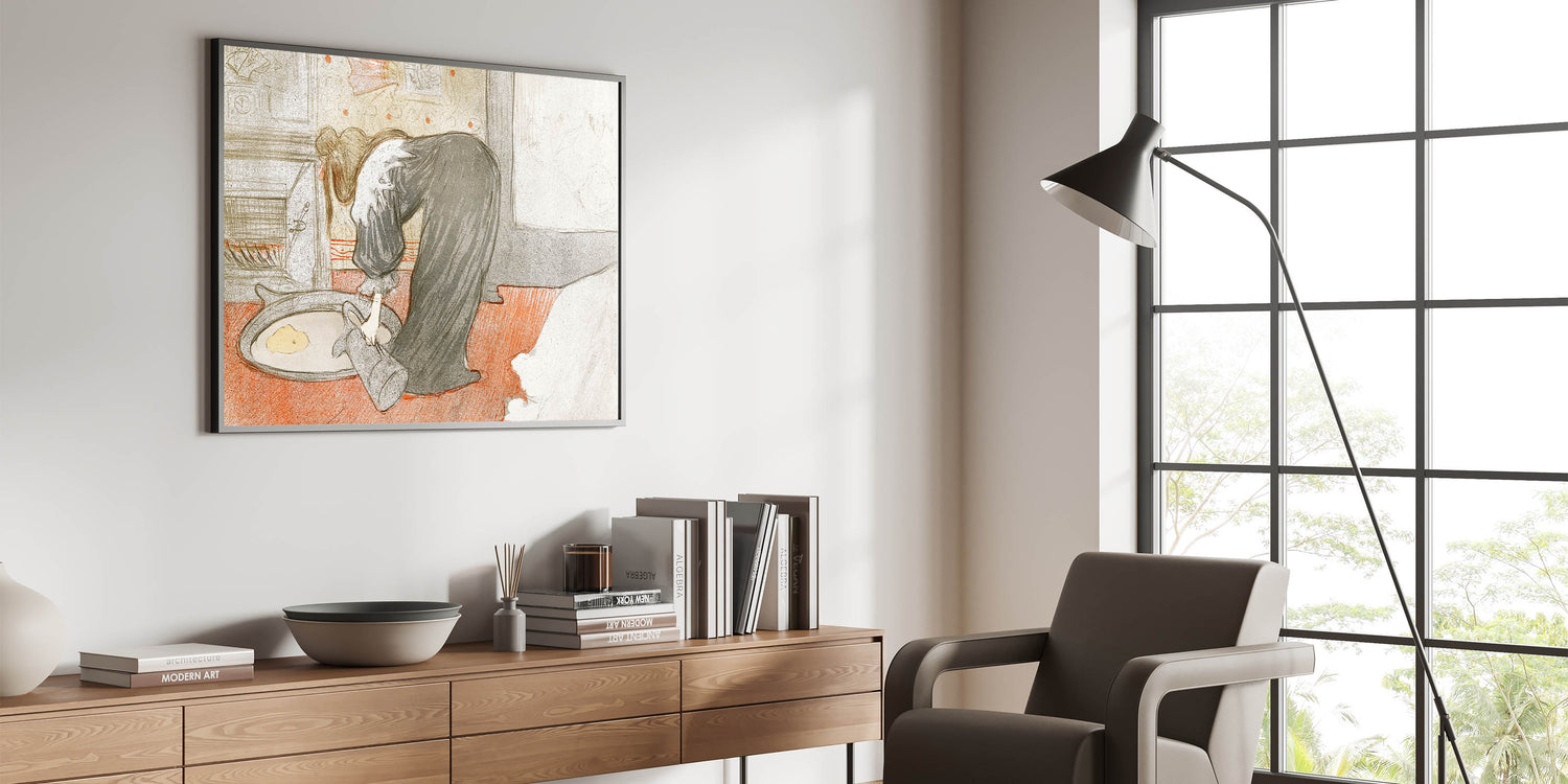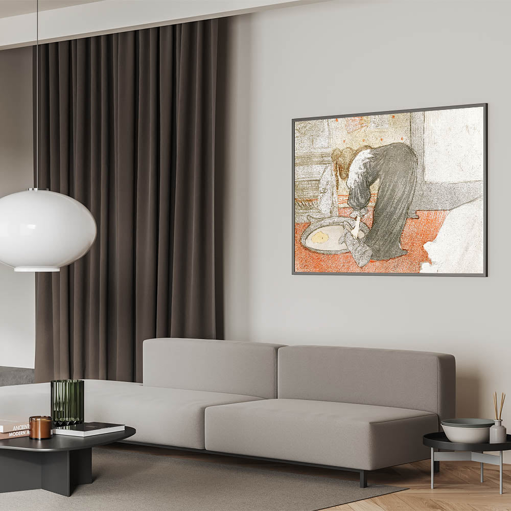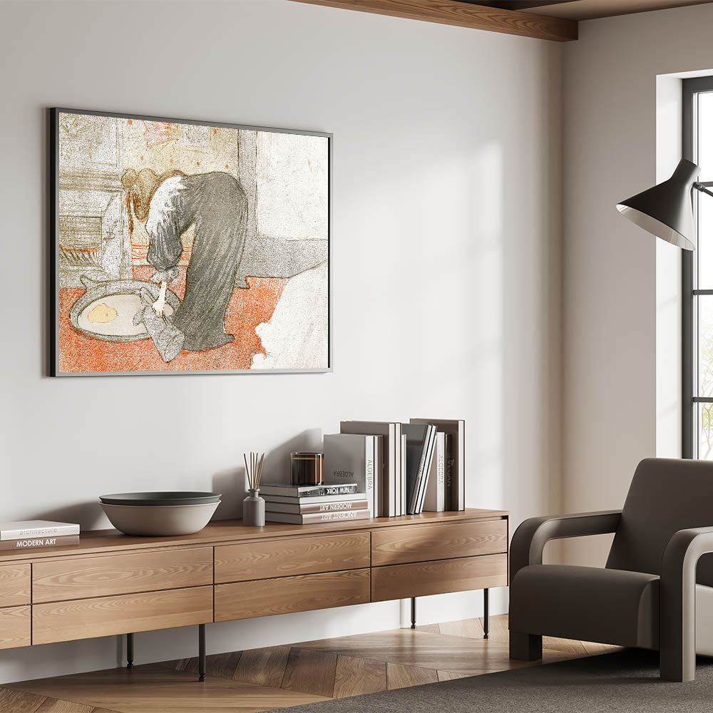 Bring timeless elegance to your space with this Modern Wall Art piece, Femme au Tub (1896) by Henri de Toulouse-Lautrec. This artwork depicts an intimate domestic moment, showcasing the delicate and fluid lines characteristic of Lautrec's style. The subtle interplay of muted grays, warm reds, and soft textures captures the essence of tranquility, making it a perfect choice for Trendy Home Decor.