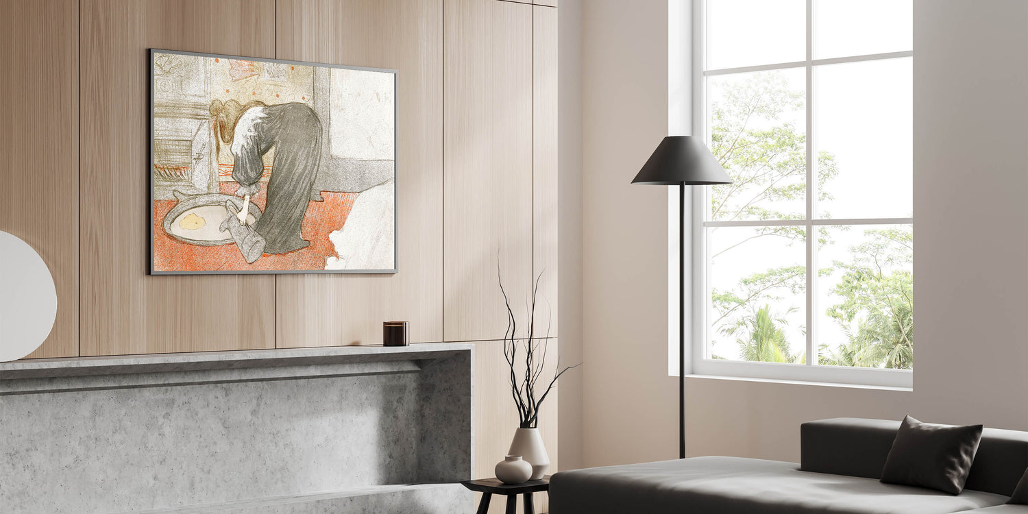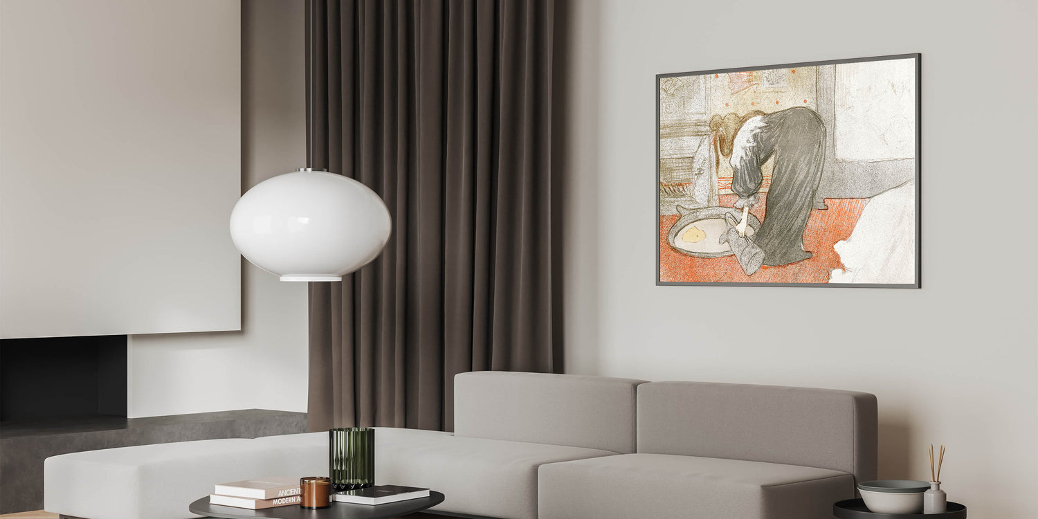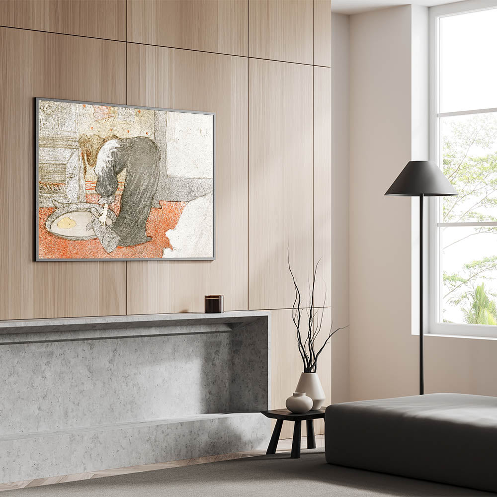 Bring timeless elegance to your space with this Modern Wall Art piece, Femme au Tub (1896) by Henri de Toulouse-Lautrec. This artwork depicts an intimate domestic moment, showcasing the delicate and fluid lines characteristic of Lautrec's style. The subtle interplay of muted grays, warm reds, and soft textures captures the essence of tranquility, making it a perfect choice for Trendy Home Decor.