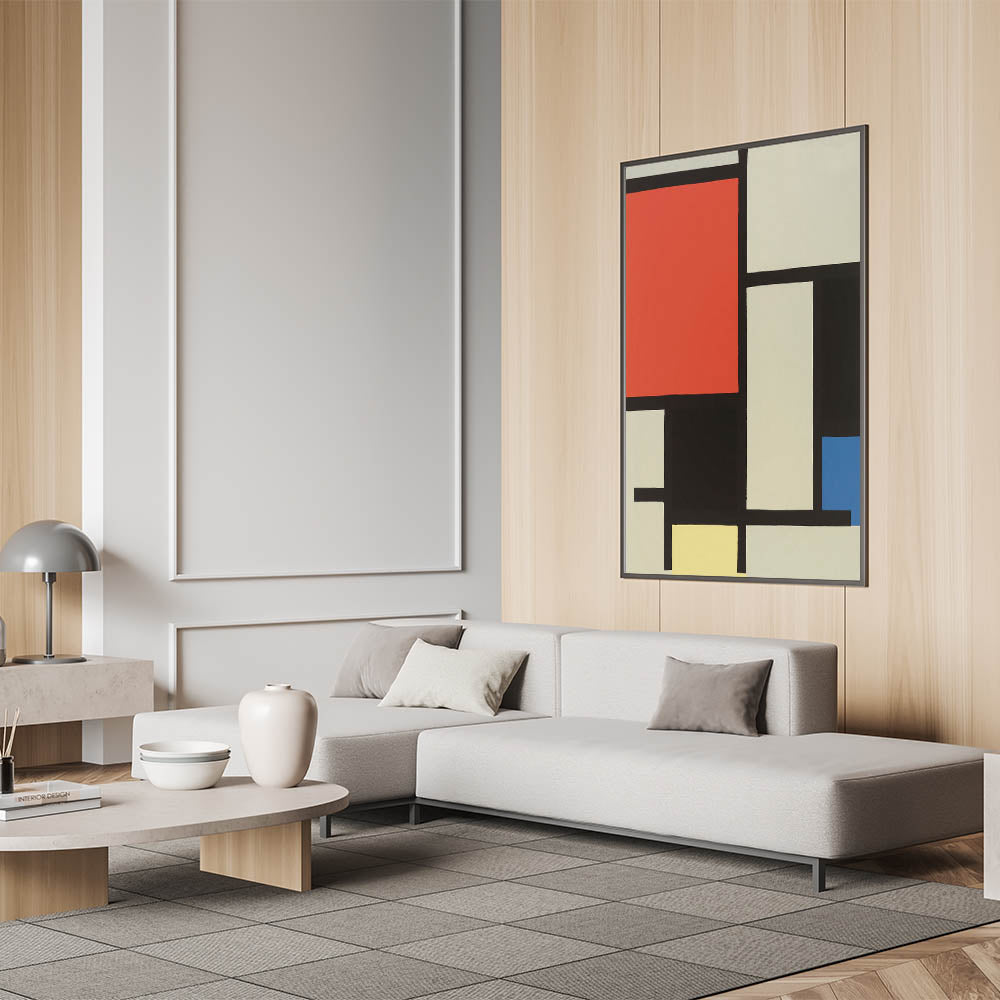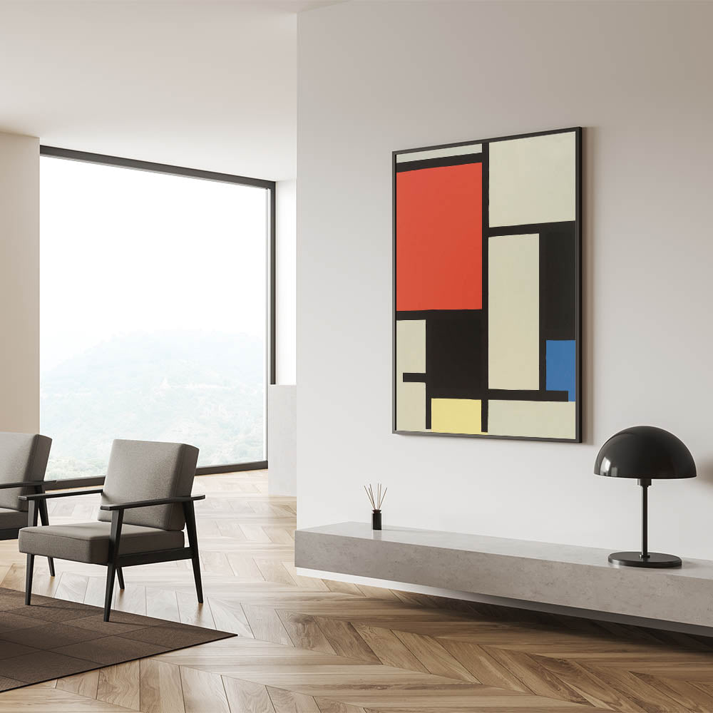 Add a touch of timeless sophistication to your space with Modern Wall Art, featuring Piet Mondrian’s iconic "Composition" from 1921. This bold geometric design harmonizes vibrant red, blue, yellow, and stark black lines with a minimalist aesthetic. A masterpiece of the De Stijl movement, this artwork exemplifies abstract modern art and is perfect for creating a striking focal point in your home or office.