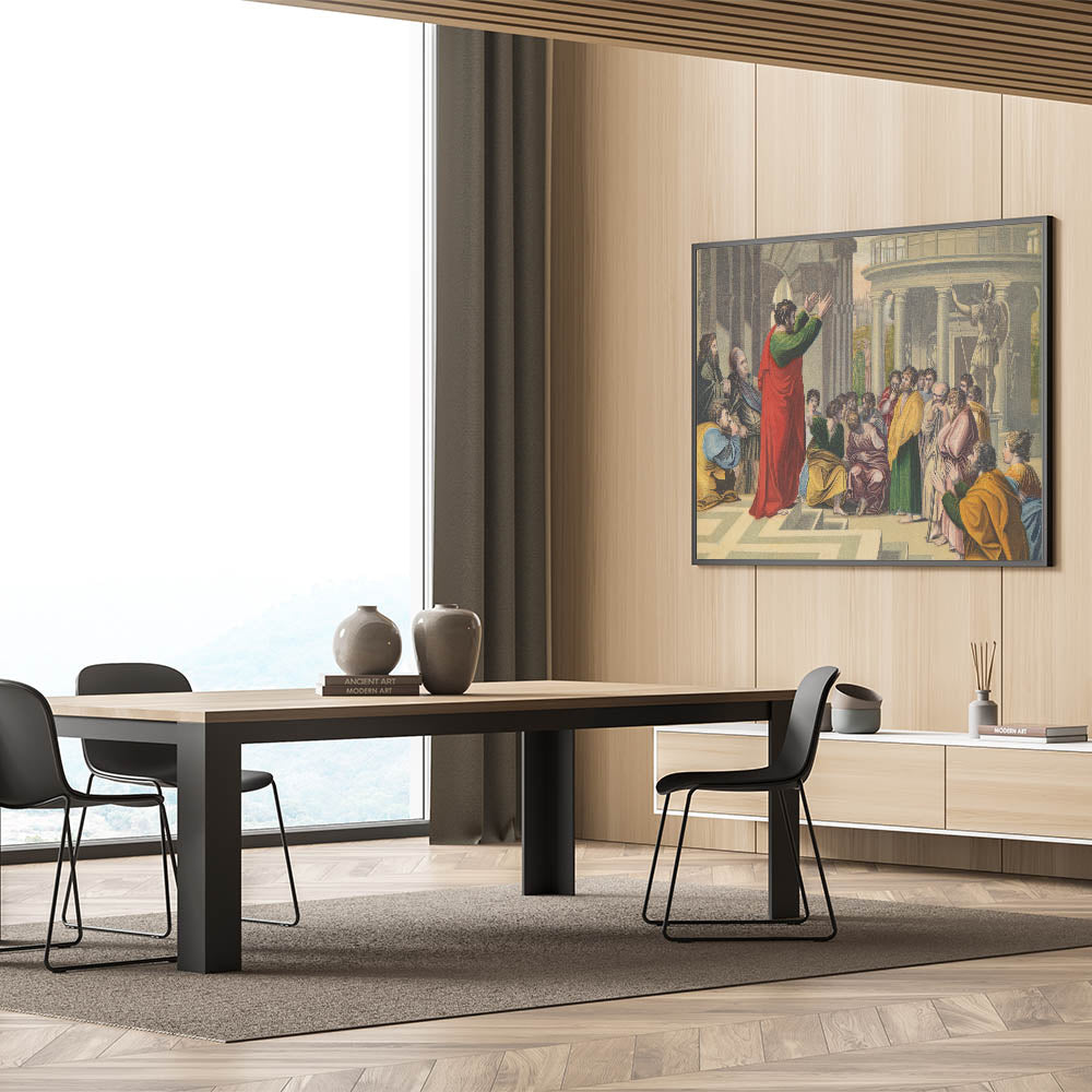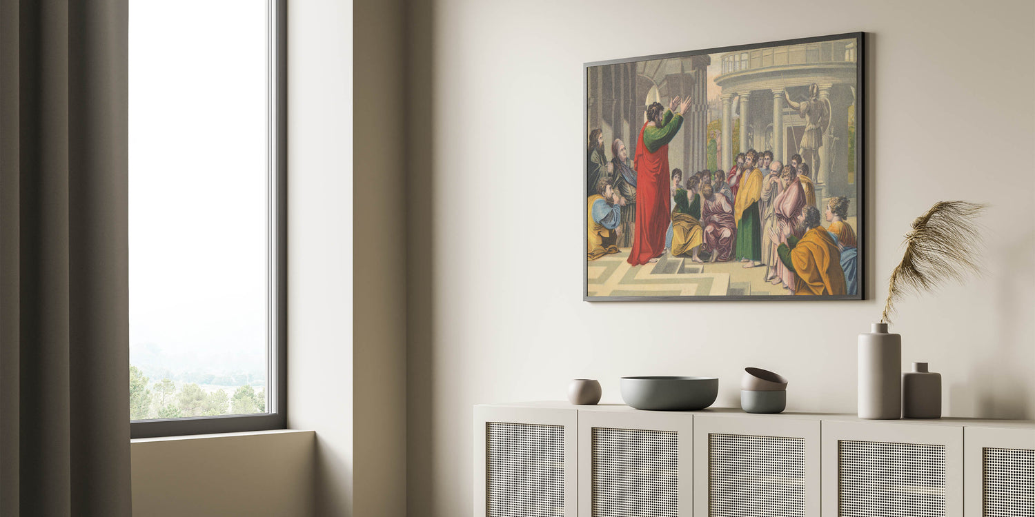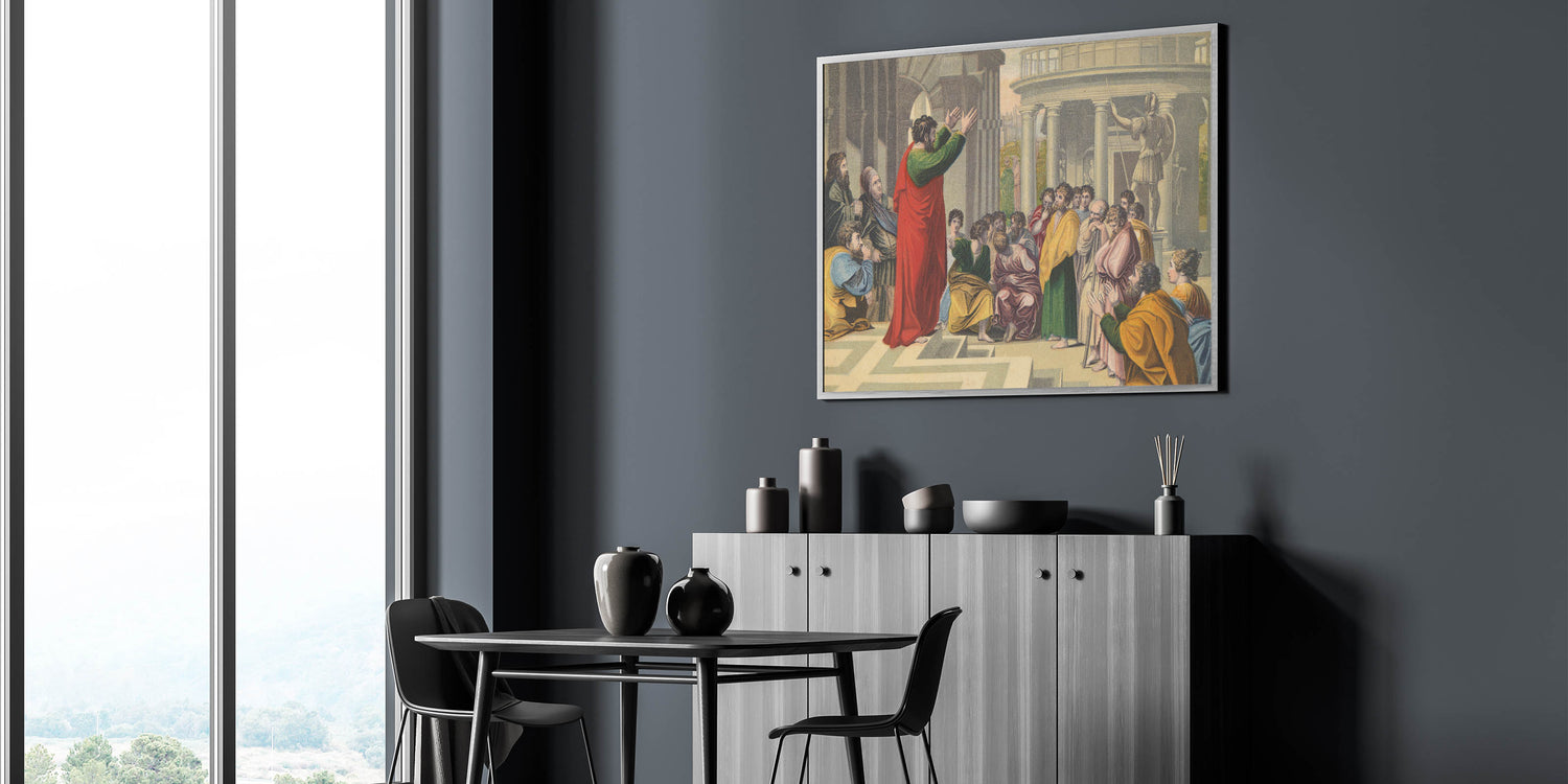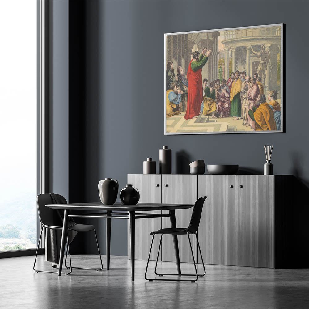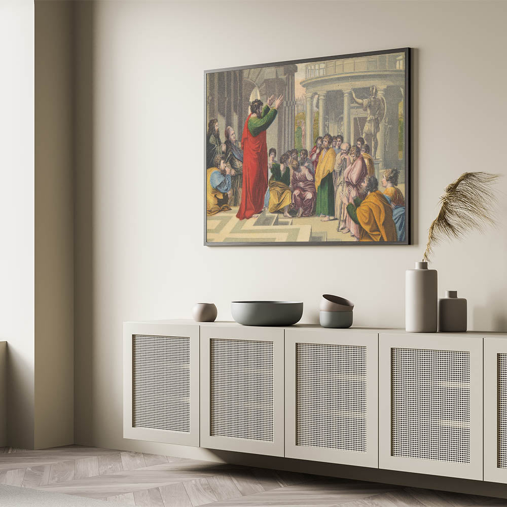 Bring a sense of historical grandeur to your space with this Modern Wall Art piece, St. Paul Preaching in Athens. This intricate artwork portrays the Apostle Paul addressing a captivated audience in a classical setting, surrounded by grand architecture and vivid details. The rich palette of reds, greens, and yellows adds depth and elegance, making it perfect for Trendy Home Decor with a touch of history and spirituality.