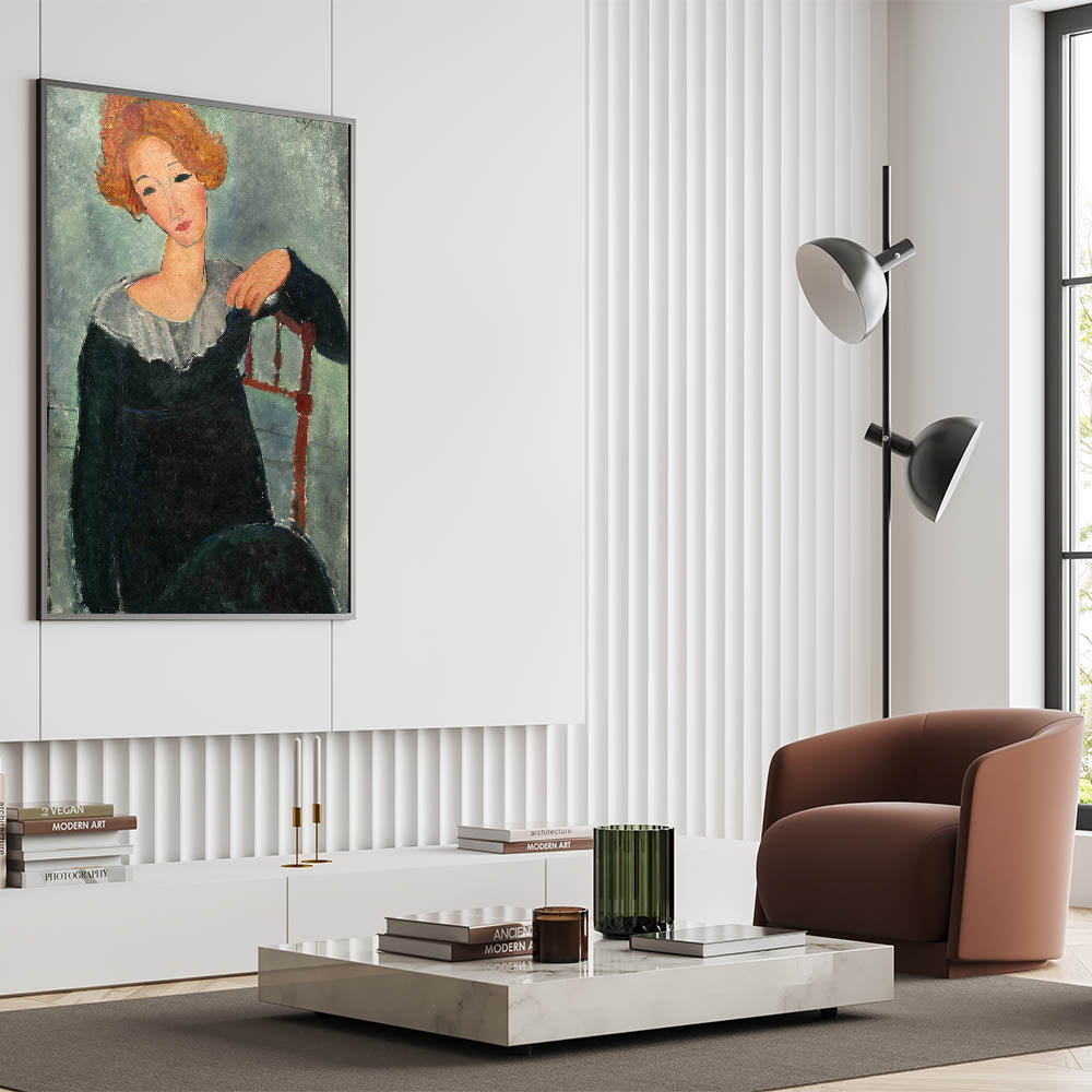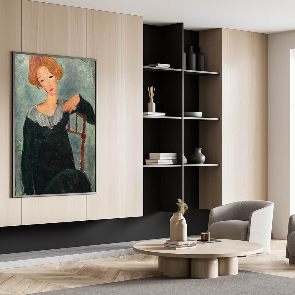 Introduce timeless beauty to your decor with the "Woman with Red Hair" Modern Wall Art. Inspired by Amedeo Modigliani’s 1917 work, this stunning portrait combines bold brushwork, soft hues, and a serene expression to create a captivating visual. The earthy tones and abstract style make it ideal for anyone looking to add stylish wall art with a touch of classic elegance to their space.