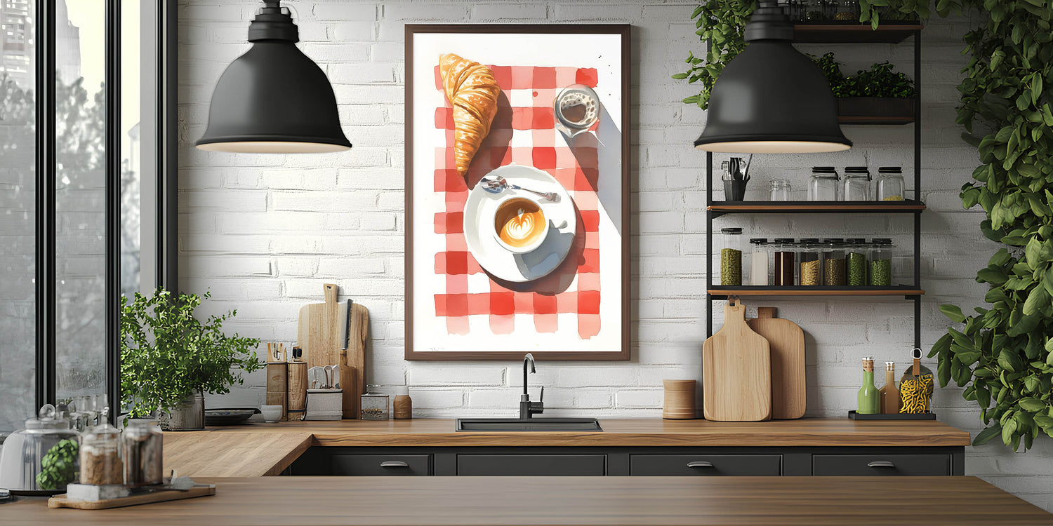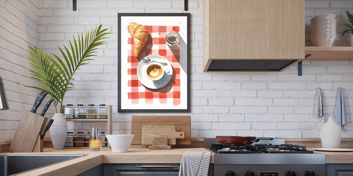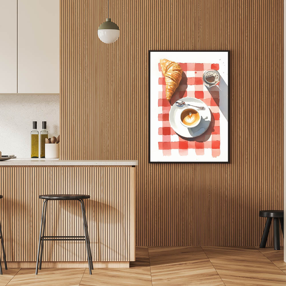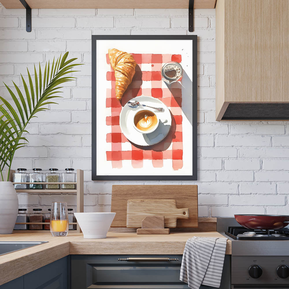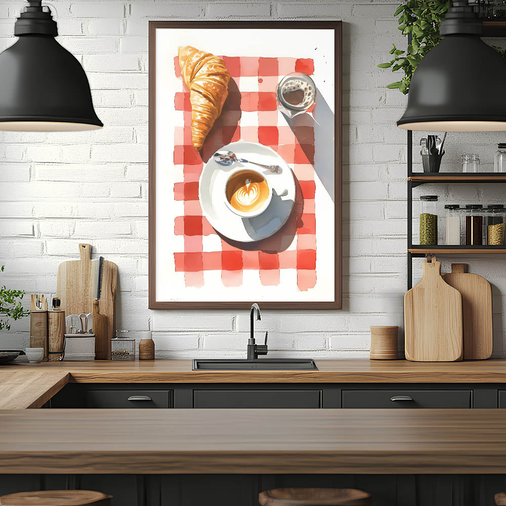 Capture the essence of a perfect French breakfast with this stunning bakery wall art, featuring a beautifully detailed watercolor painting of a golden croissant, a cup of cappuccino, and a checkered red tablecloth. The soft lighting and warm tones create a cozy, inviting atmosphere, making this pastry art print a delightful addition to kitchens, cafés, or bakeries.