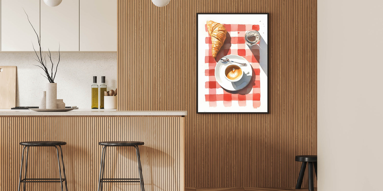 Add a touch of European charm to your space with this bakery art print, celebrating the simple pleasures of a morning coffee and fresh croissant.