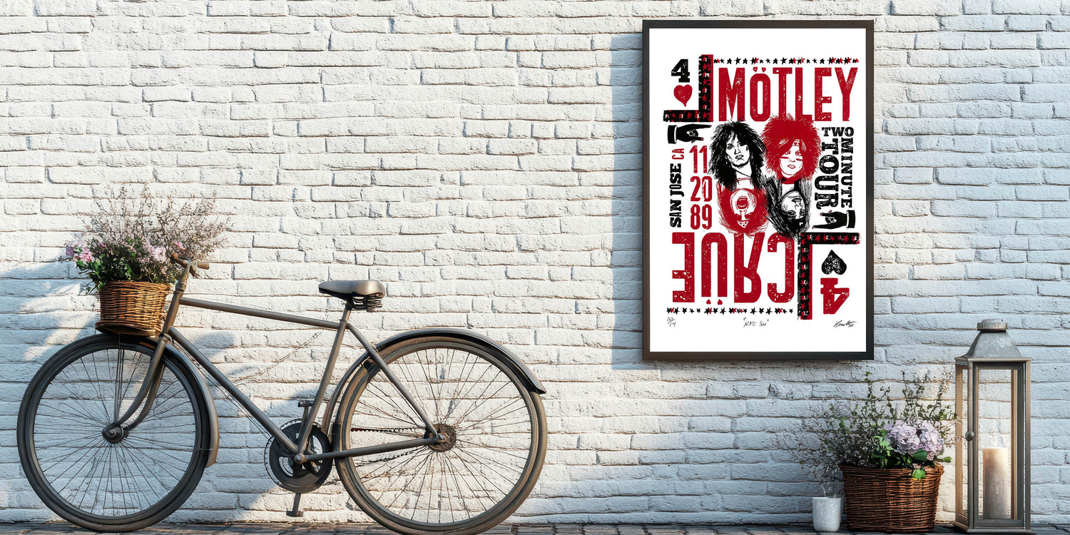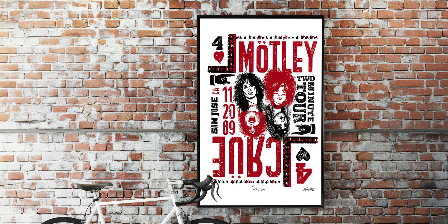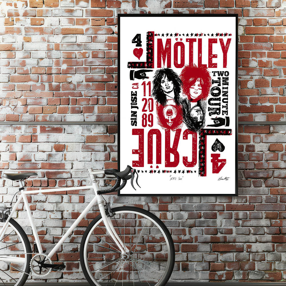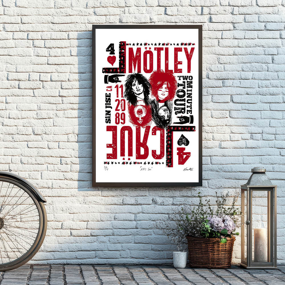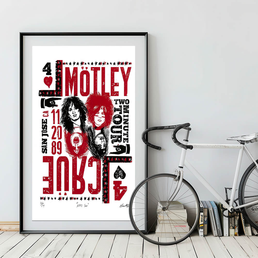 Step back into the iconic 1989 Two Minute Tour with this bold and rebellious Mötley Crüe concert poster. Featuring the band in their classic rock style, the design captures their signature edgy vibe with striking red and black typography, complete with a playful card motif. The vintage aesthetic and bold colors make this piece a must-have for rock enthusiasts and fans of 80s music memorabilia. Whether you're a long-time fan or new to Mötley Crüe's legendary performances, this print adds a punk rock edge to any collection.