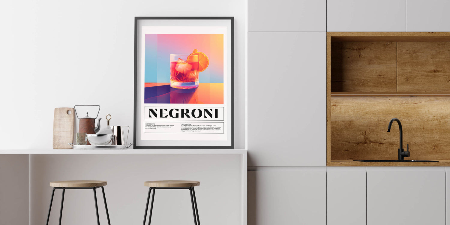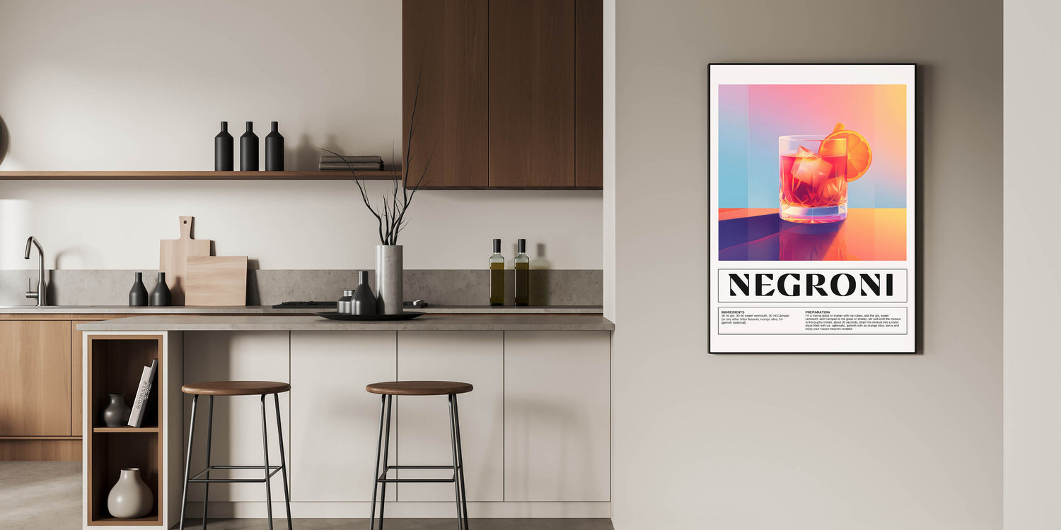 Add a stylish and modern touch to your home bar or kitchen with this Negroni cocktail wall art. Featuring a bold red-orange Negroni illustration, complete with a garnished glass and a striking sunset-inspired background, this beverage wall art is perfect for mixology enthusiasts. Whether you're a fan of classic cocktails or simply love vibrant decor, this bar wall art makes a stunning addition to any space.