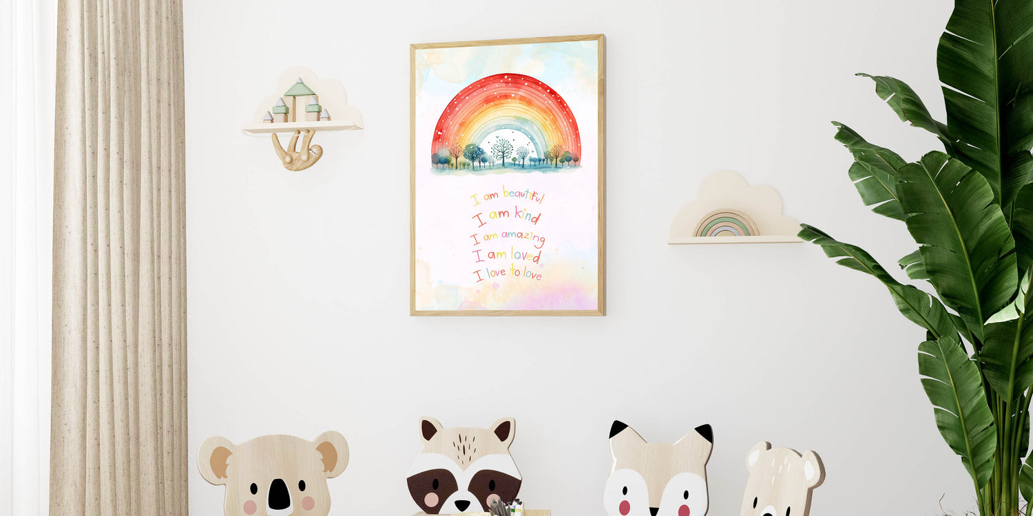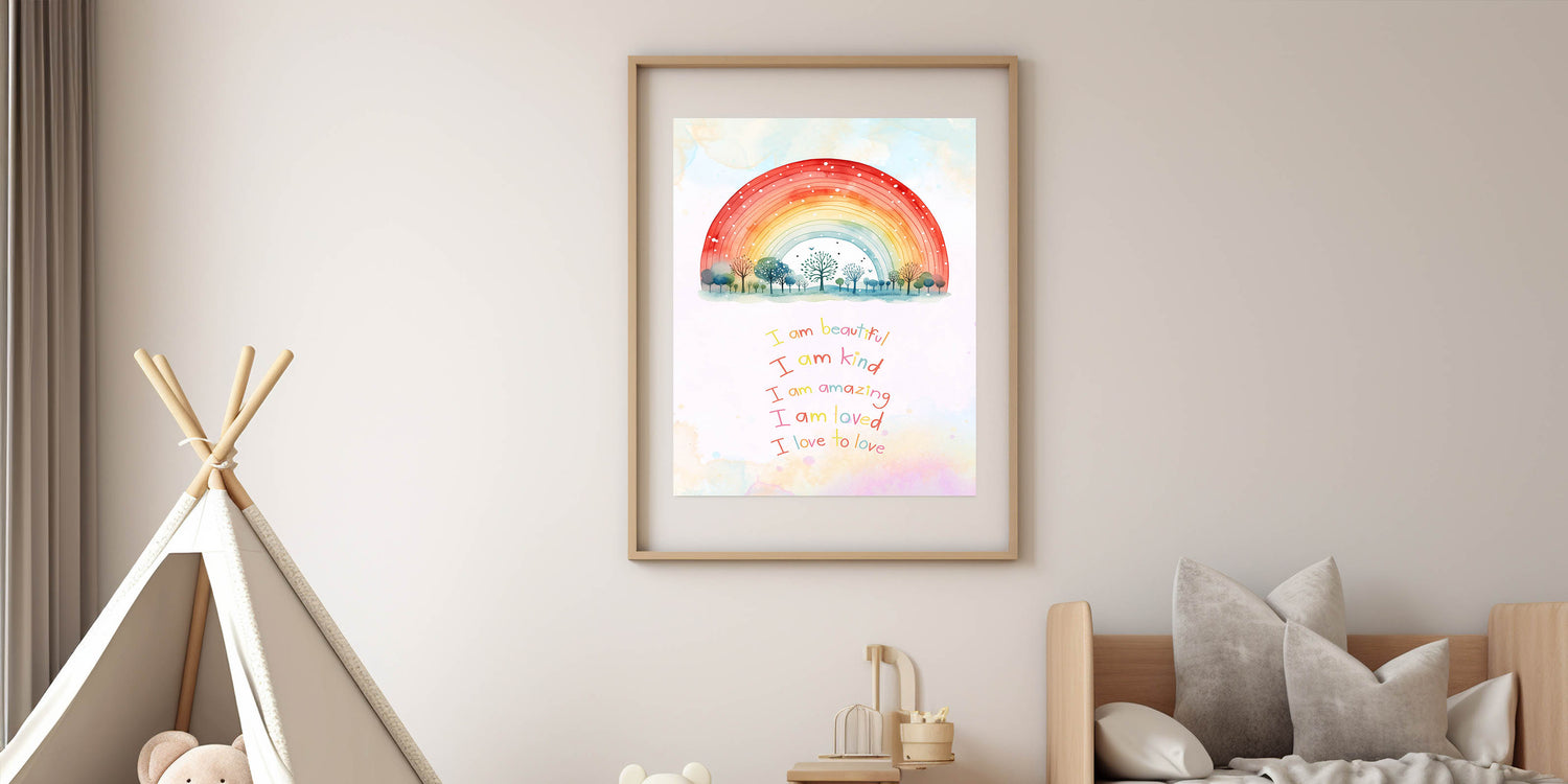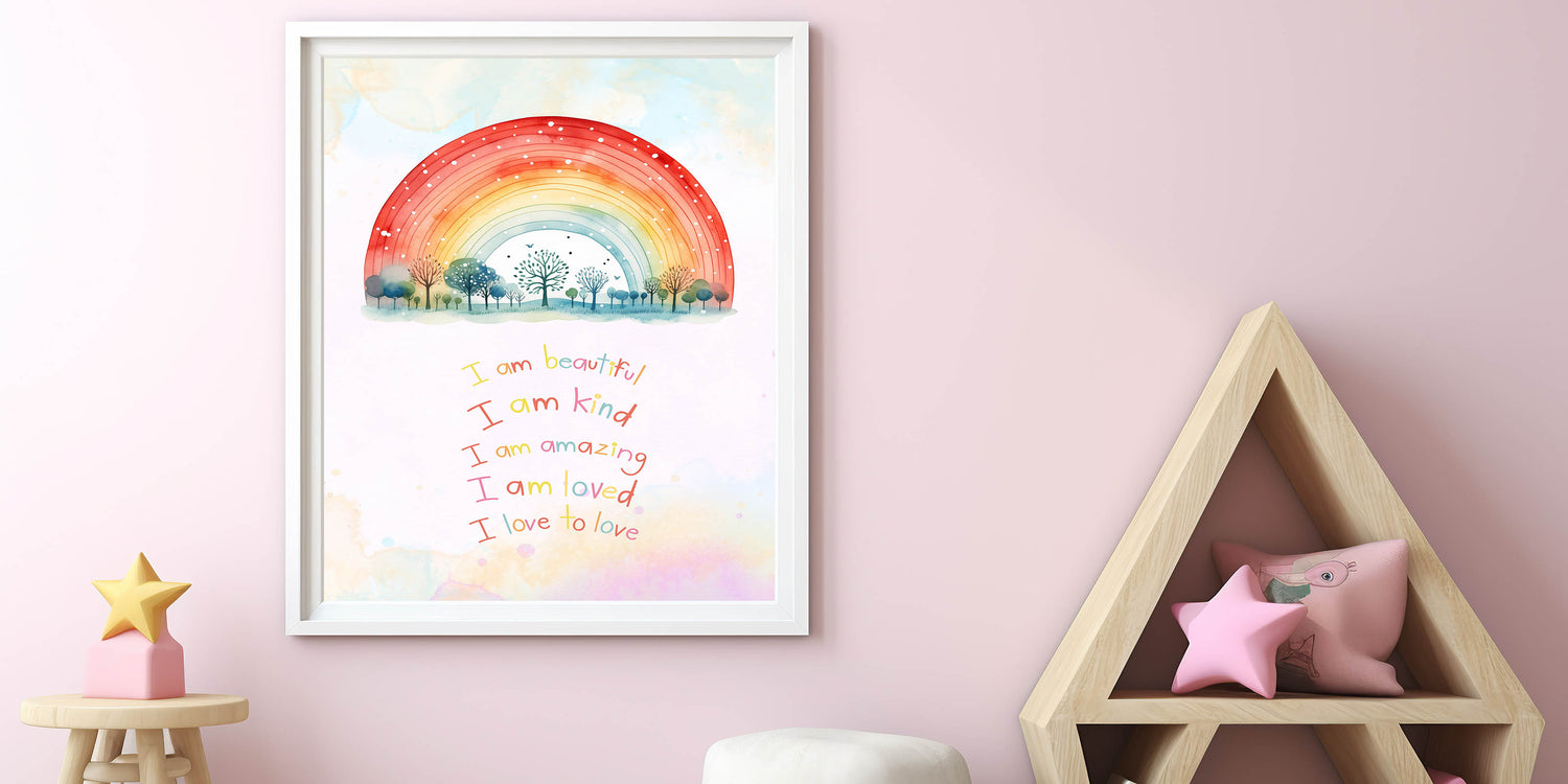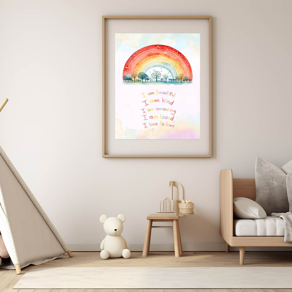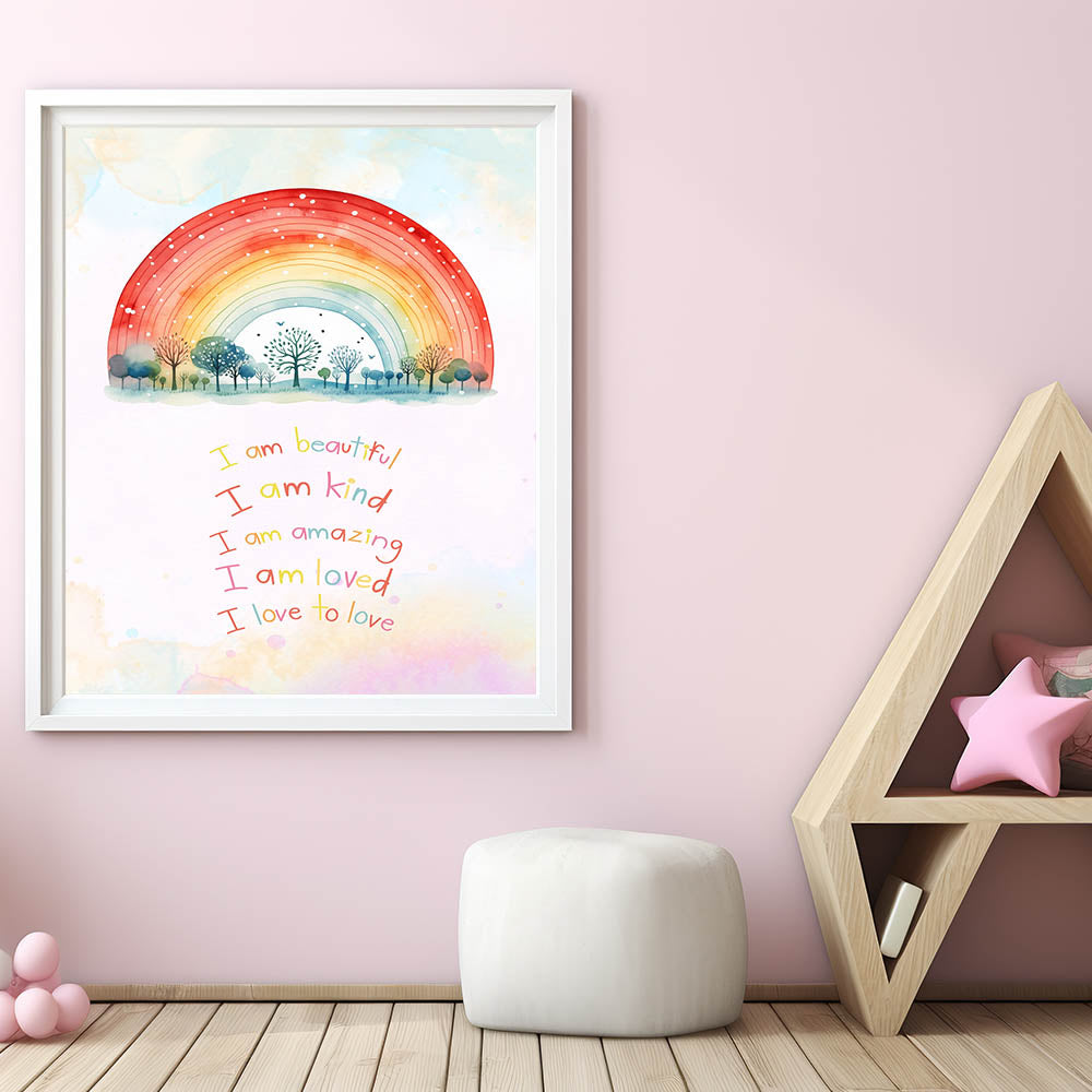 Inspire confidence and positivity in your child’s space with this uplifting watercolor rainbow wall art. Featuring a hand-painted rainbow in warm hues of red, orange, yellow, and blue, this artwork is complemented by a serene tree landscape and motivational affirmations. The whimsical lettering, displaying phrases like "I am beautiful" and "I am loved," encourages self-love and kindness, making it a perfect addition to nurseries, girls' bedrooms, and playrooms.