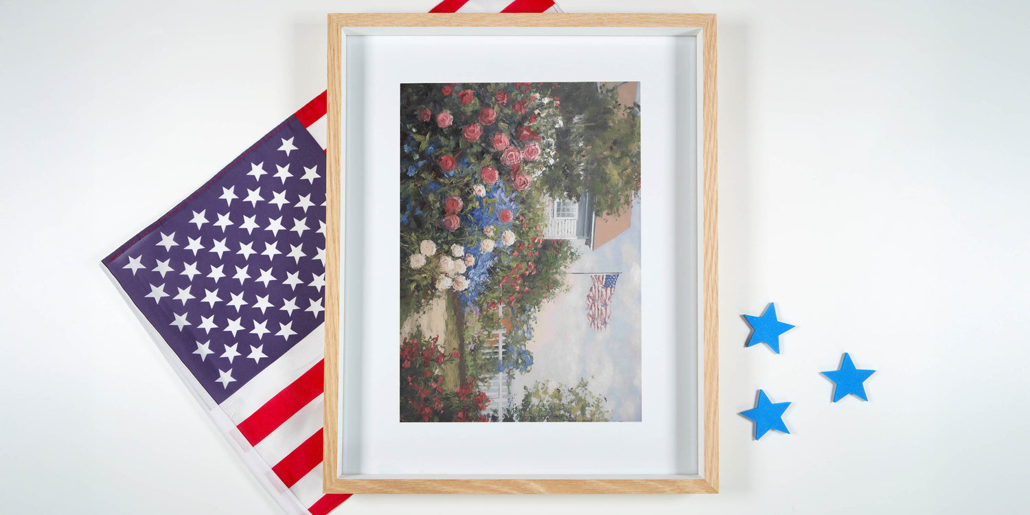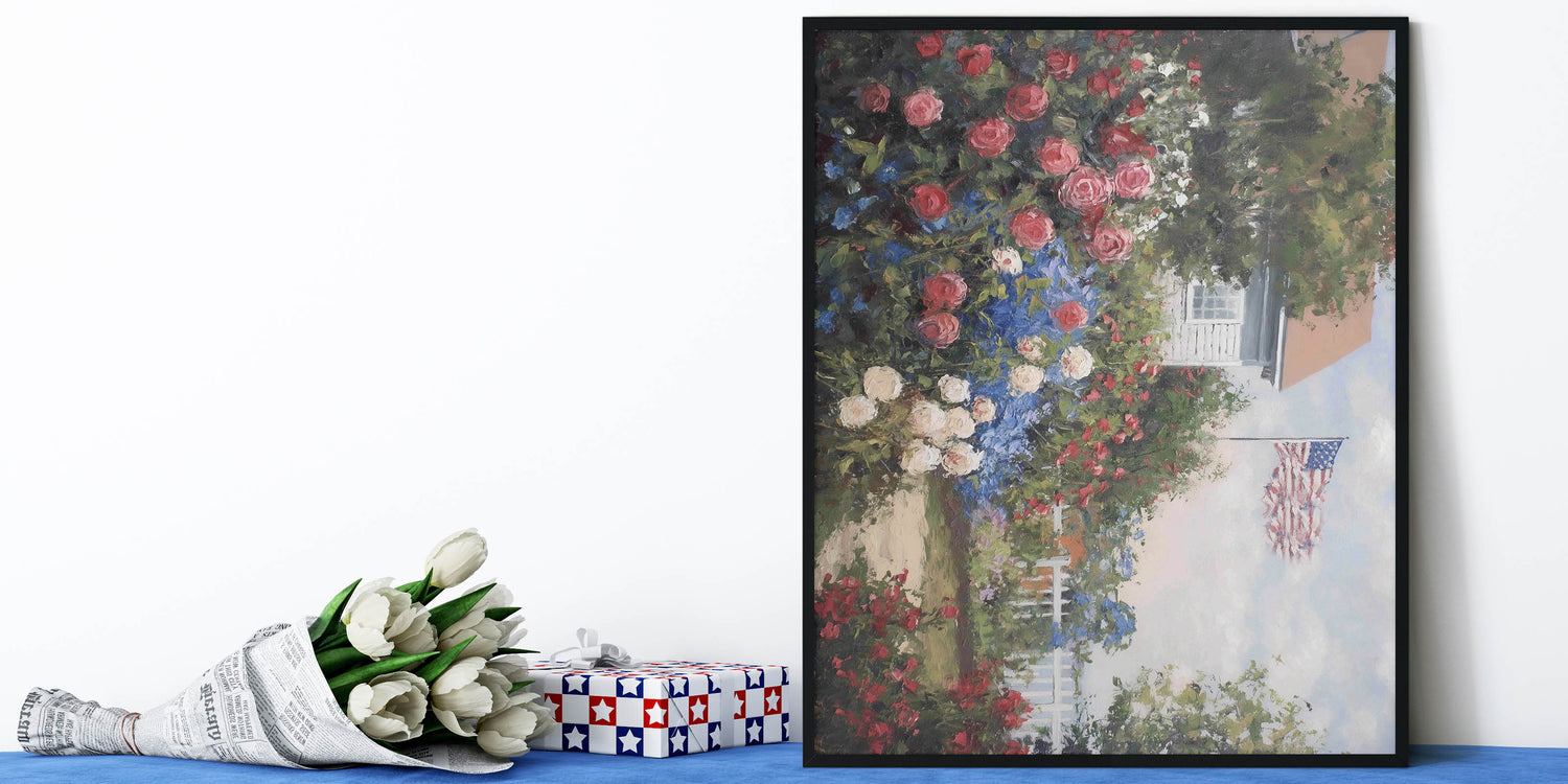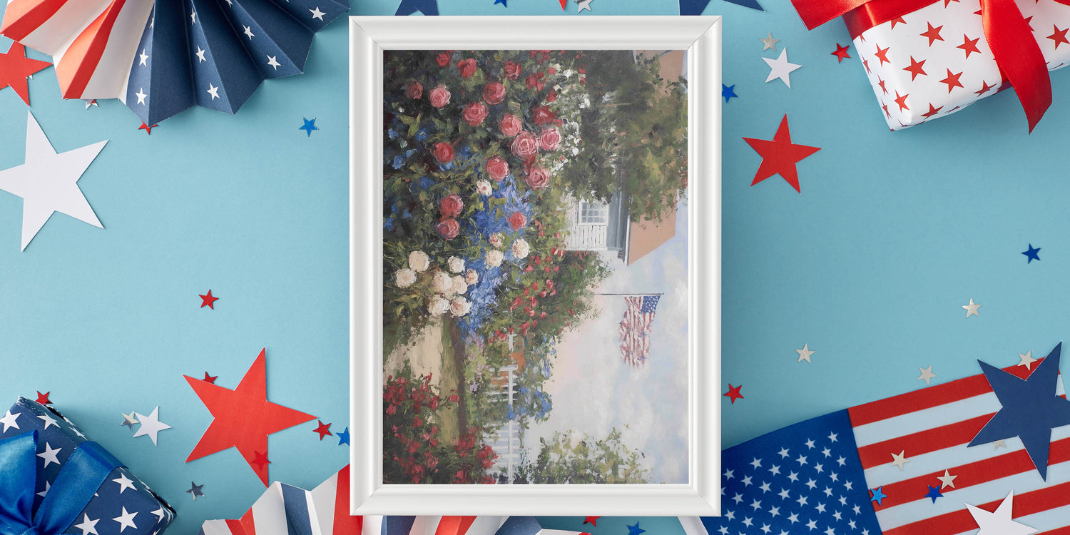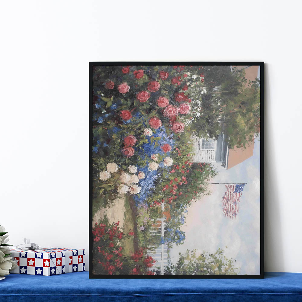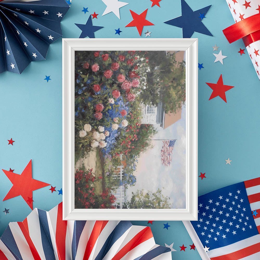 Celebrate the beauty of American patriotism with this stunning 4th of July wall art, featuring a vibrant garden in full bloom with an American flag waving proudly in the background. This captivating scene blends nature with national pride, making it a perfect Independence Day art decor piece for any space.