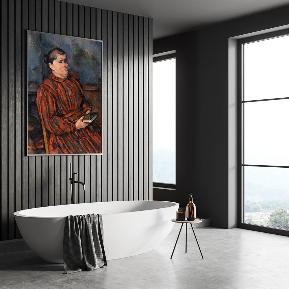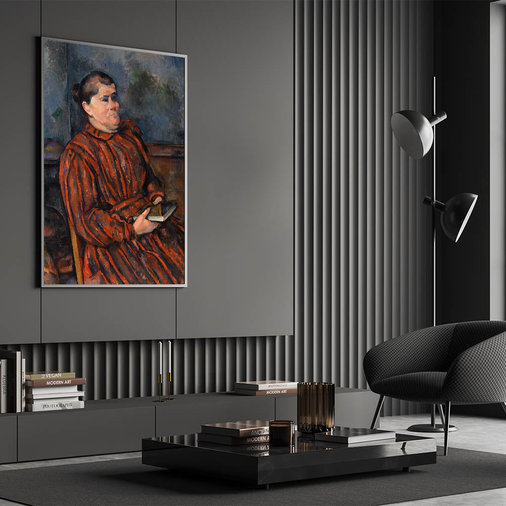 Introduce timeless elegance to your space with Paul Cézanne’s "Portrait of a Woman" (ca. 1898), a masterful depiction of introspection and strength. This striking painting features a woman in a vibrant red dress holding a book, her thoughtful expression captured through Cézanne’s bold brushstrokes and rich textures. The muted background creates a stunning contrast with the vivid red, emphasizing the subject’s presence and personality.