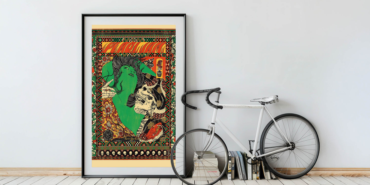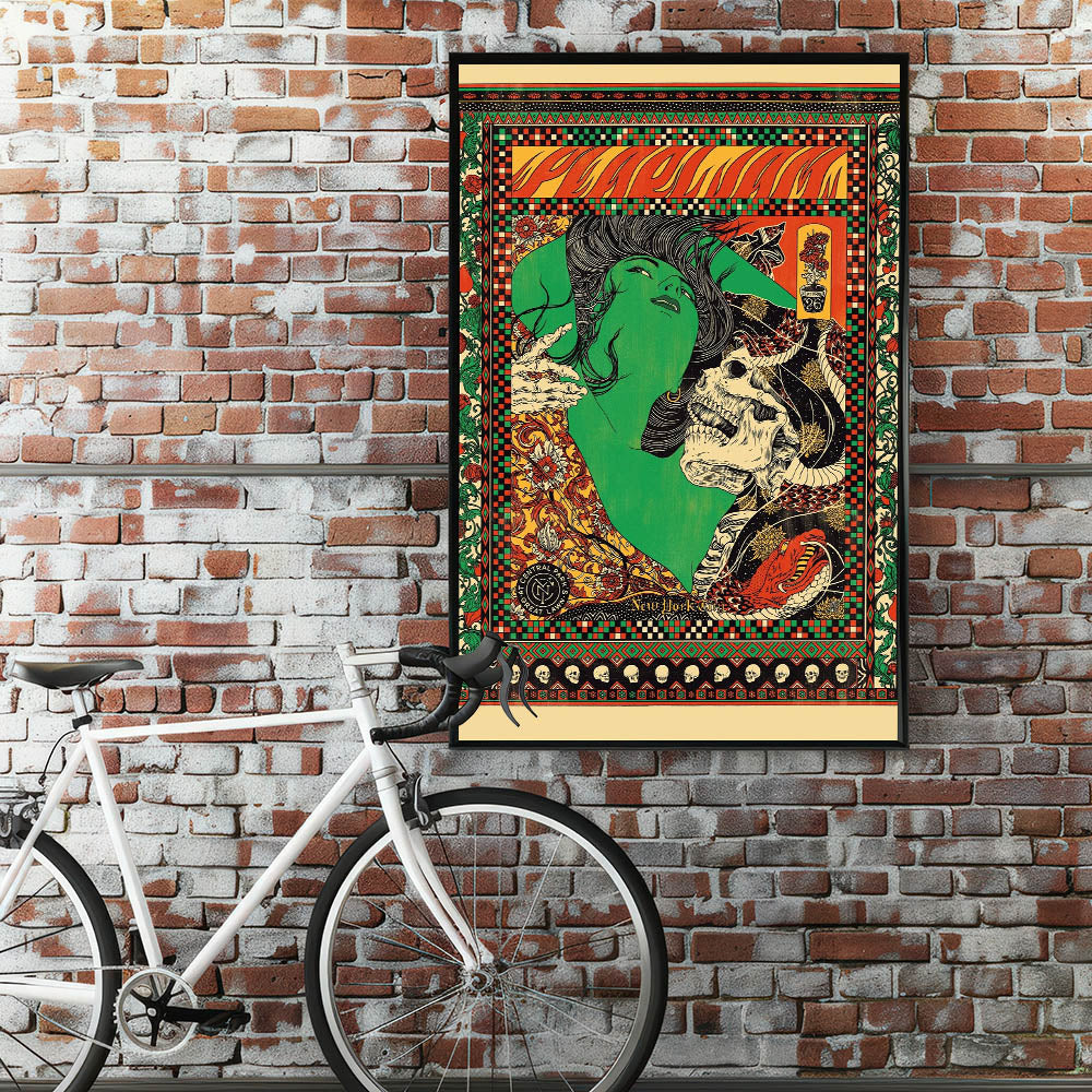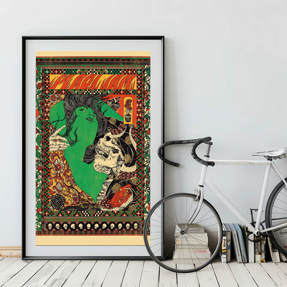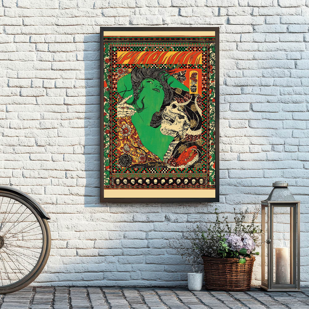 Celebrate Pearl Jam’s iconic energy with this vibrant concert poster from their performance in Central Park, New York, in September. The striking illustration combines intricate patterns and bold imagery, featuring a green woman’s face intertwined with a skull, snakes, and flowers. The fiery reds, greens, and yellows make this poster a standout piece, blending rock culture with vintage psychedelic art. Perfect for fans of Pearl Jam, this poster captures the spirit of live music and the dynamic energy of the band’s performance.