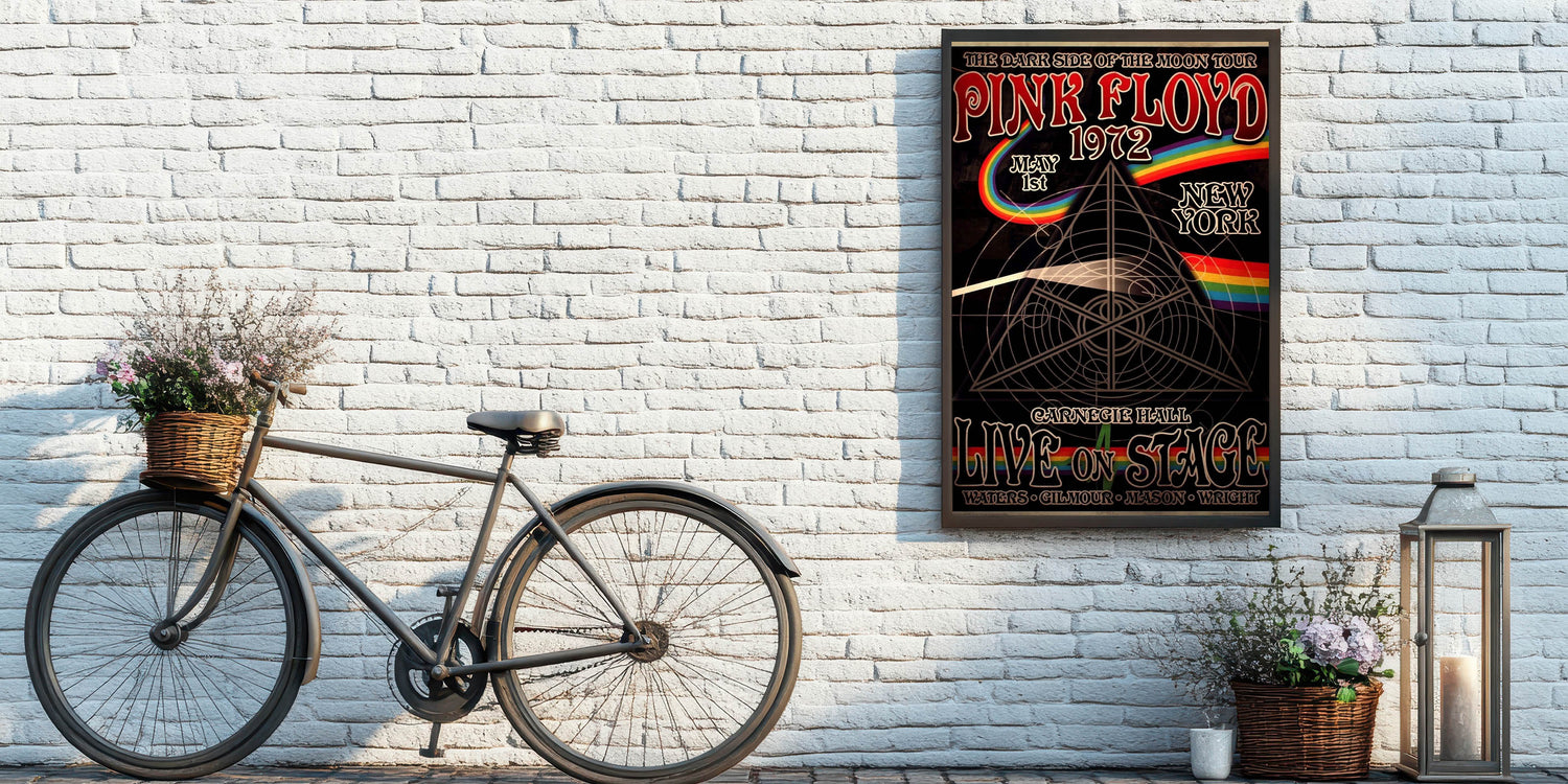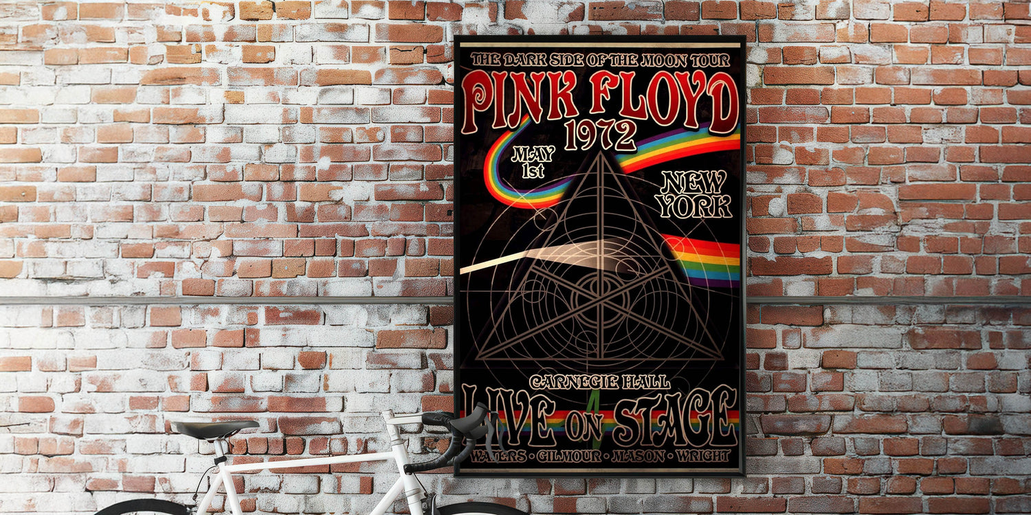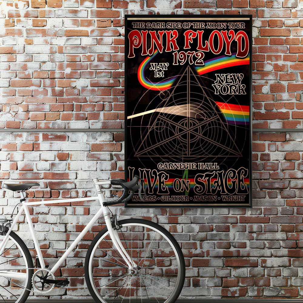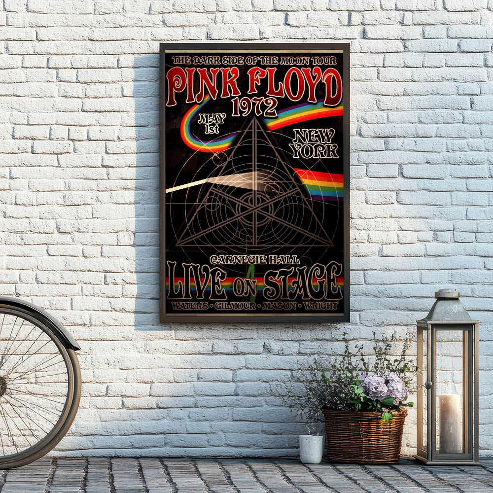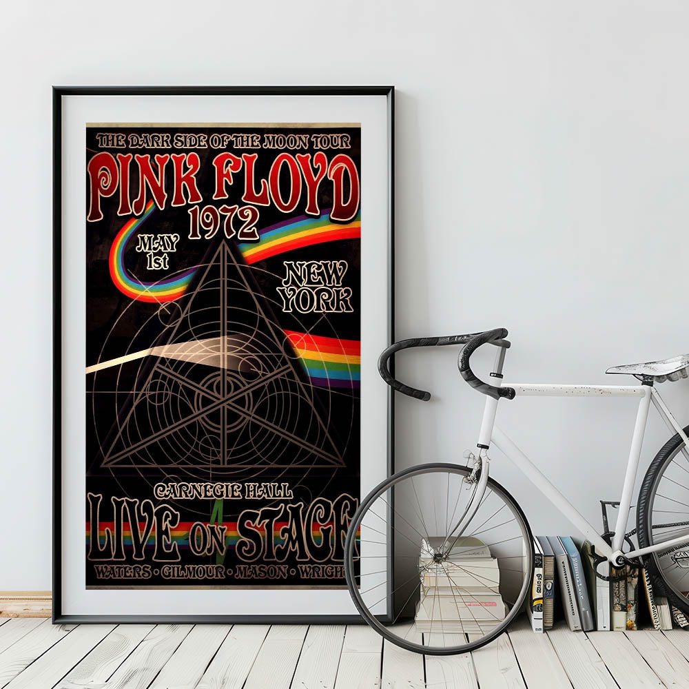 Relive the iconic "Dark Side of the Moon" era with this retro Pink Floyd 1972 poster, featuring the legendary Carnegie Hall performance. This vintage design showcases the timeless artwork of Pink Floyd's live shows, complete with the iconic rainbow prism and intricate geometric patterns. Whether you're a long-time fan or new to the band's music, this art piece is perfect for adding a touch of classic retro style to any room.