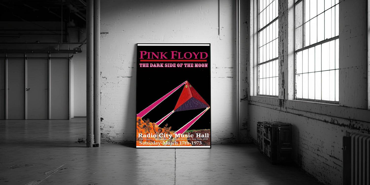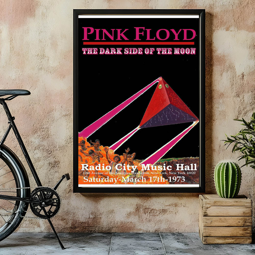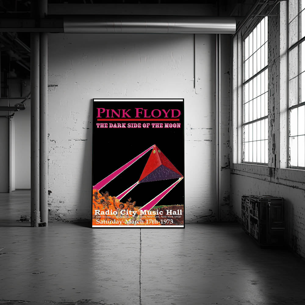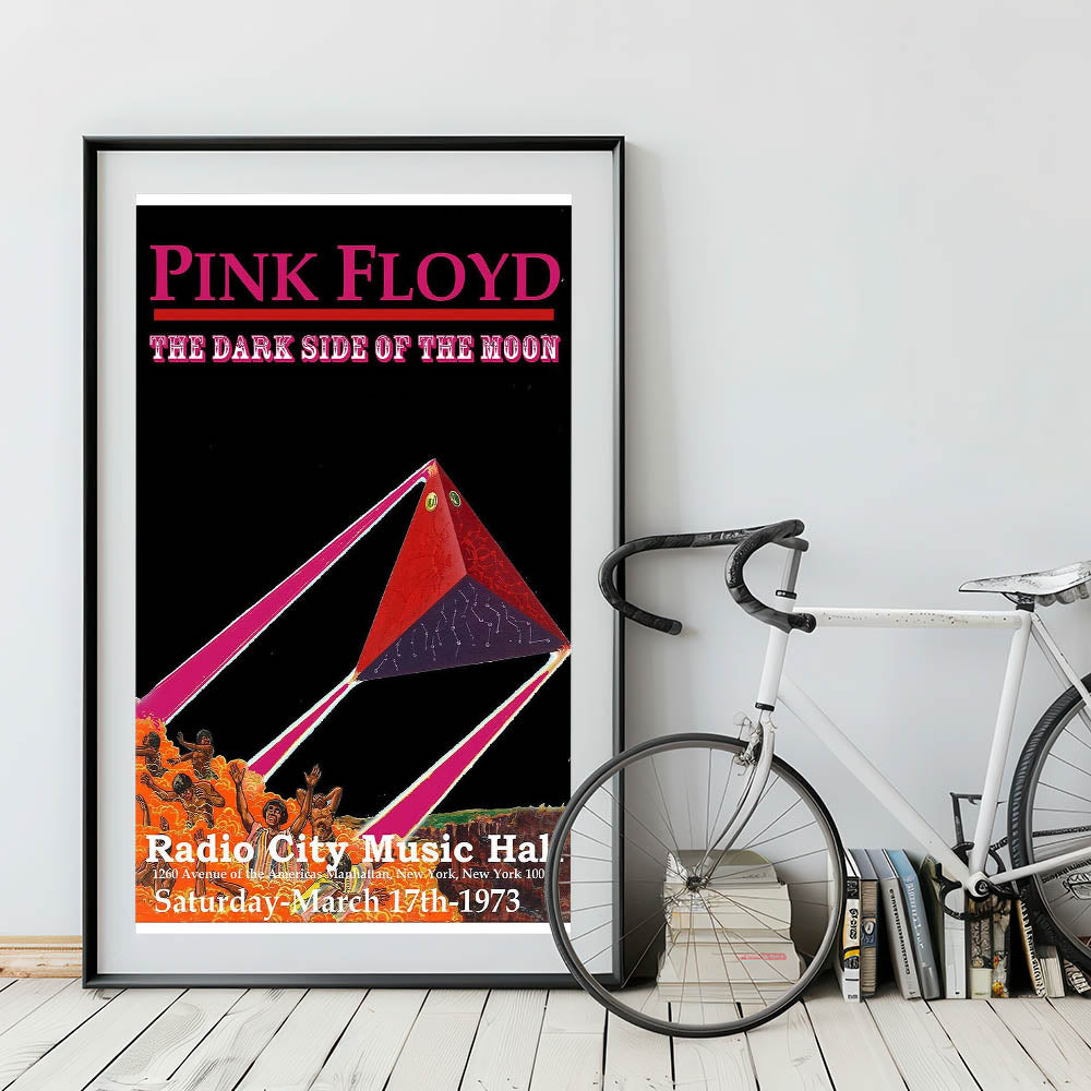 - Vintage Pink Floyd poster featuring the "Dark Side of the Moon" artwork from the 1973 Radio City Music Hall performance.