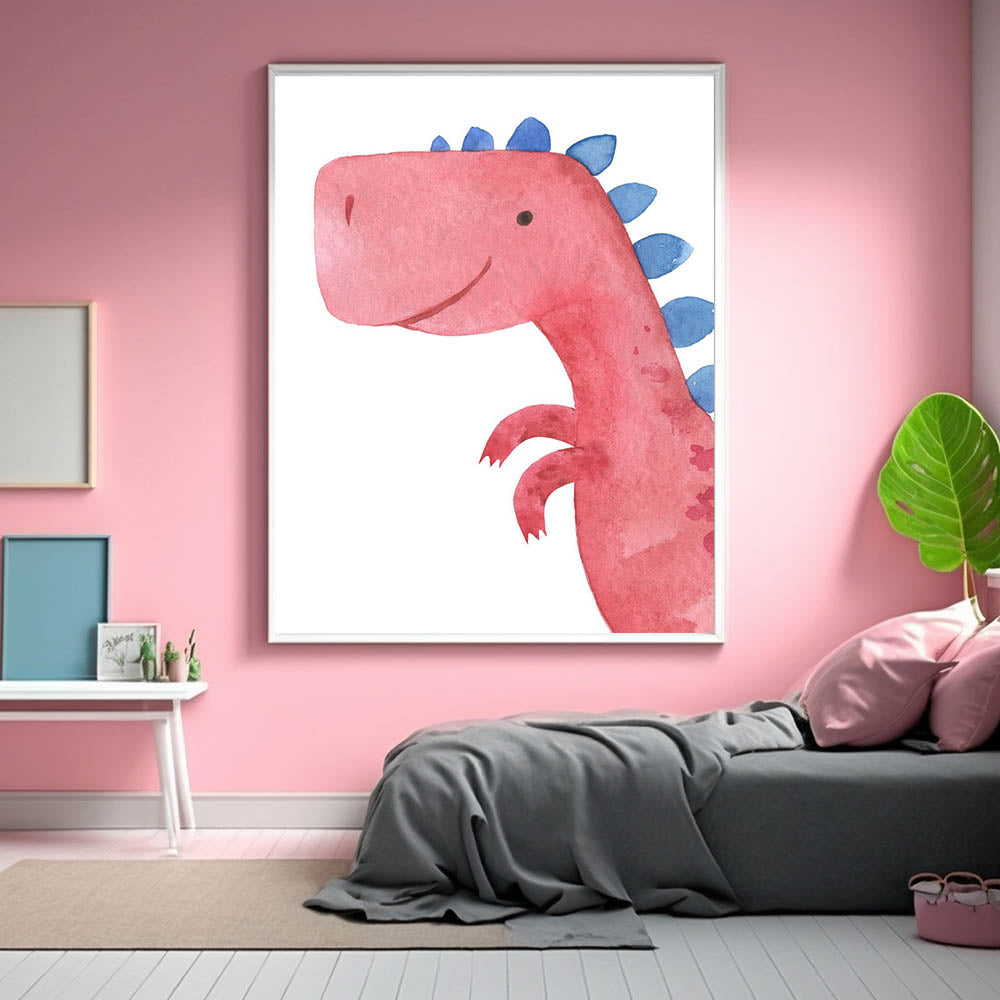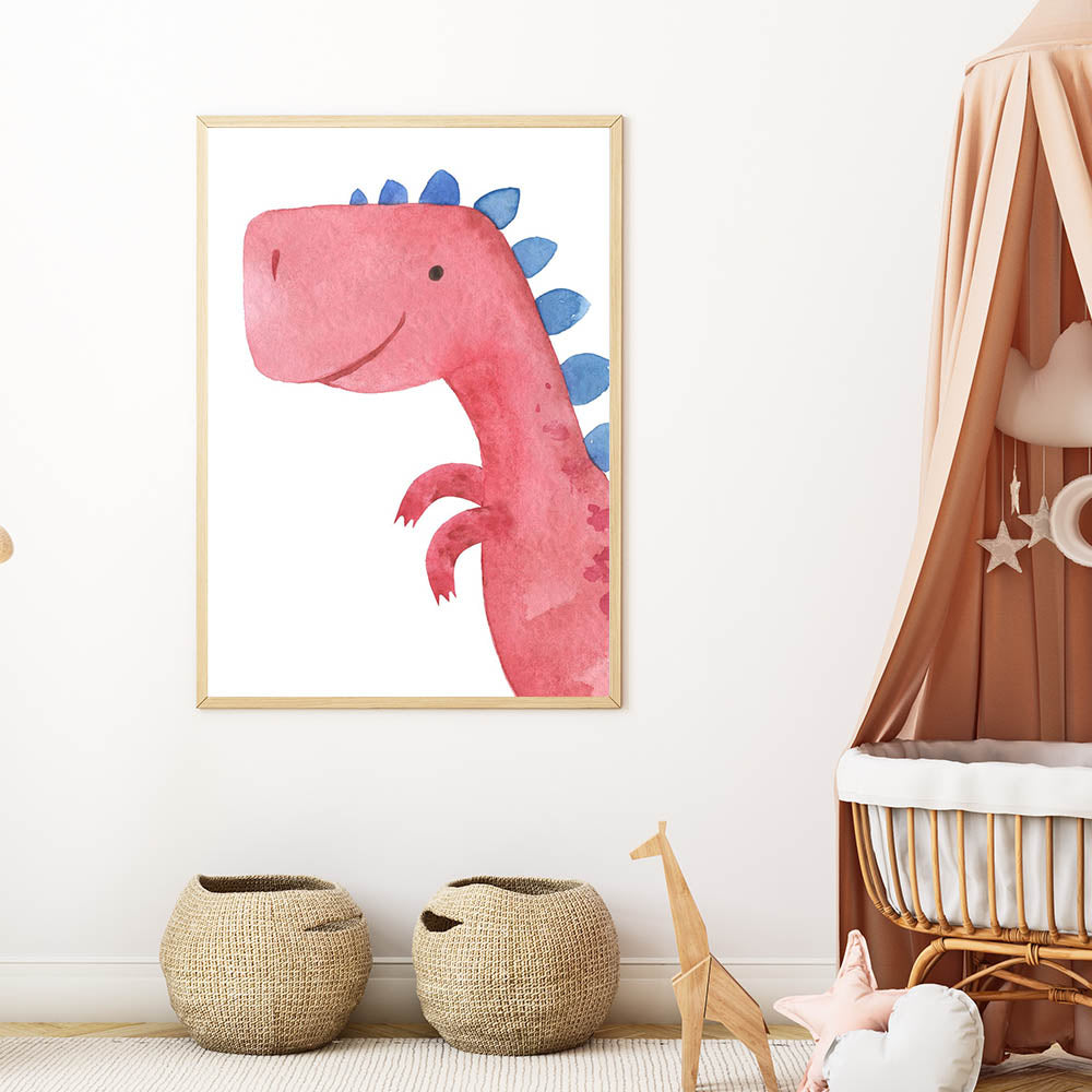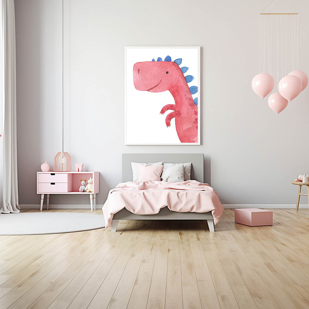 Bring adventure and charm to your child's space with this playful red dinosaur wall art. Featuring a smiling watercolor dinosaur with blue spines, this artwork adds a fun and cheerful touch to any girls' bedroom, nursery, or playroom. The soft red and blue hues create a warm yet lively feel, making it a wonderful choice for children’s wall decor.