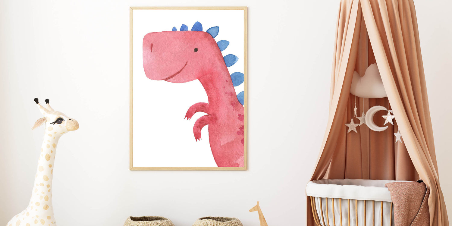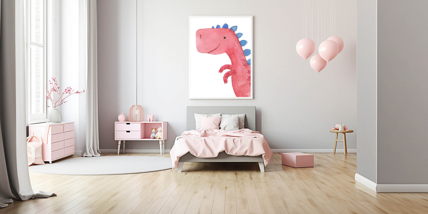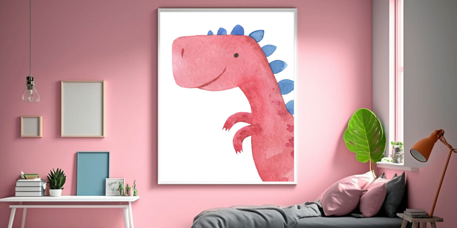 Bring adventure and charm to your child's space with this playful red dinosaur wall art. Featuring a smiling watercolor dinosaur with blue spines, this artwork adds a fun and cheerful touch to any girls' bedroom, nursery, or playroom. The soft red and blue hues create a warm yet lively feel, making it a wonderful choice for children’s wall decor.