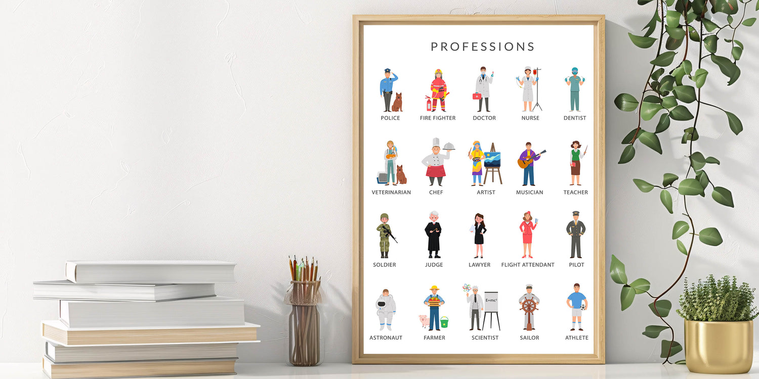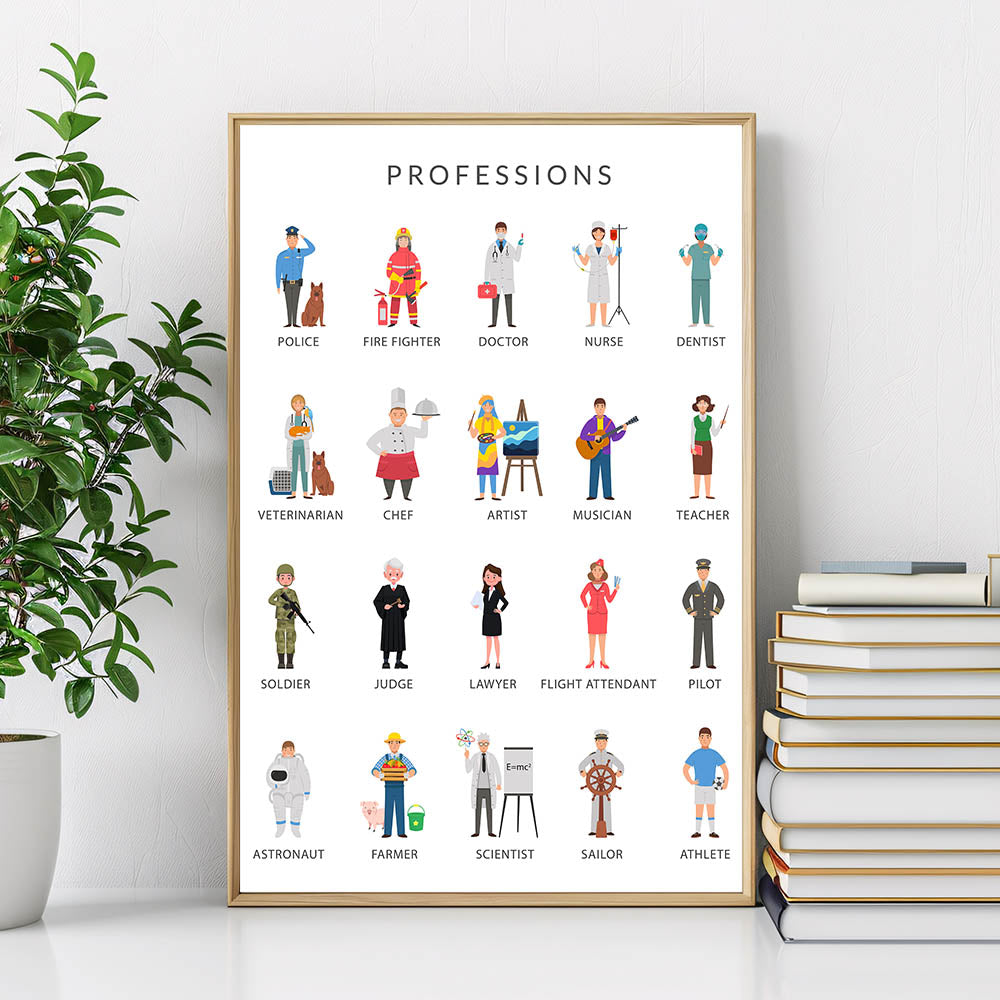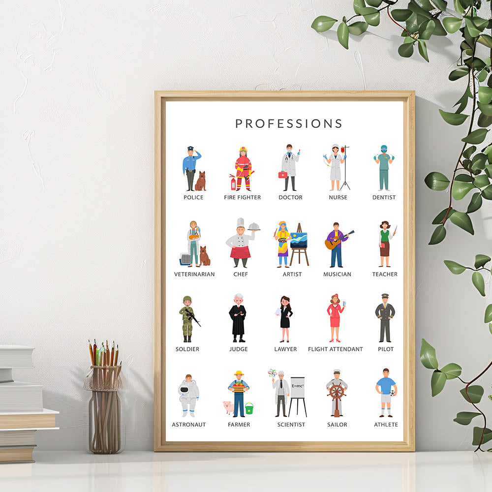 Encourage curiosity and inspire young minds with this professions-themed learning poster for kids. Whether for a homeschool setup, preschool classroom, or playroom, this educational nursery decor makes career learning fun and interactive.