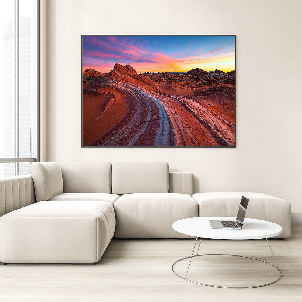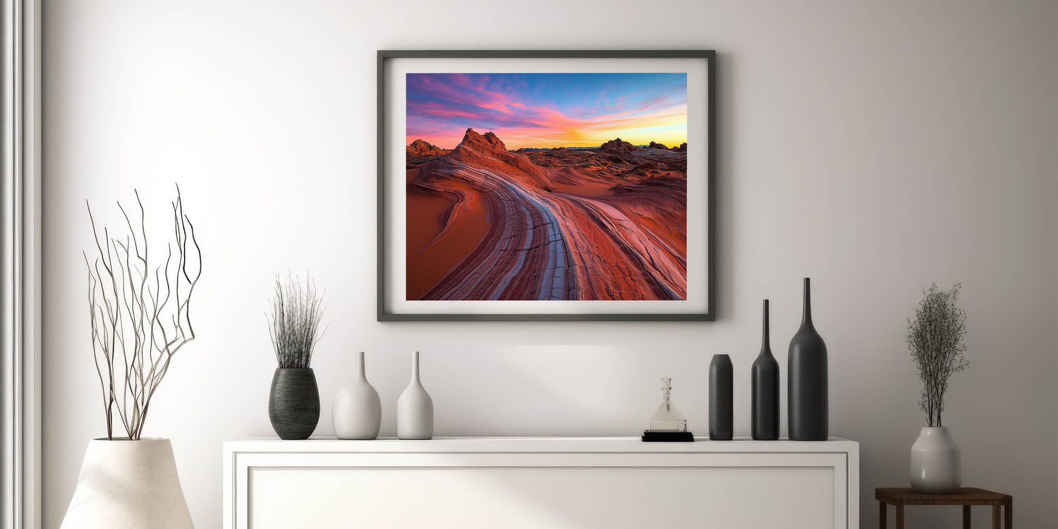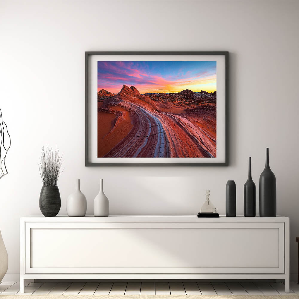 This southwestern desert artwork is perfect for living rooms, bedrooms, or offices. Whether you're drawn to the radiant beauty of a sunset or the unique patterns of sandstone formations, this piece adds warmth and depth to any space. Celebrate the timeless allure of the desert with this extraordinary landscape print.