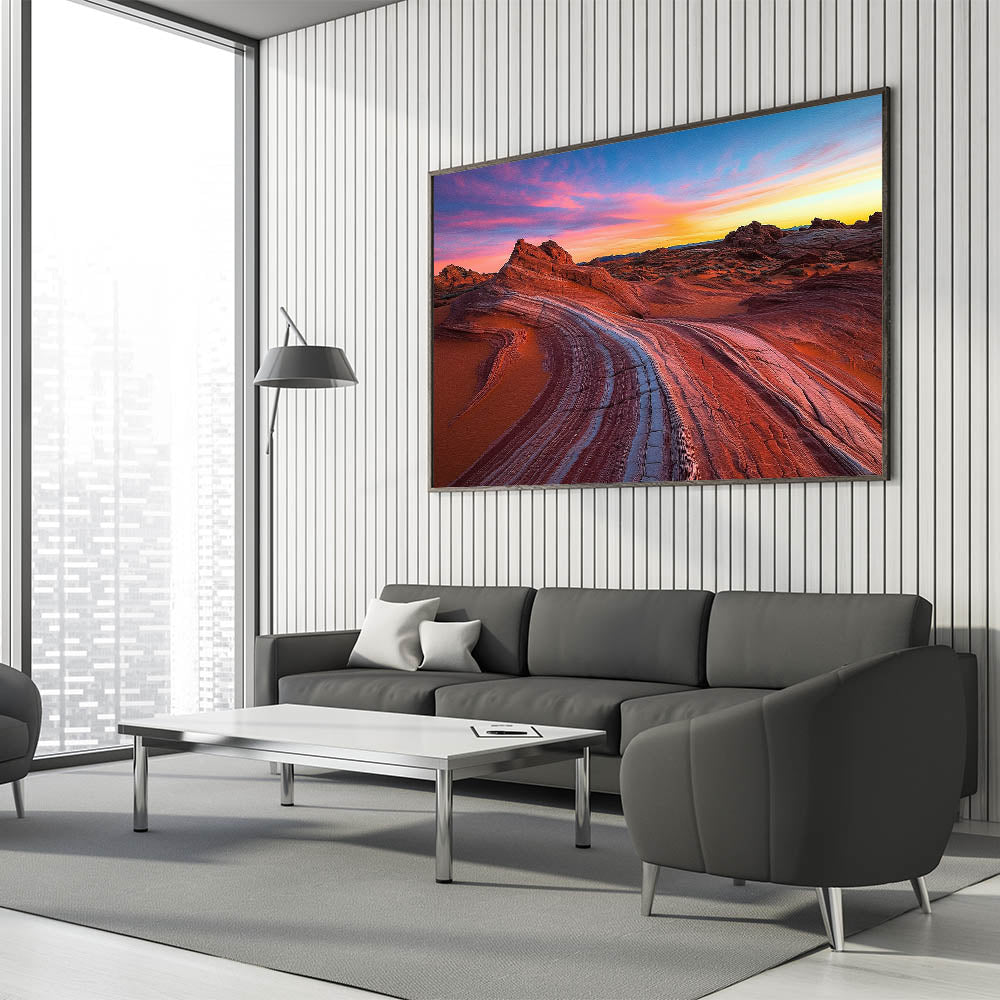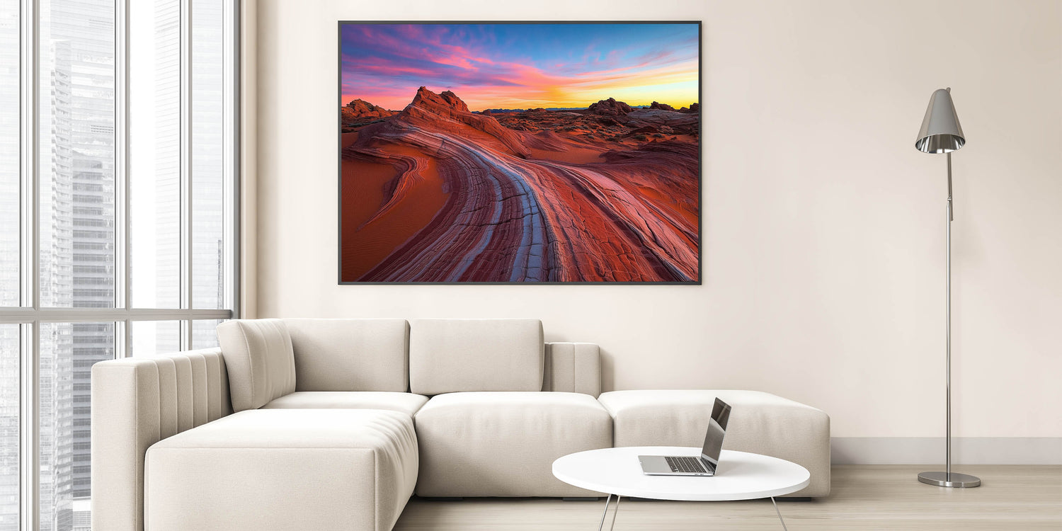 Step into the breathtaking beauty of the desert with this stunning sandstone artwork. Featuring rich red and orange desert layers illuminated by a vibrant sunset sky of pinks, purples, and yellows, this piece captures the dramatic elegance of the American Southwest. The sweeping curves and intricate patterns of the sandstone create a captivating focal point for any modern or rustic decor.