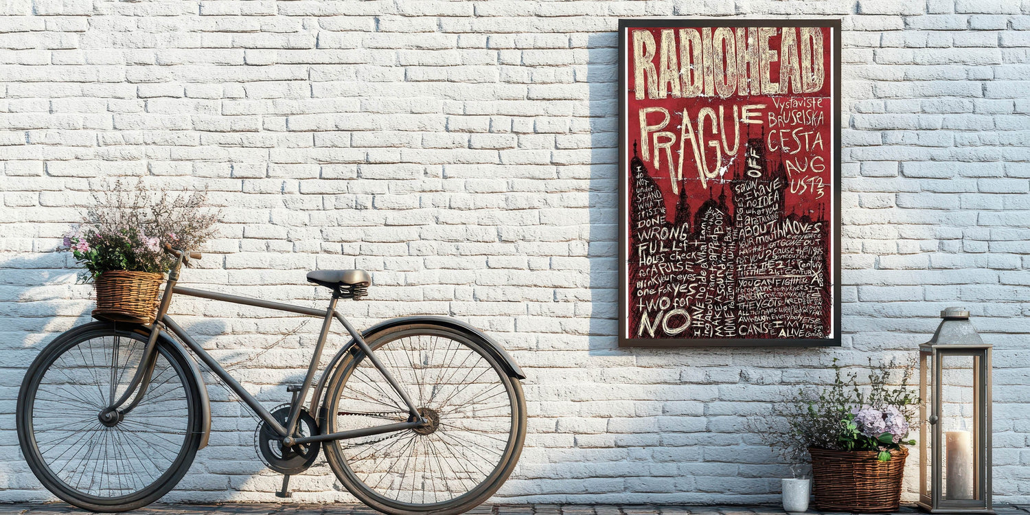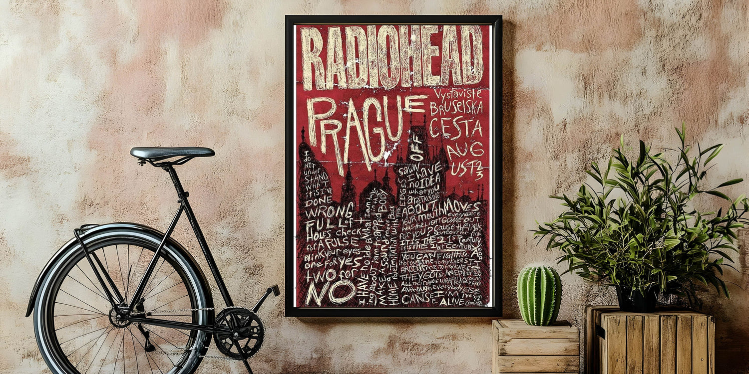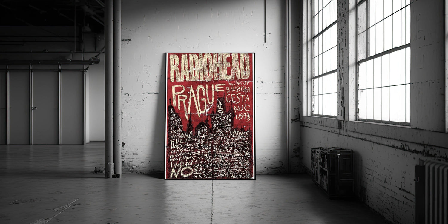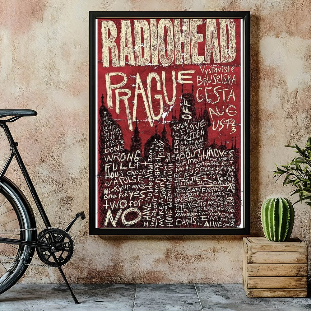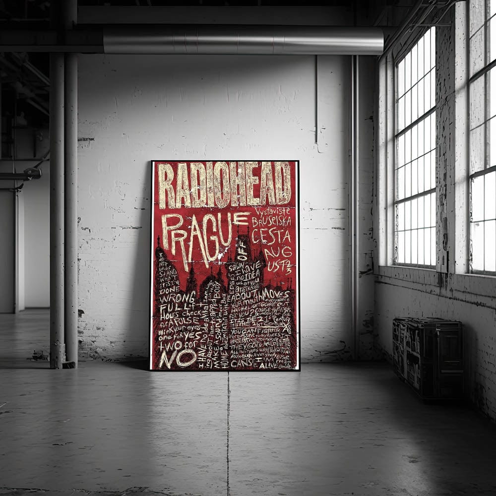 Capture the raw energy of Radiohead with this vintage concert poster from their iconic Prague performance. Featuring hand-drawn, chaotic text and striking red and white contrasts, this design showcases the band's unique artistic approach. The fragmented lyrics and moody color palette create a powerful and intense visual experience, making it a must-have for any Radiohead fan or vintage music art collector.