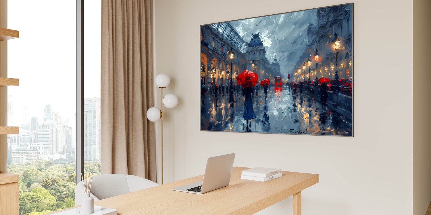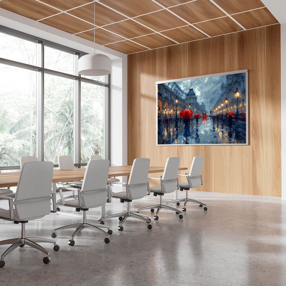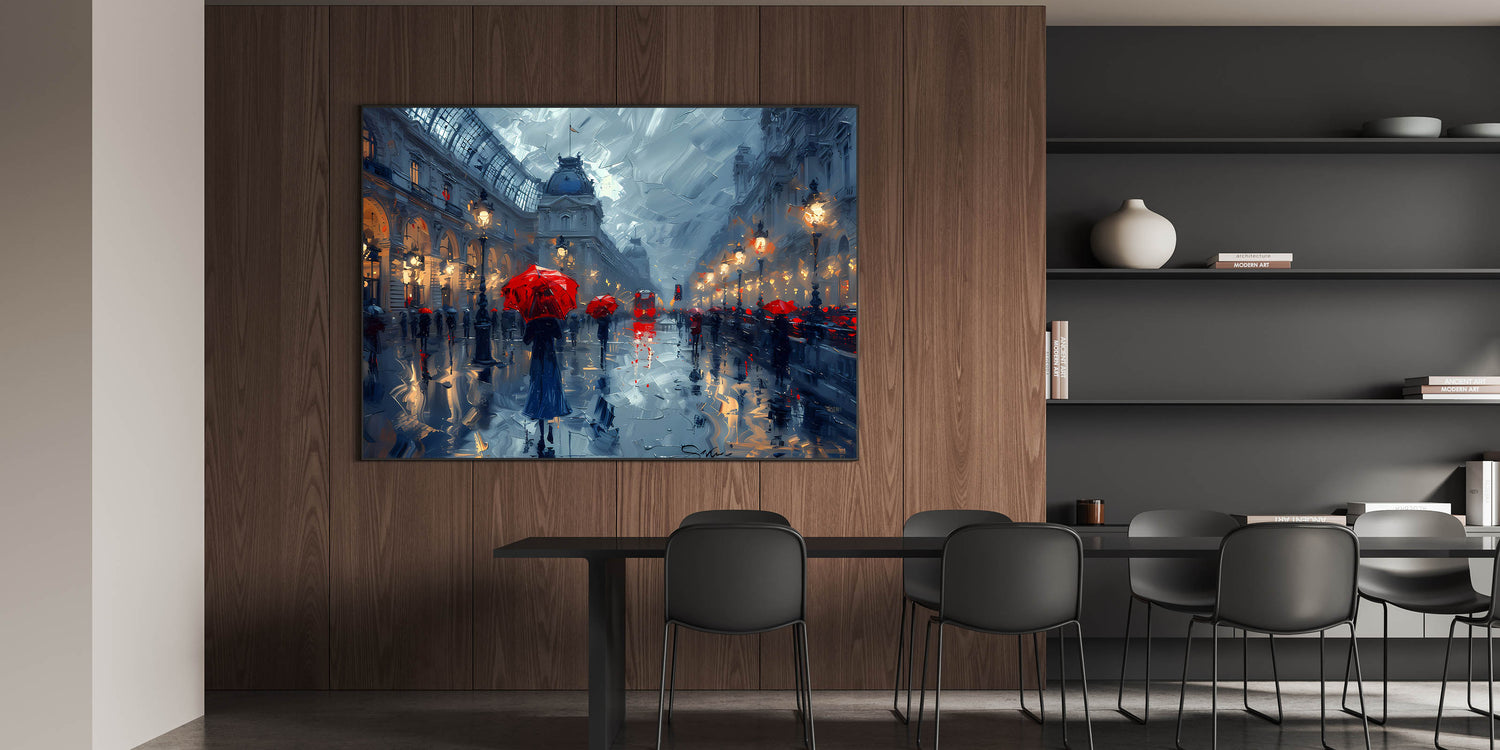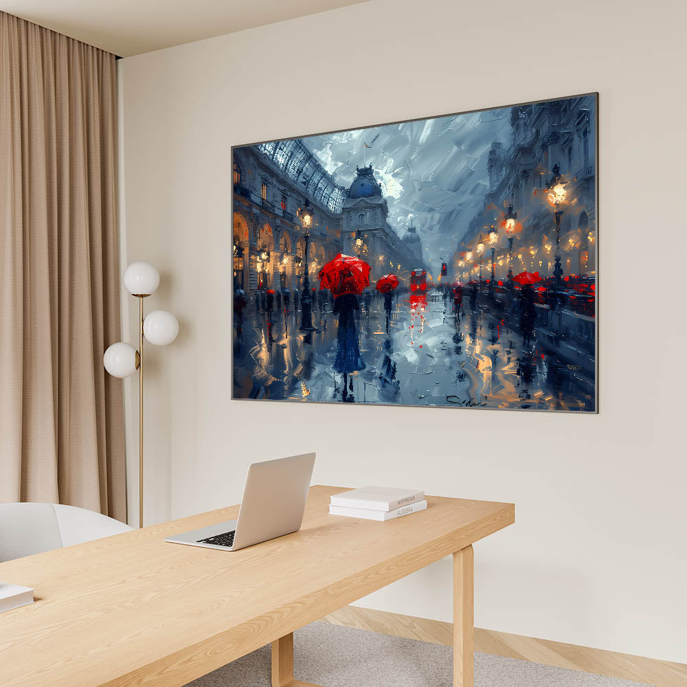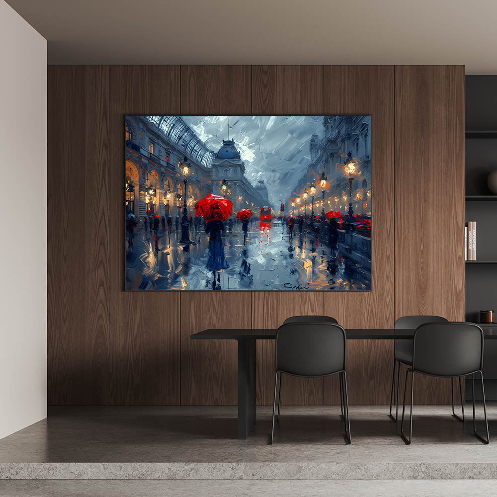 Capture the elegance of a rainy city evening with this Office Wall Art, featuring a stunning blend of deep blues, vibrant reds, and golden streetlights. The reflections on the wet streets and the striking contrast of red umbrellas against the moody urban backdrop create a visually captivating piece. This Modern Office Art is perfect for Corporate Wall Decor, adding a sophisticated and artistic touch to any professional setting.