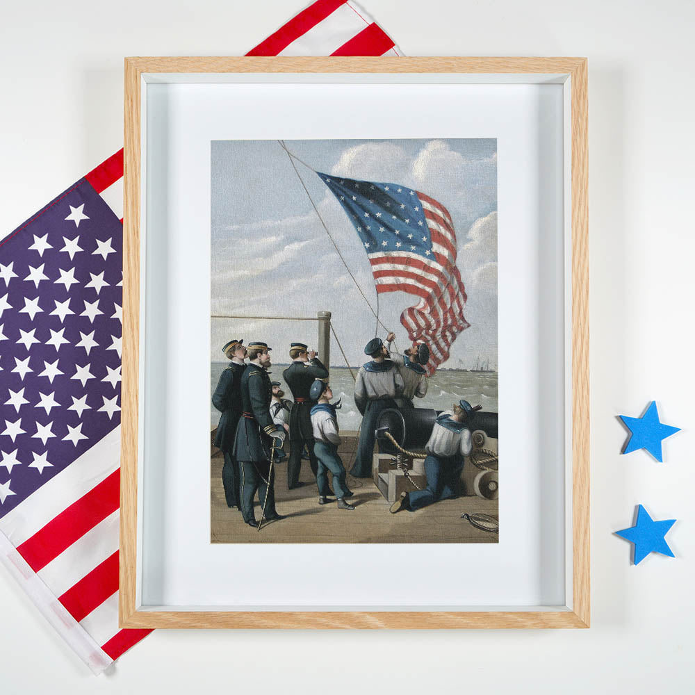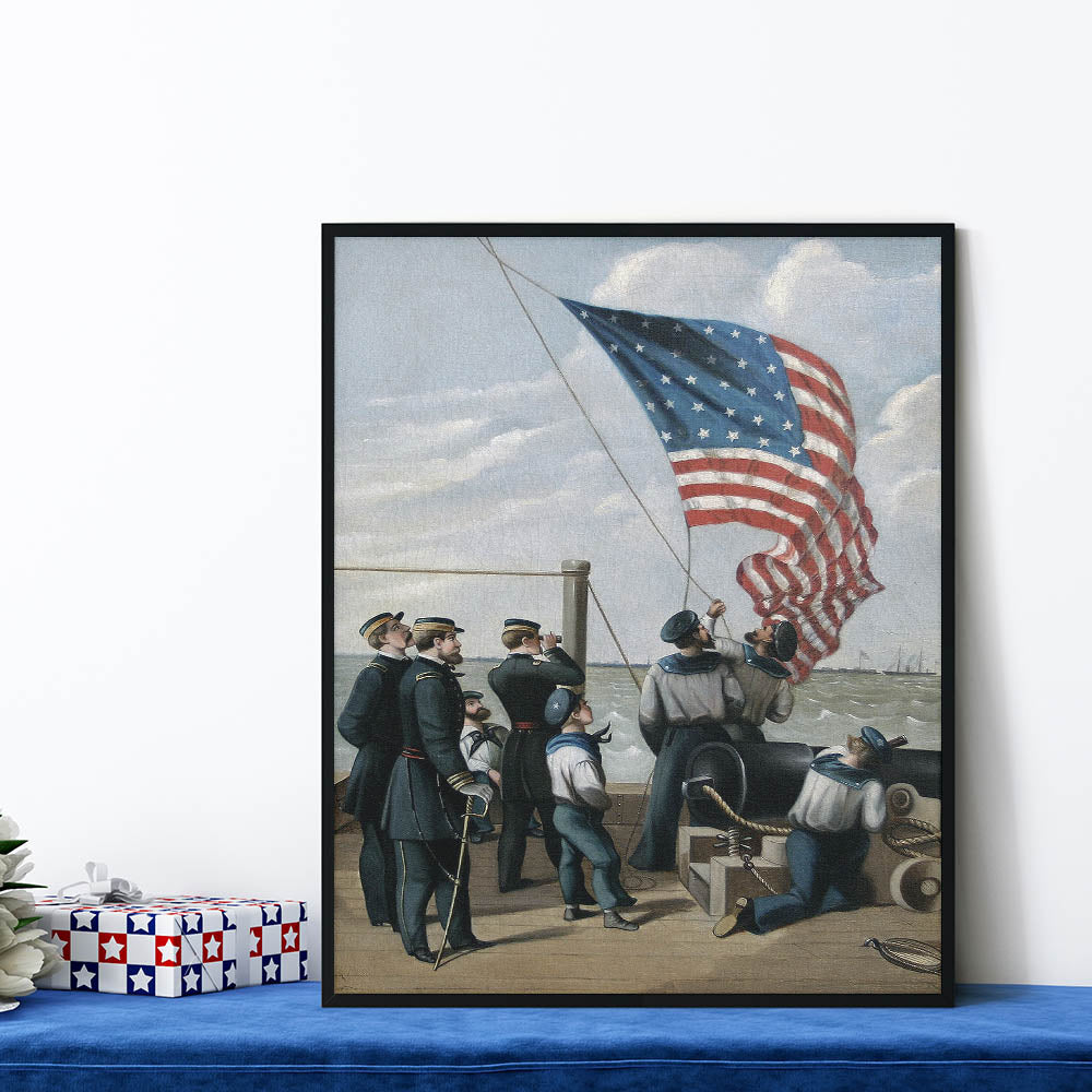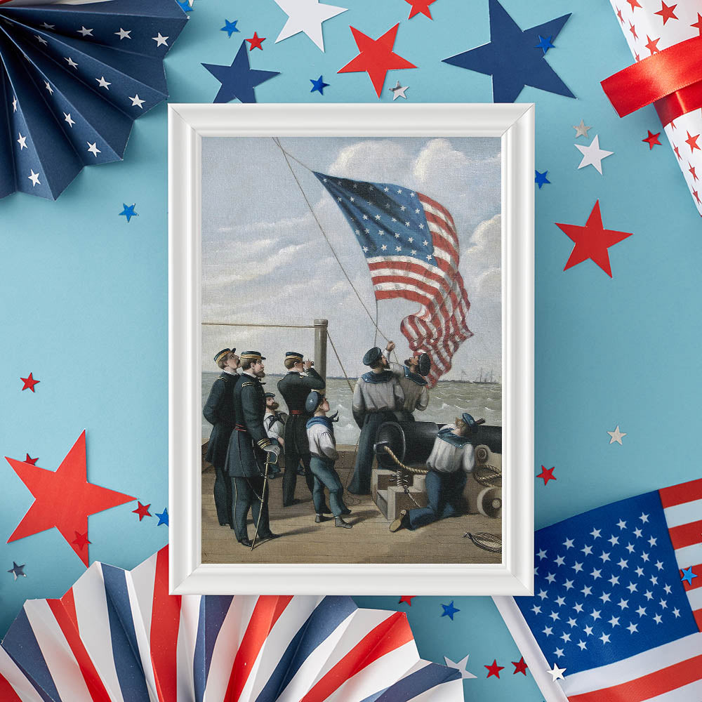 Celebrate American patriotism with this striking 4th of July wall art, featuring a historic naval scene where sailors proudly raise the American flag. This detailed painting captures the strength and resilience of the U.S. Navy, making it an exceptional Independence Day art decor piece for any patriotic collection.