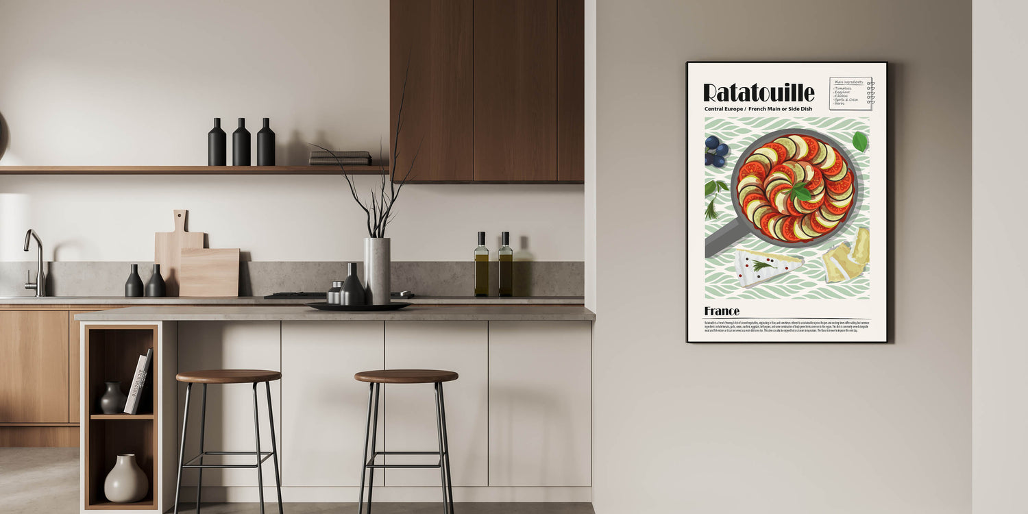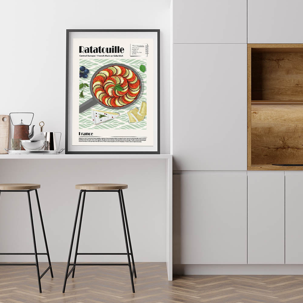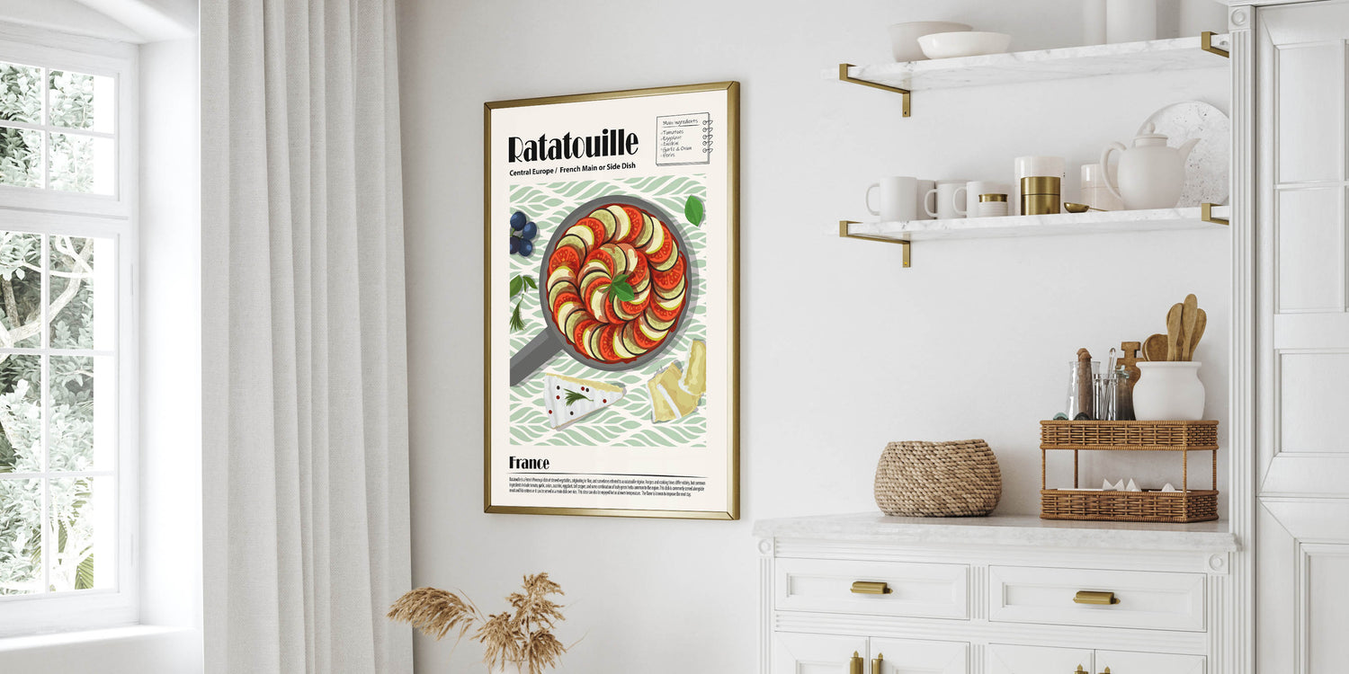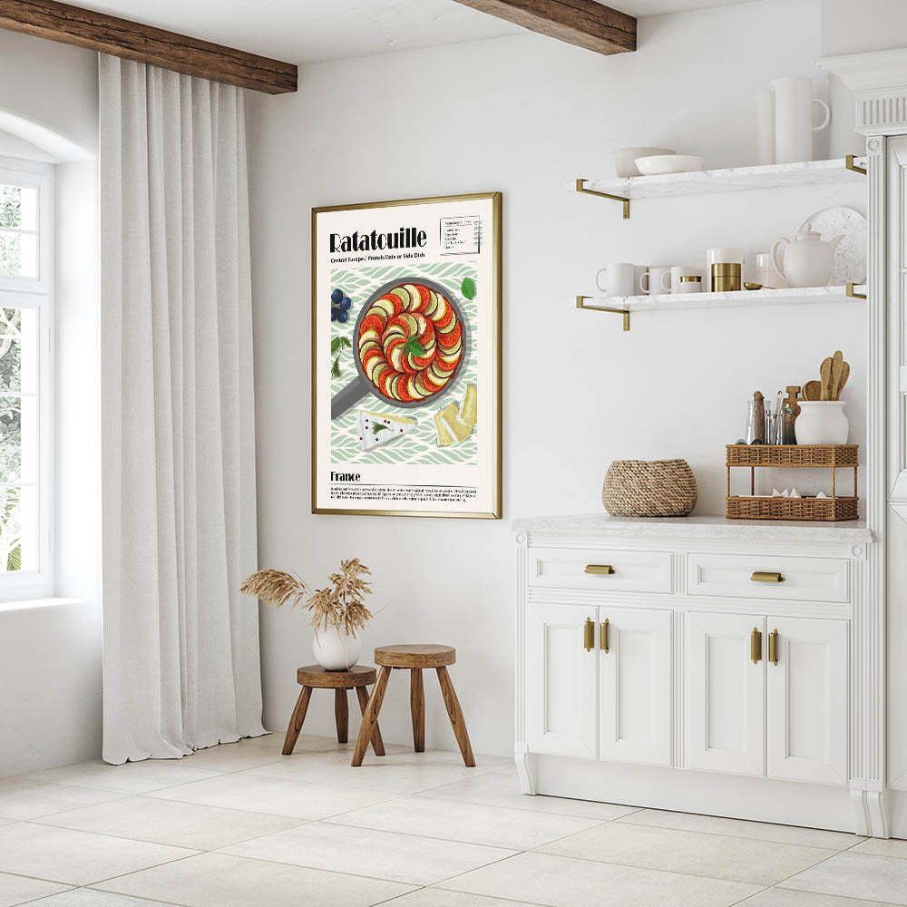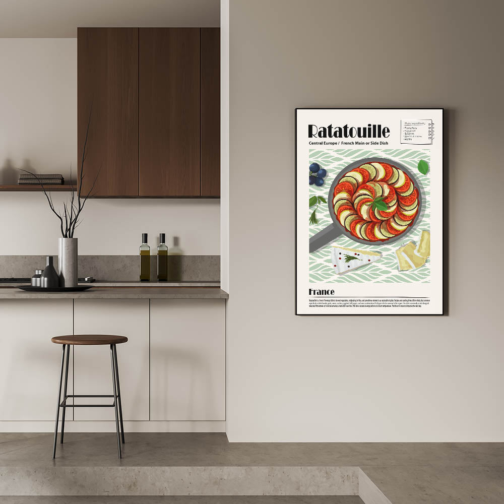 Add a touch of French elegance to your space with this Ratatouille Dishes Wall Art, a stunning visual representation of the iconic Provençal dish. This culinary wall art showcases a meticulously arranged skillet of ratatouille, featuring thinly sliced tomatoes, zucchini, and eggplant, layered in a perfect spiral and garnished with fresh basil. The soft green patterned background complements the dish’s natural tones, making this food wall art a refined addition to any kitchen decor or dining room wall art collection.