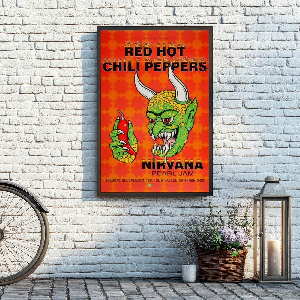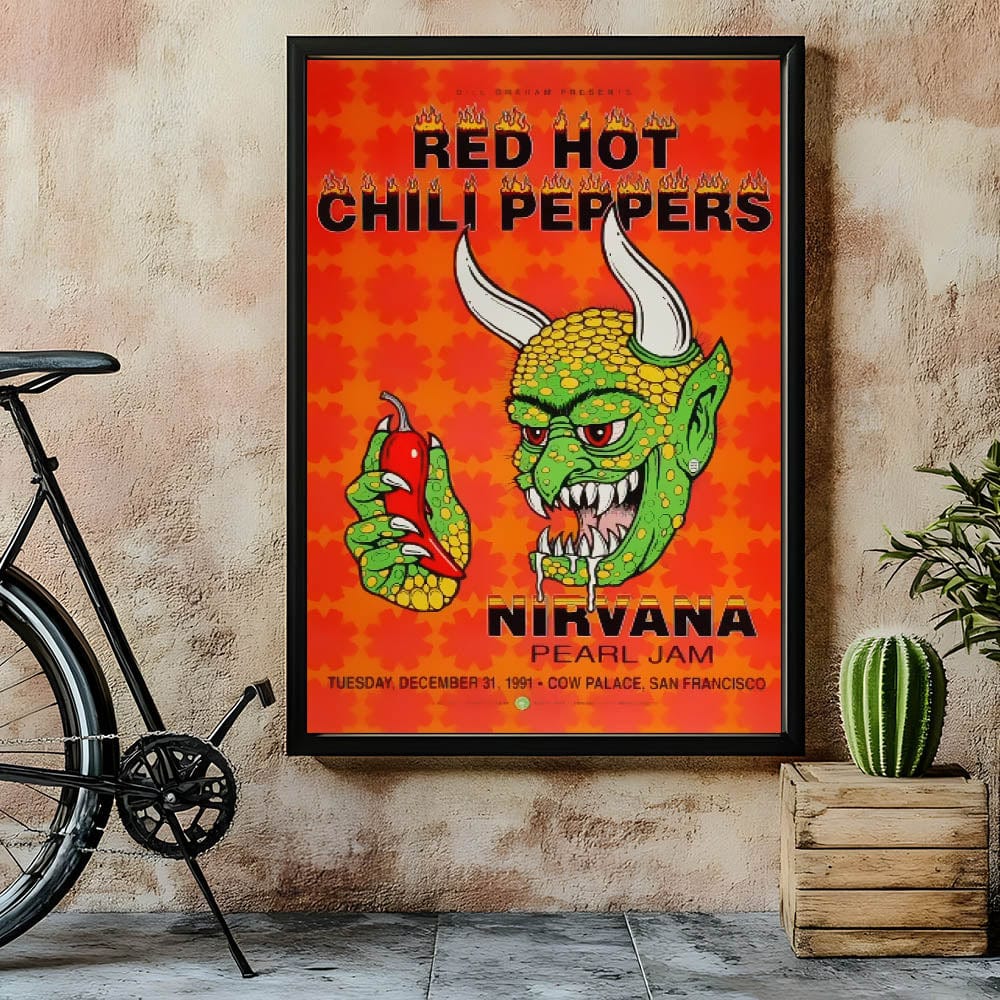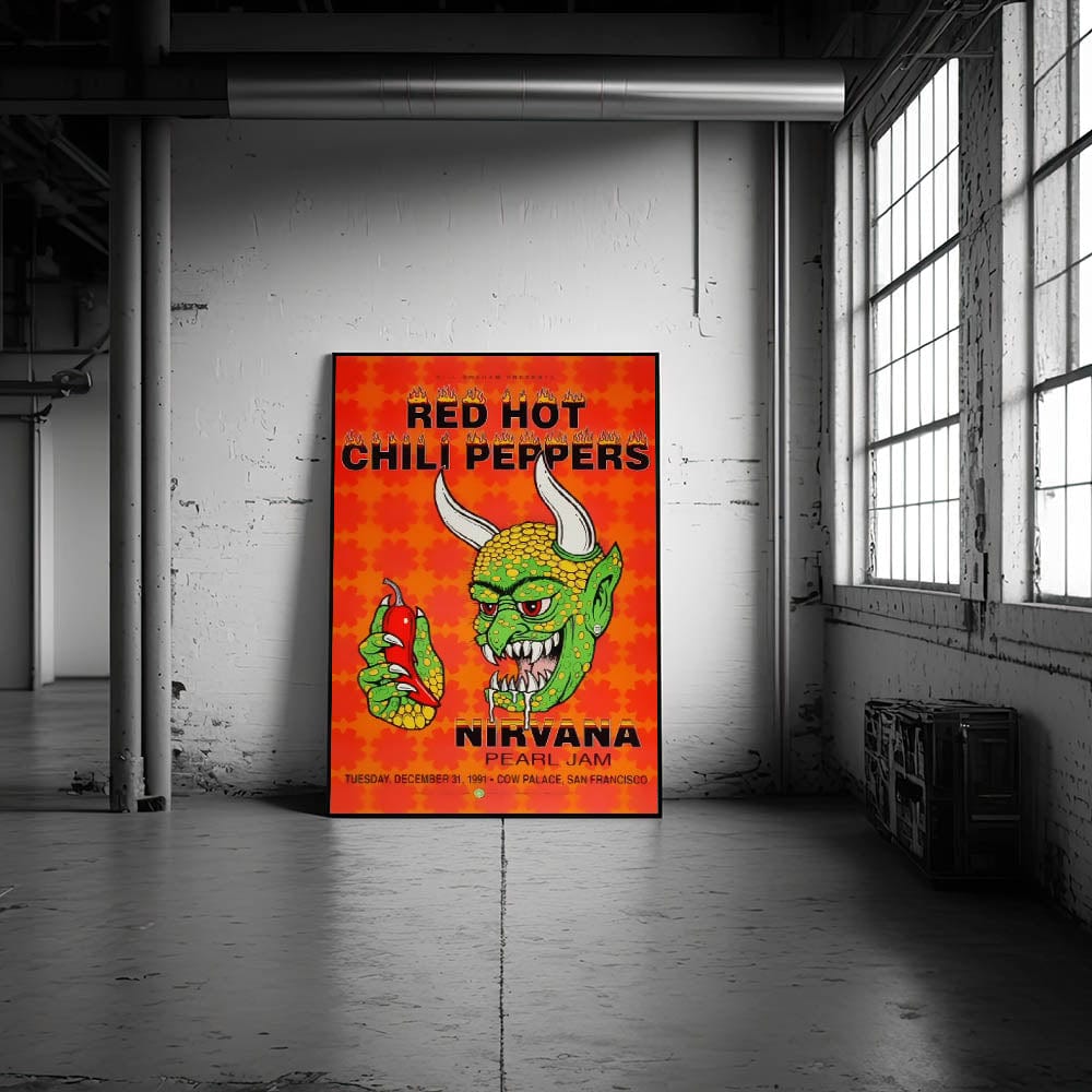 Bring the fiery energy of the Red Hot Chili Peppers into your space with this bold 1991 Cow Palace concert poster. Featuring the band alongside Nirvana and Pearl Jam, this iconic poster showcases a striking, colorful design of a green, horned creature holding a chili pepper, surrounded by flames. The vibrant colors of orange, red, and green make this a standout piece for any music enthusiast or collector of vintage rock art.
