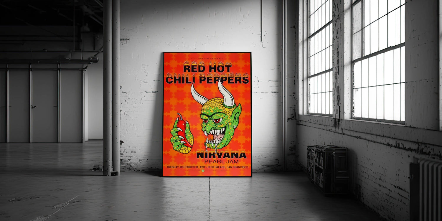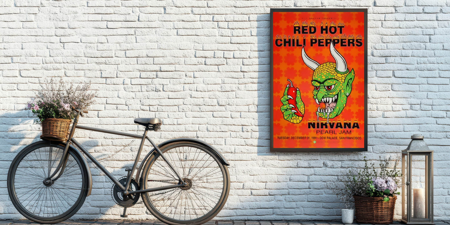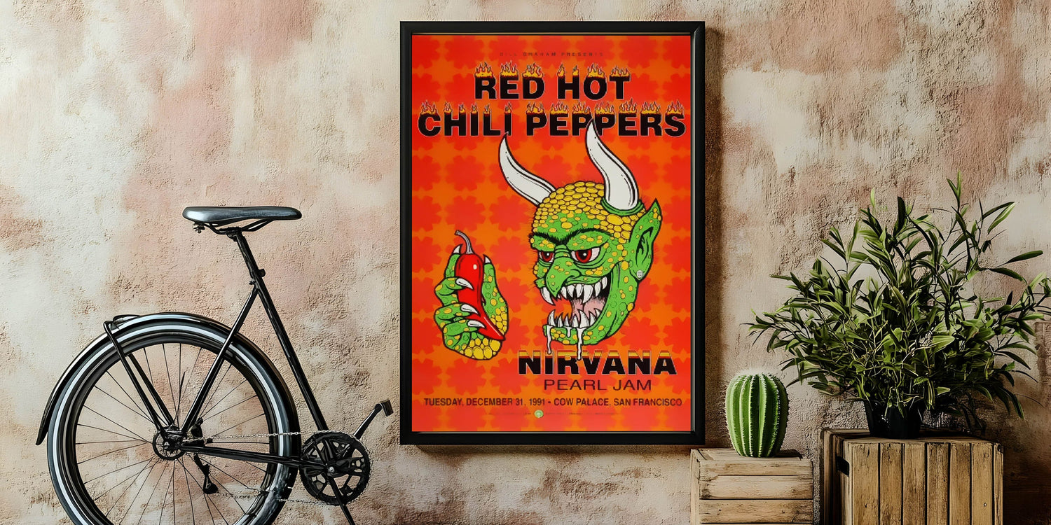 Bring the fiery energy of the Red Hot Chili Peppers into your space with this bold 1991 Cow Palace concert poster. Featuring the band alongside Nirvana and Pearl Jam, this iconic poster showcases a striking, colorful design of a green, horned creature holding a chili pepper, surrounded by flames. The vibrant colors of orange, red, and green make this a standout piece for any music enthusiast or collector of vintage rock art.