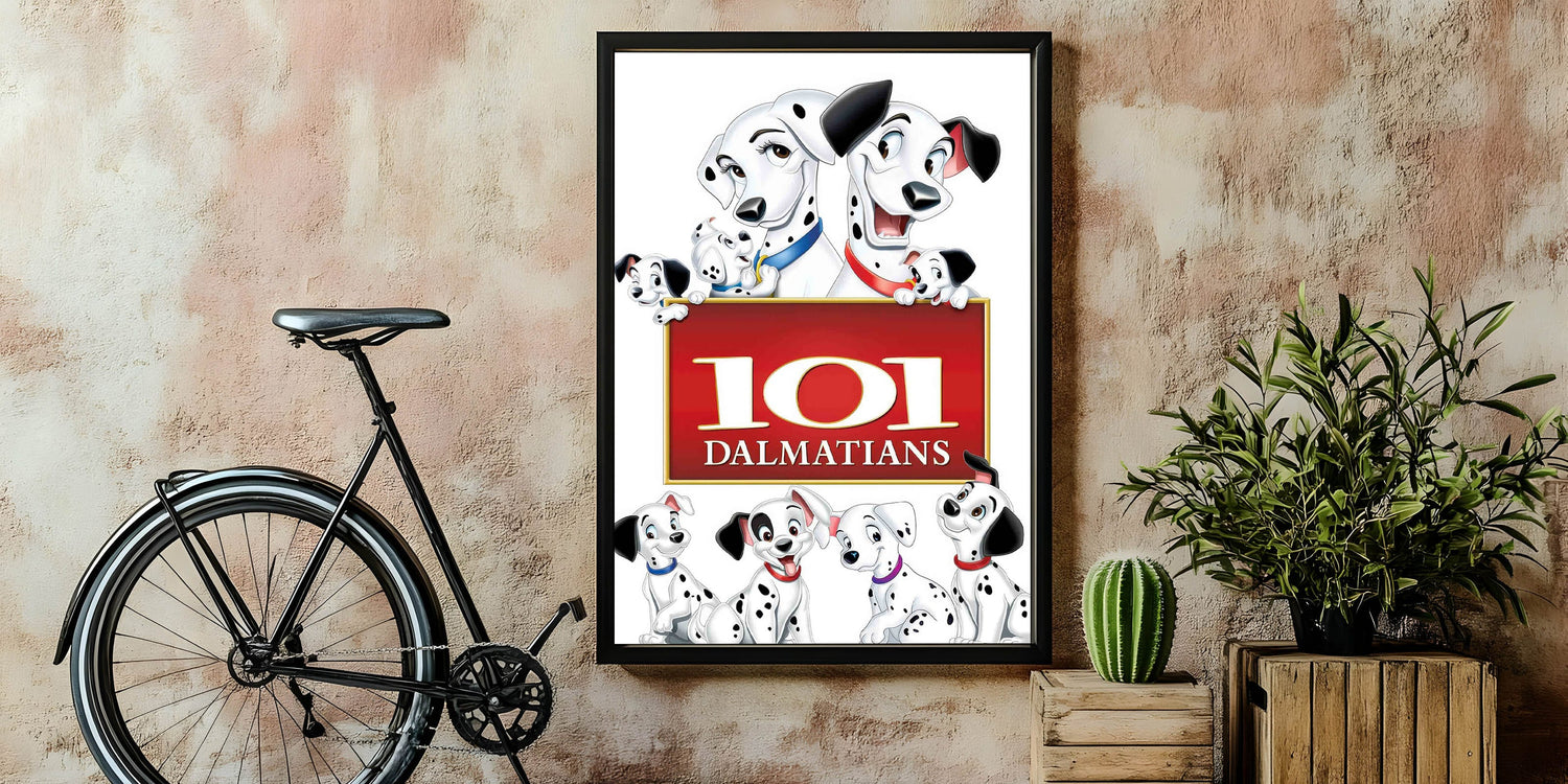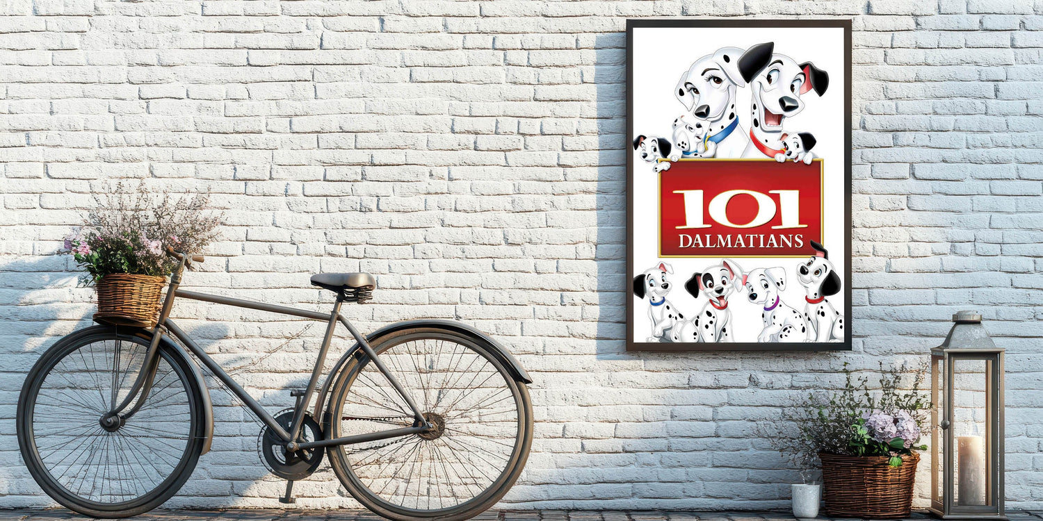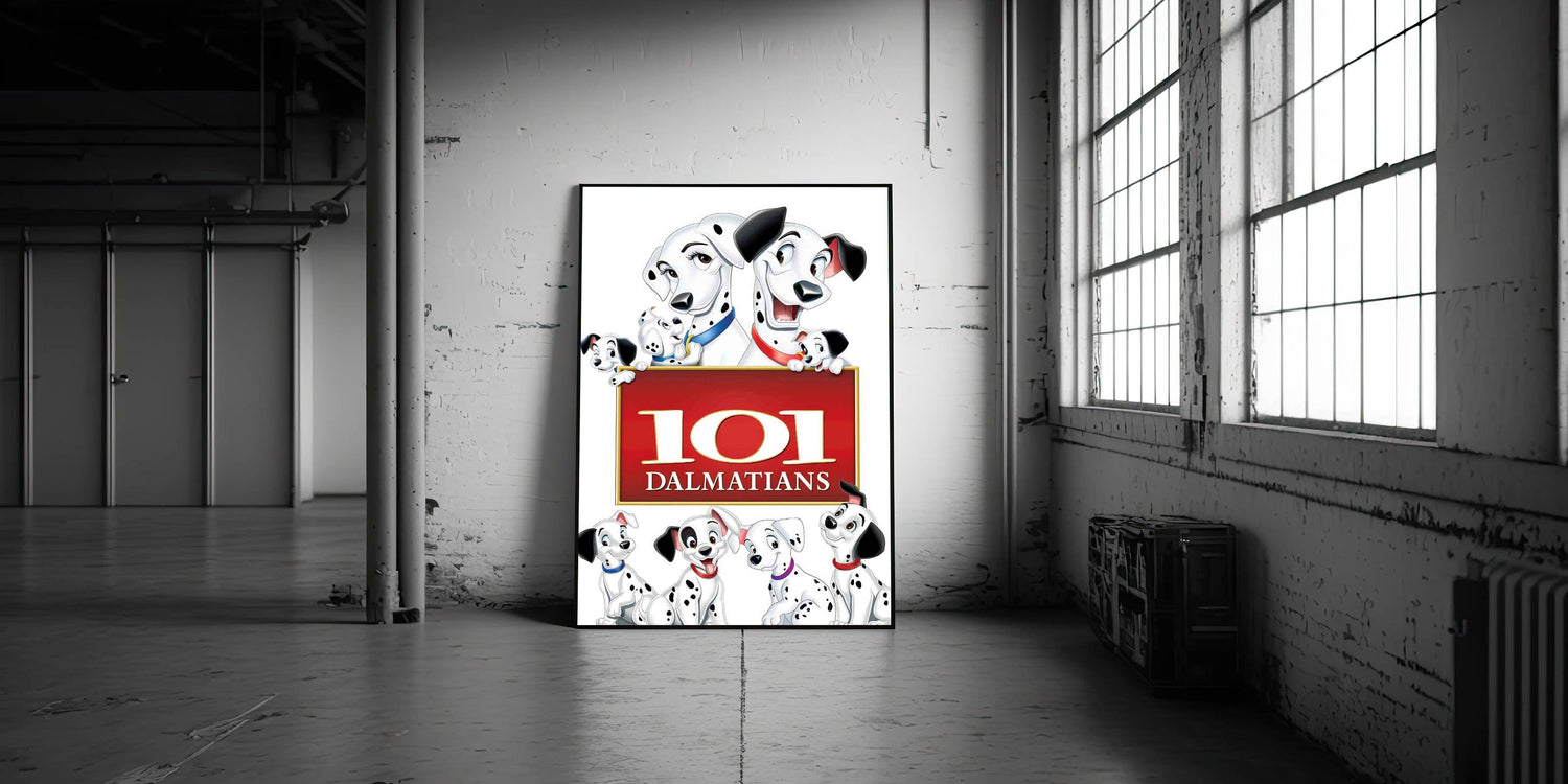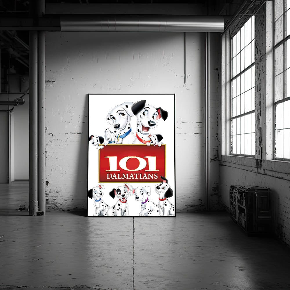 Celebrate the magic of classic animation with this 101 Dalmatians vintage movie poster from the 1960s golden age of Disney films. Featuring the beloved Pongo, Perdita, and their adorable Dalmatian puppies, this retro cinema art brings timeless charm and nostalgia to any space. With its playful design and vibrant colors, this classic 60s movie print is a perfect addition for Disney collectors, vintage film enthusiasts, and dog lovers alike.