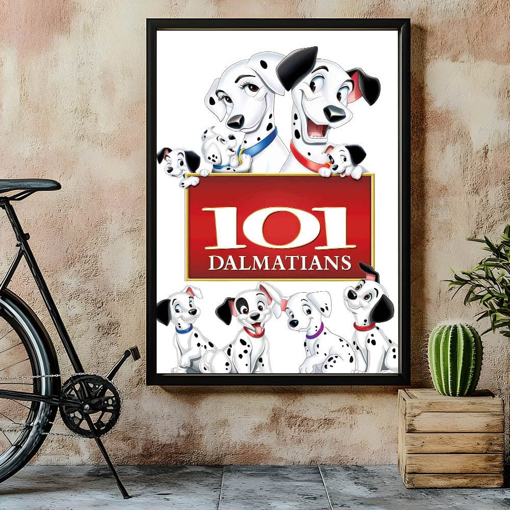 - Showcases iconic characters Pongo, Perdita, and the Dalmatian puppies in a vibrant vintage design