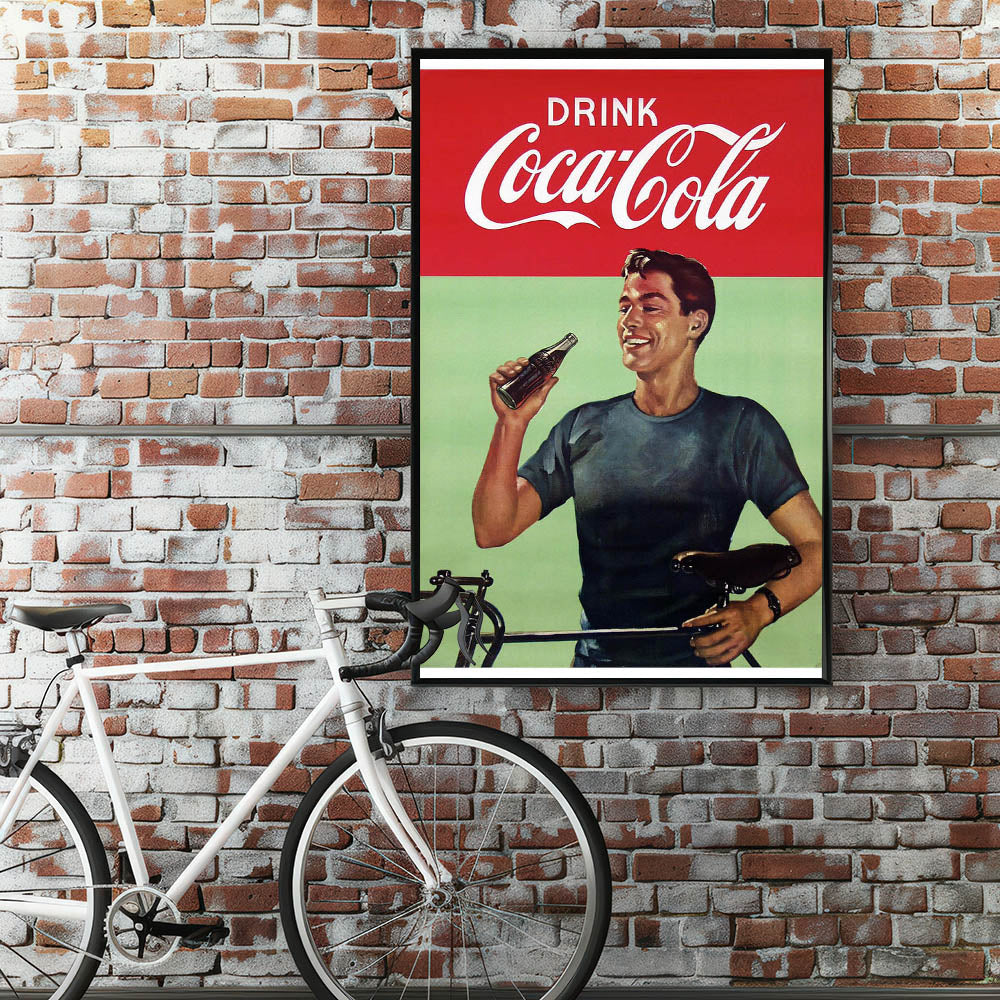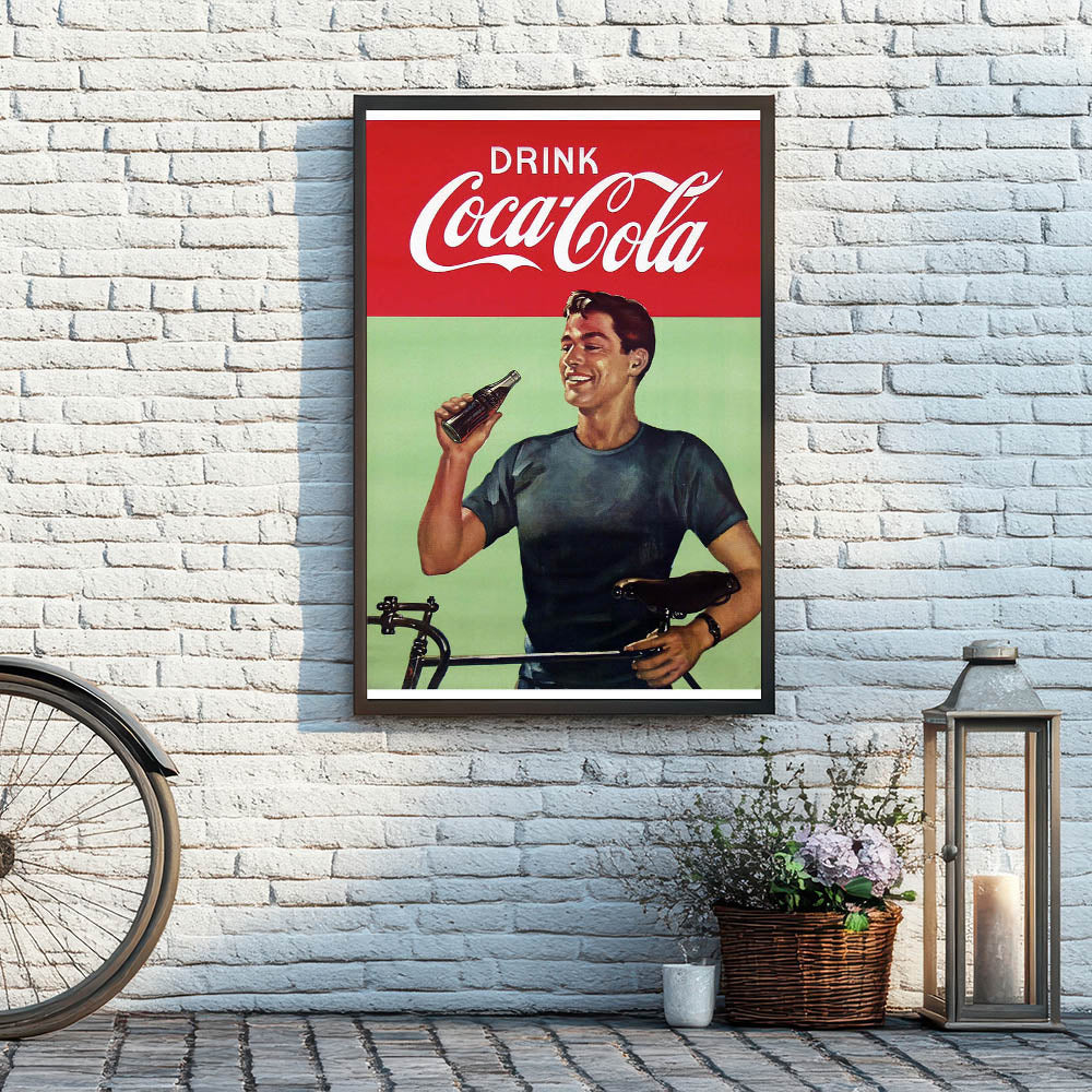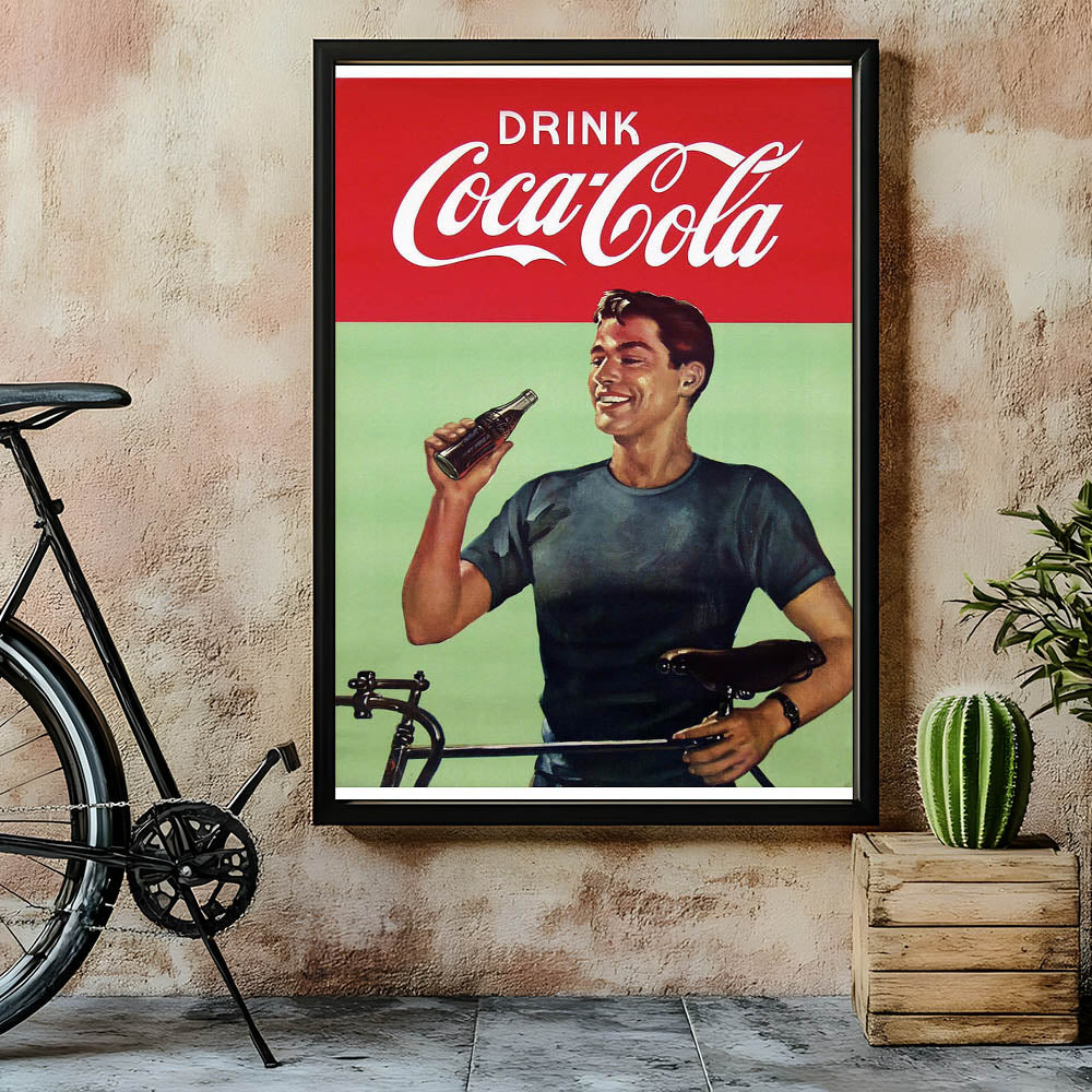 Add a refreshing touch of nostalgia to your space with this Retro Coca-Cola Poster. Featuring the iconic Coca-Cola logo and a vibrant illustration of a cheerful cyclist enjoying a classic glass bottle, this vintage advert captures the essence of mid-century advertising charm. The bold red and green tones, combined with the timeless branding, make it a must-have for fans of Retro Aesthetic and Vintage Decor.