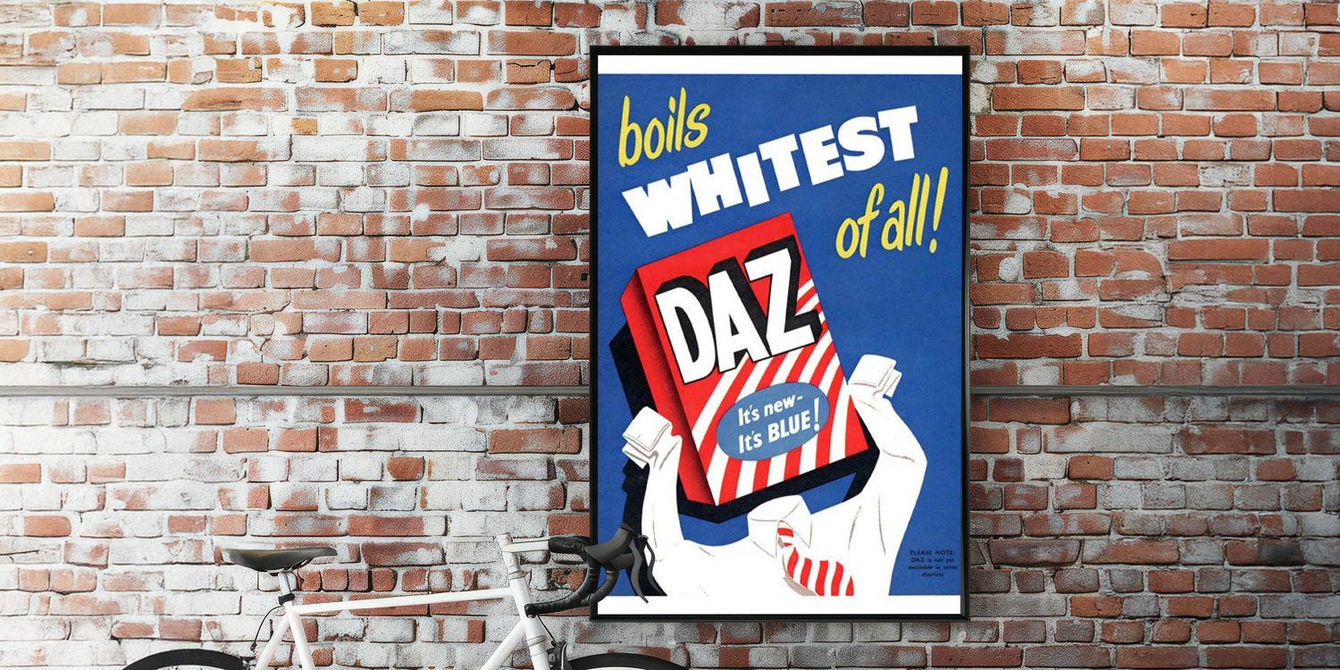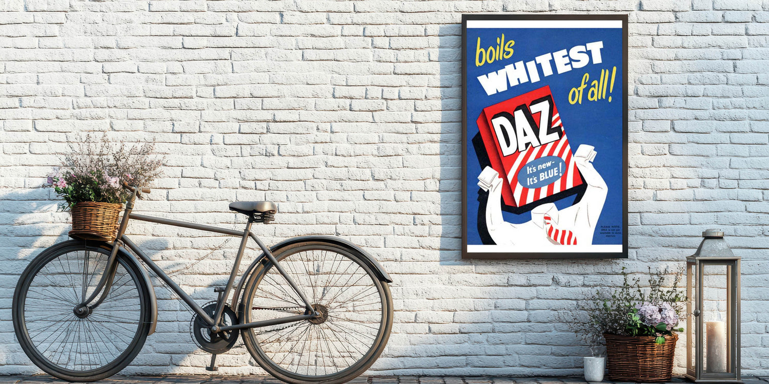 Bring a splash of nostalgic charm to your space with this Retro Daz Detergent Poster. Featuring bold typography, vibrant blue and red hues, and a classic mid-century design, this vintage advert captures the essence of Retro Aesthetic and Vintage Decor. The playful and eye-catching design makes it a perfect addition to laundry rooms, kitchens, or any space that celebrates the timeless appeal of nostalgic advertising.
