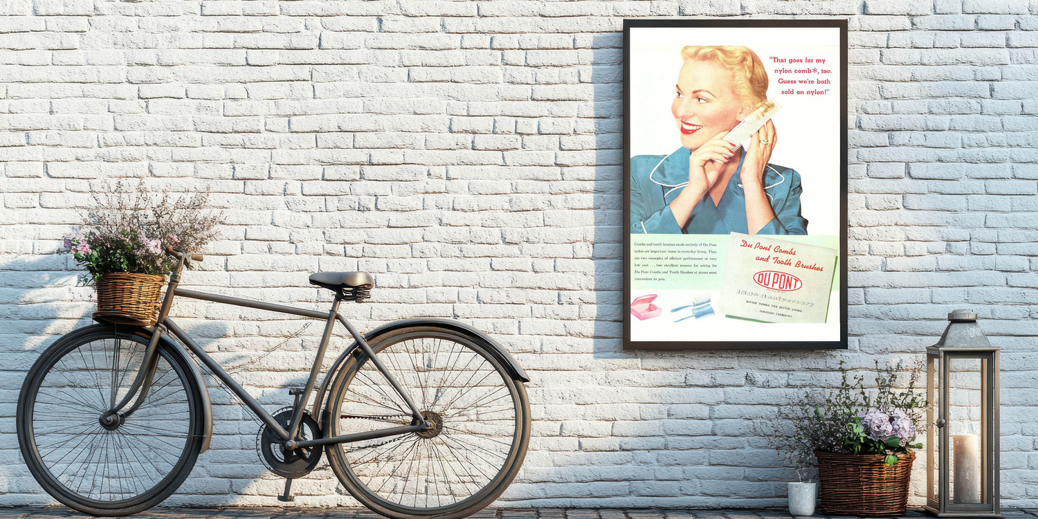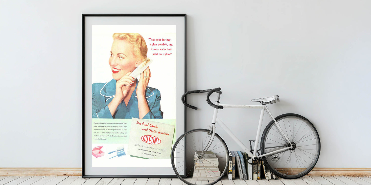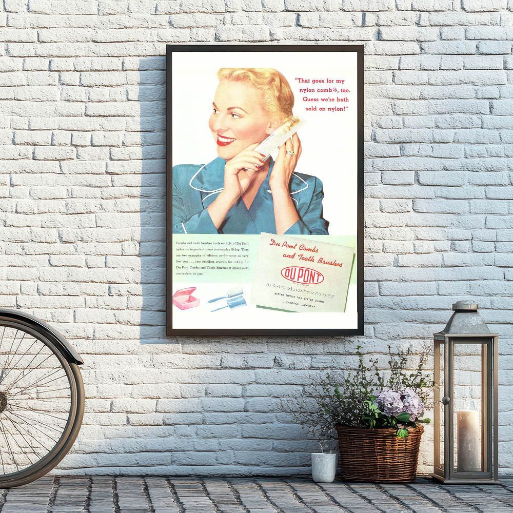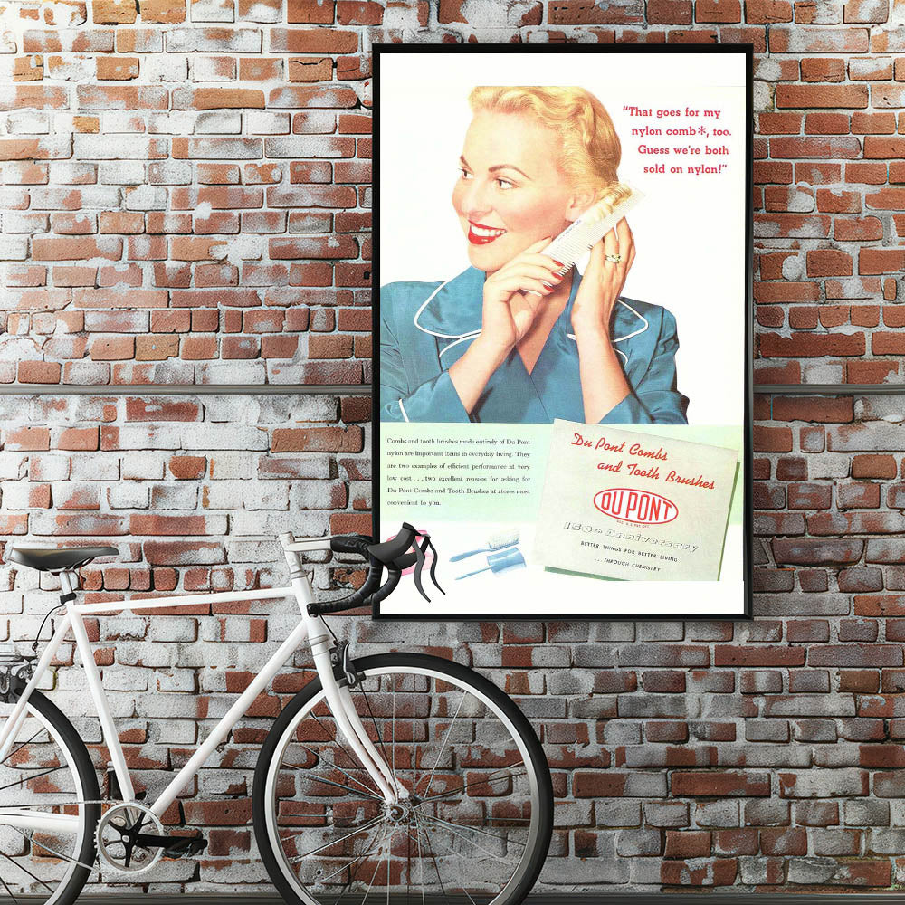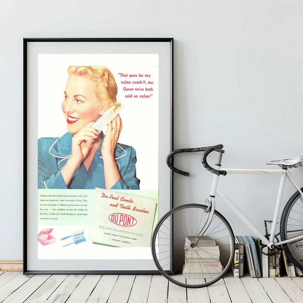 Transform your walls with this timeless Retro art print, showcasing the elegance and innovation of DuPont nylon products. Its soft hues and nostalgic design are sure to bring a sophisticated and authentic vibe to any room. Order now to enhance your decor with a touch of vintage flair!