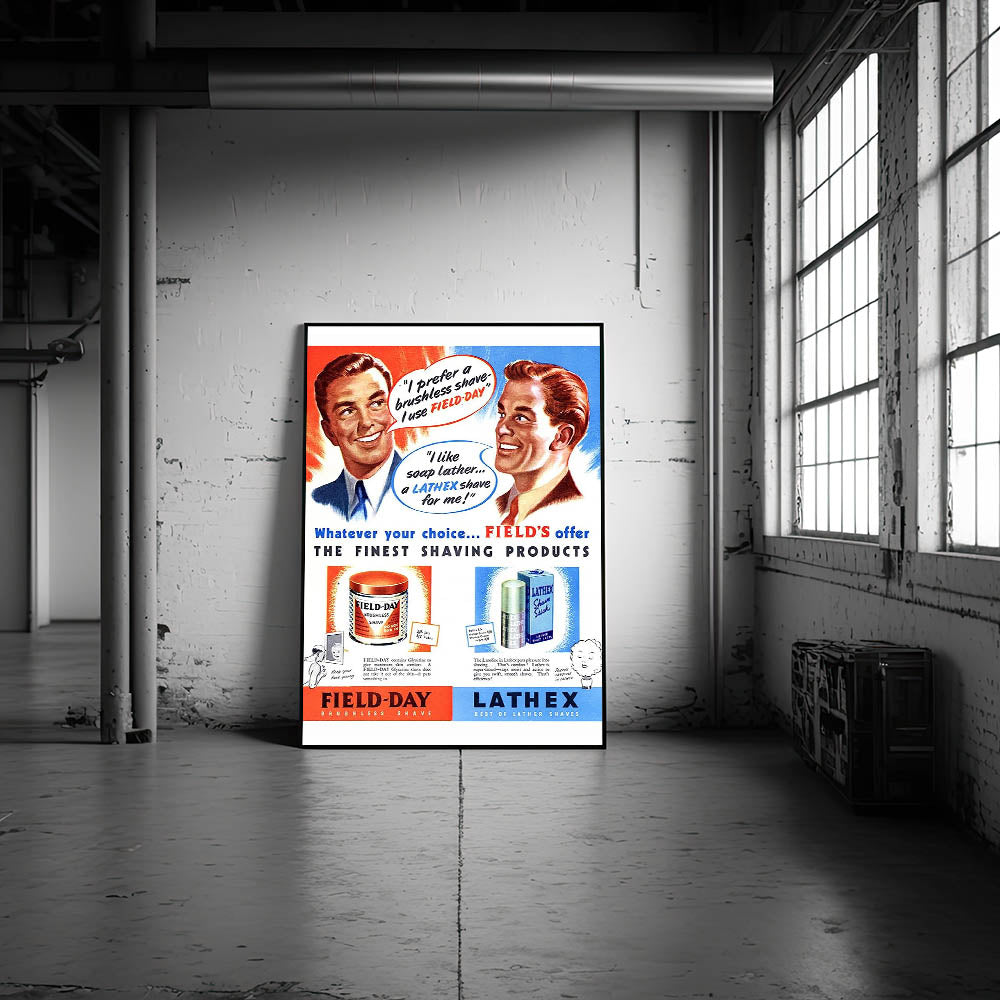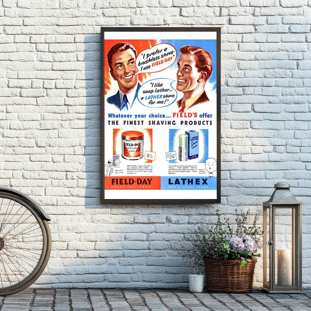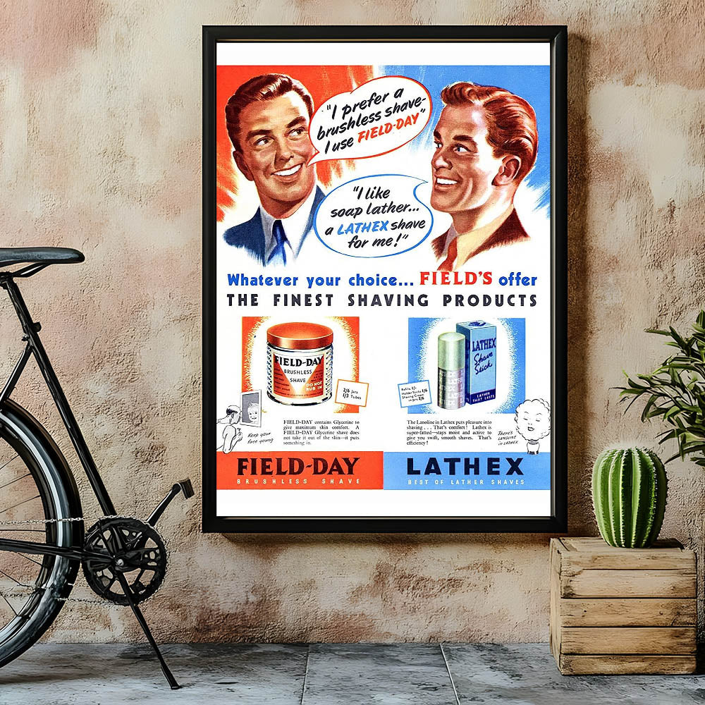 Add a dash of vintage flair to your space with this Retro Field-Day Shaving Poster. Featuring vibrant illustrations and classic mid-century typography, this vintage advert showcases the iconic Field-Day Brushless Shave and Lathex Lather Shave products. The bold colors and charming graphics capture the essence of Retro Aesthetic and Vintage Decor, making it an ideal choice for bathrooms, barbershops, or any space that appreciates nostalgic charm.