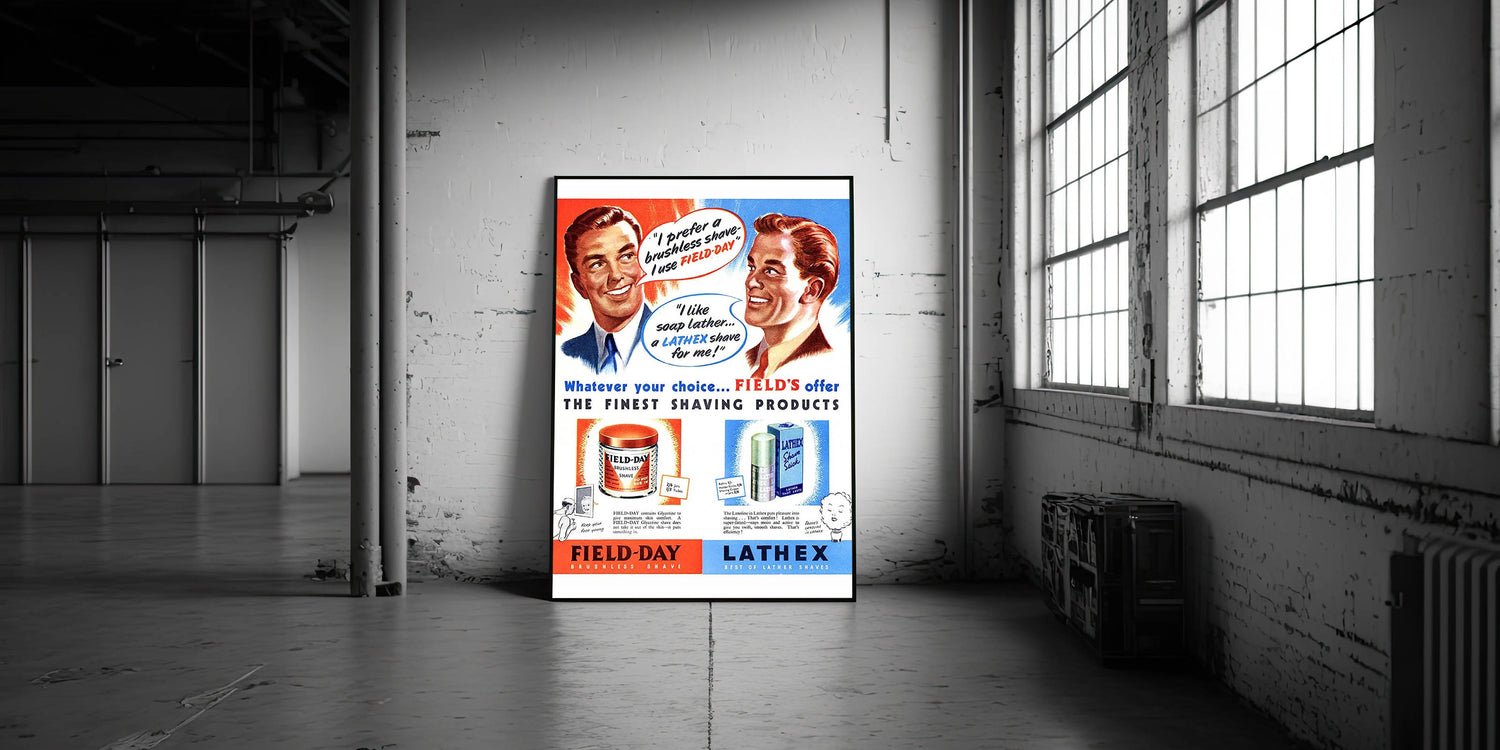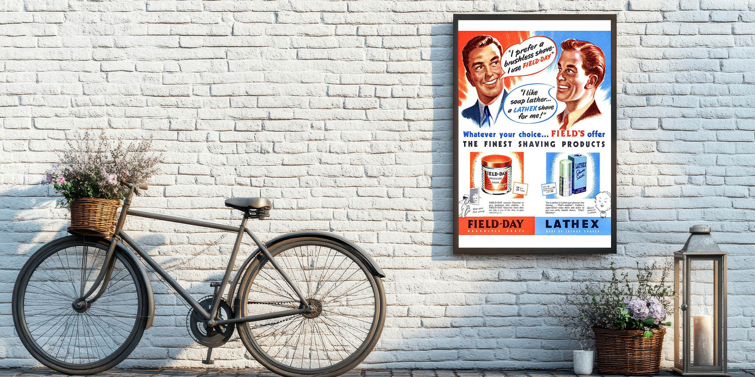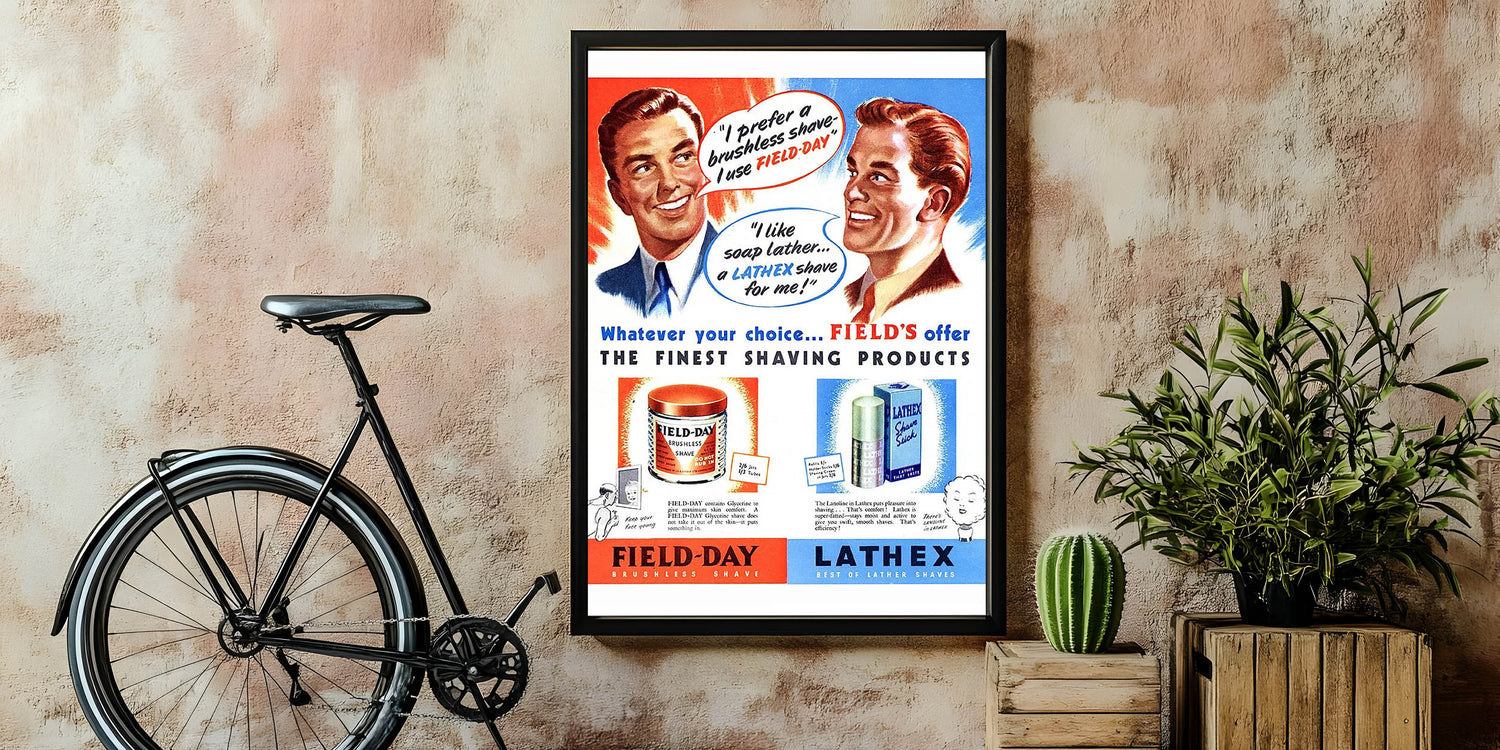 Add a dash of vintage flair to your space with this Retro Field-Day Shaving Poster. Featuring vibrant illustrations and classic mid-century typography, this vintage advert showcases the iconic Field-Day Brushless Shave and Lathex Lather Shave products. The bold colors and charming graphics capture the essence of Retro Aesthetic and Vintage Decor, making it an ideal choice for bathrooms, barbershops, or any space that appreciates nostalgic charm.