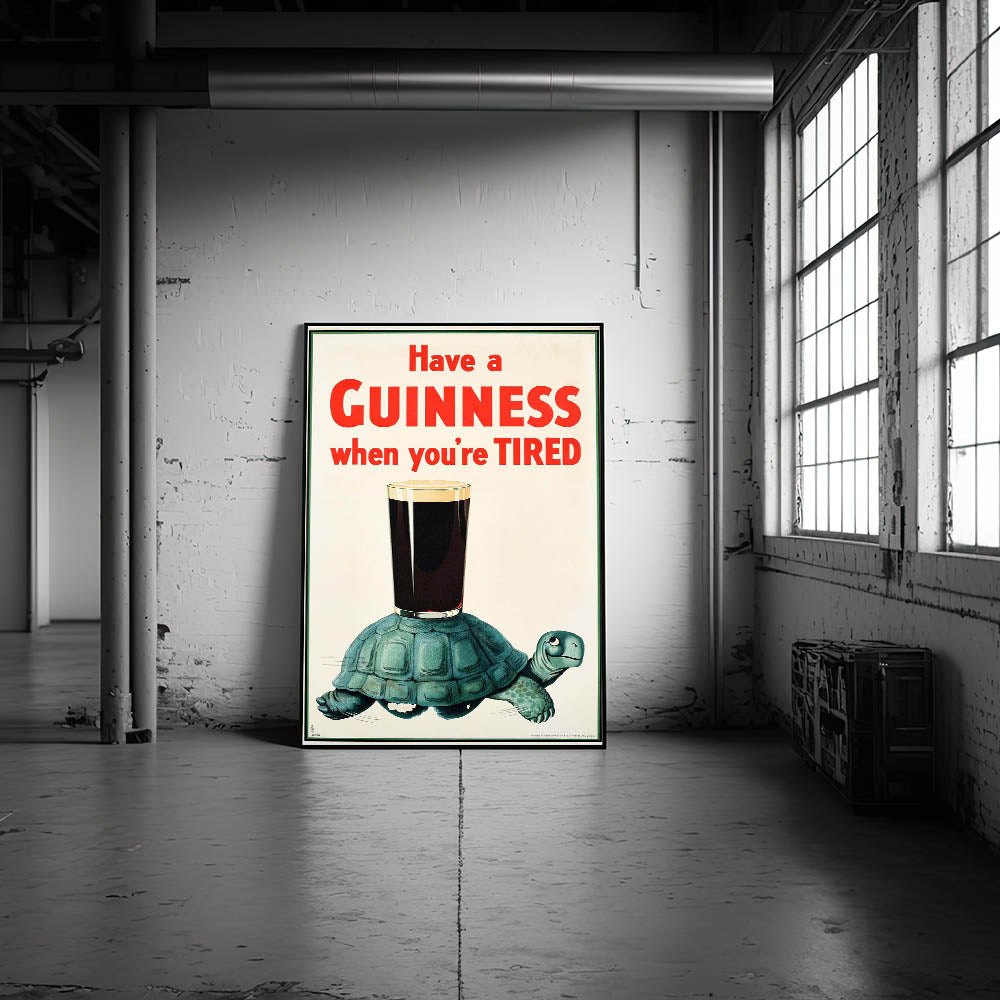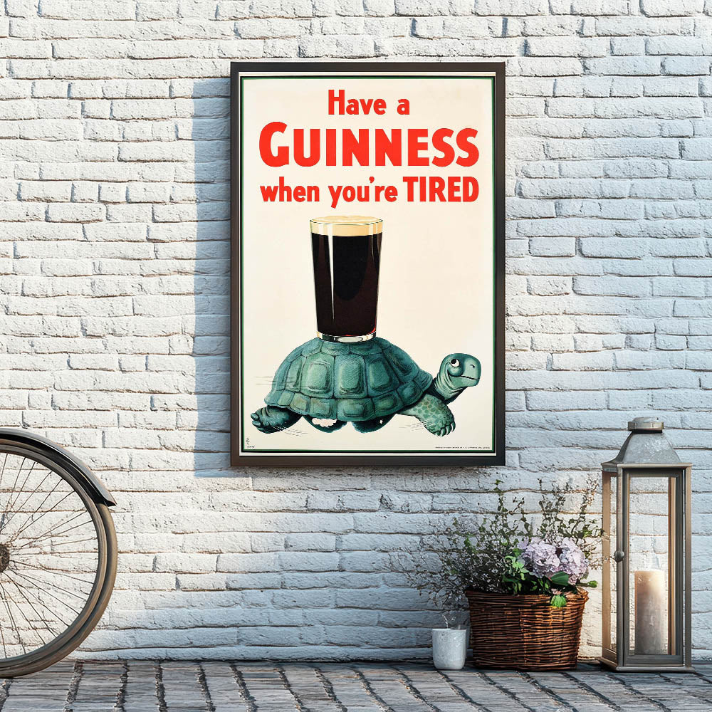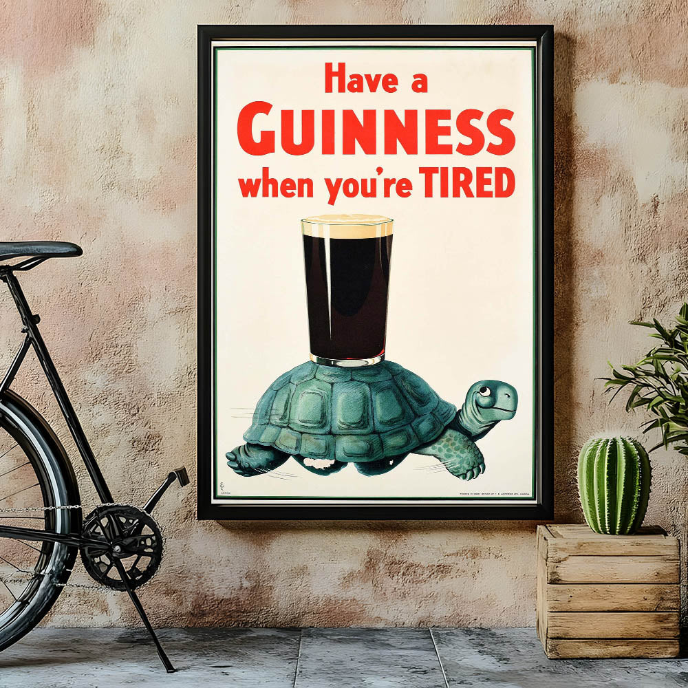 Add a touch of playful nostalgia to your decor with this Retro Guinness Turtle Poster. Featuring a charming illustration of a turtle carrying a pint of Guinness and bold typography, this vintage advert captures the whimsical and iconic style of mid-century Guinness advertising. The bright green and rich black hues, combined with the humorous slogan "Have a Guinness when you’re Tired," make it a perfect choice for home bars, pubs, or any space that embraces Retro Aesthetic and Vintage Decor.