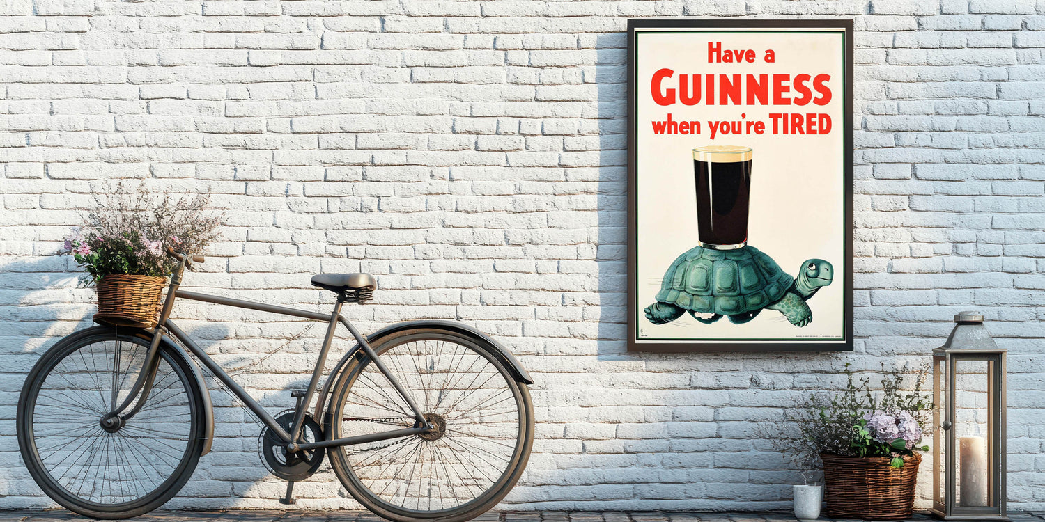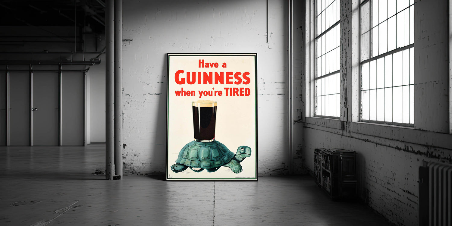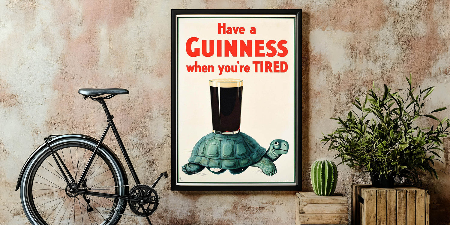 Add a touch of playful nostalgia to your decor with this Retro Guinness Turtle Poster. Featuring a charming illustration of a turtle carrying a pint of Guinness and bold typography, this vintage advert captures the whimsical and iconic style of mid-century Guinness advertising. The bright green and rich black hues, combined with the humorous slogan "Have a Guinness when you’re Tired," make it a perfect choice for home bars, pubs, or any space that embraces Retro Aesthetic and Vintage Decor.