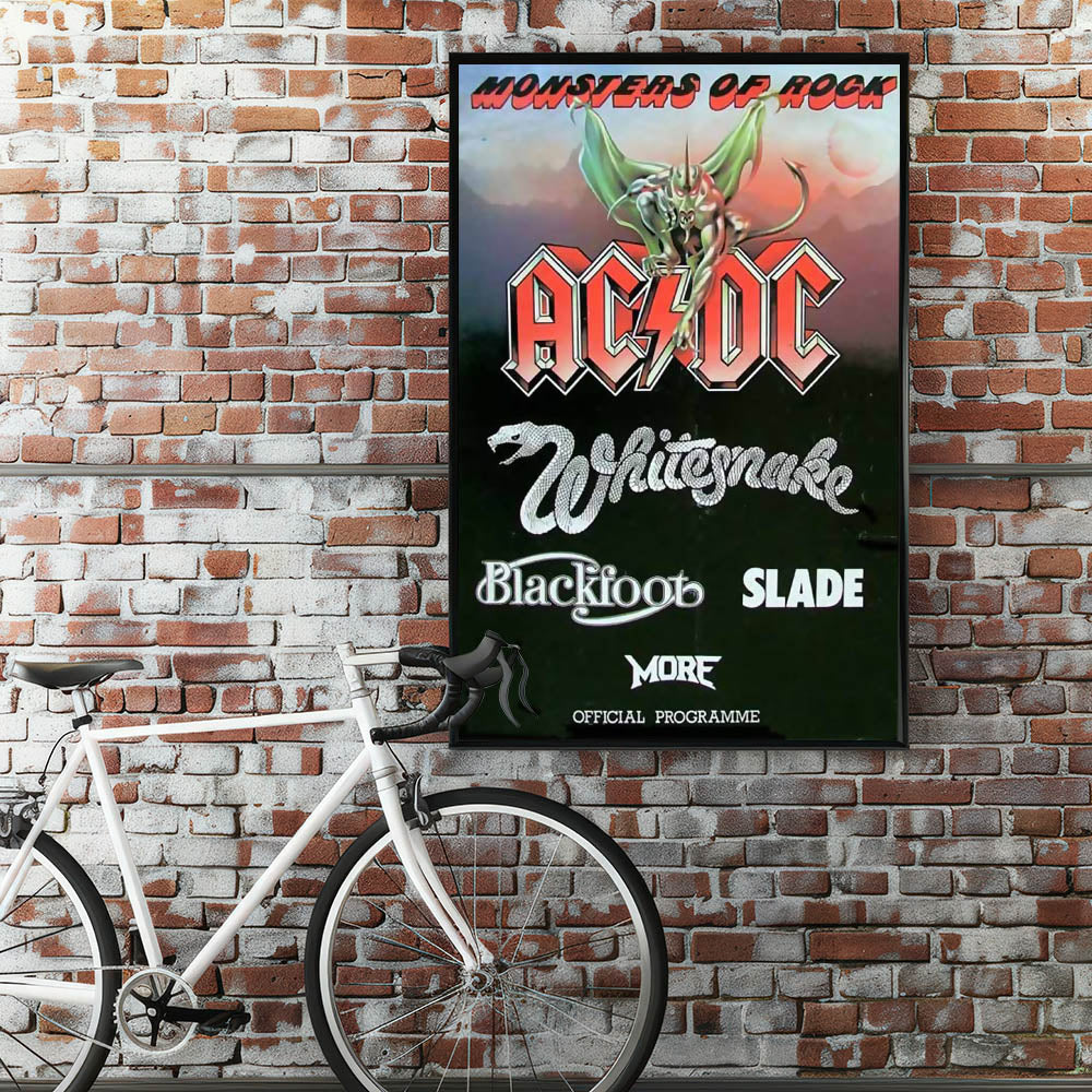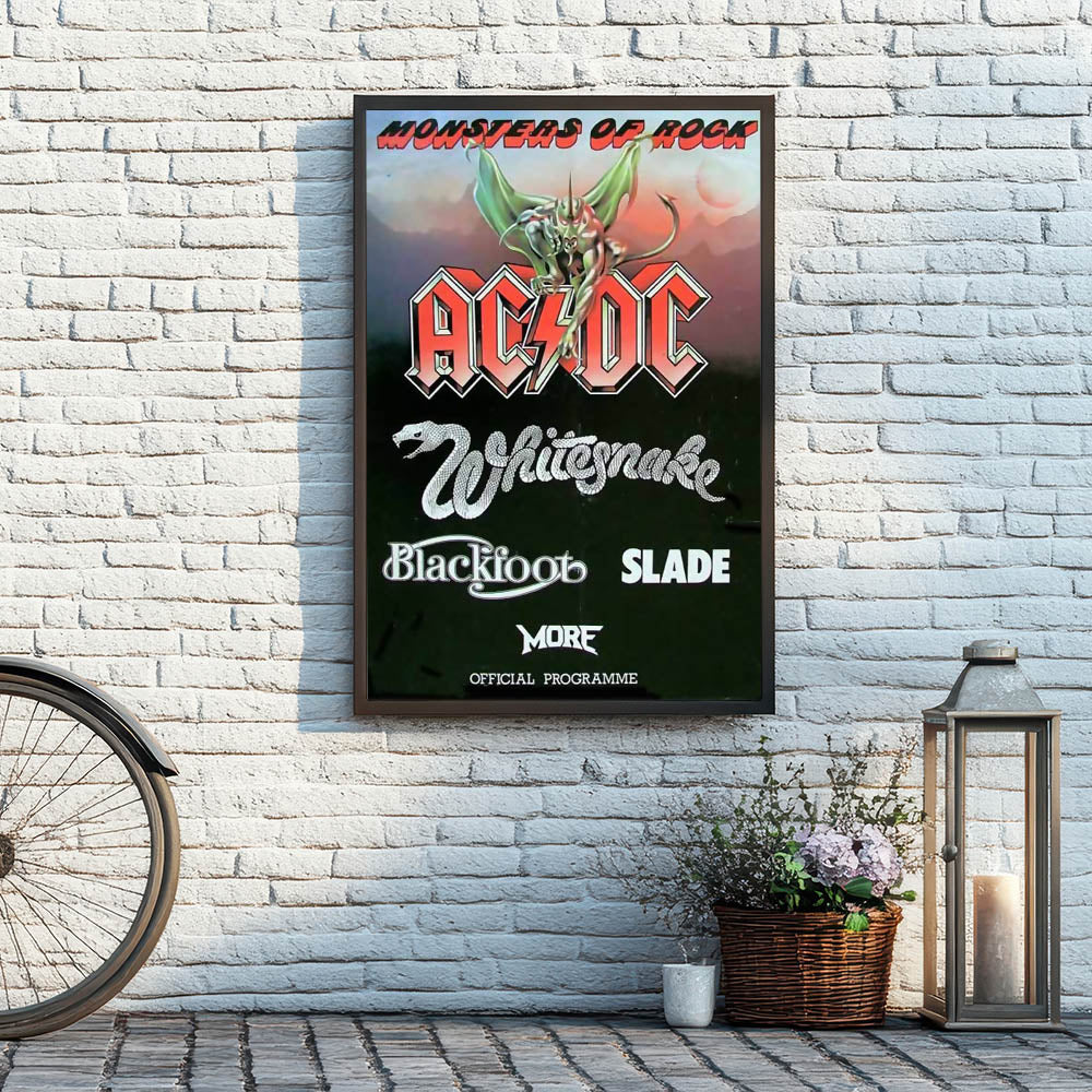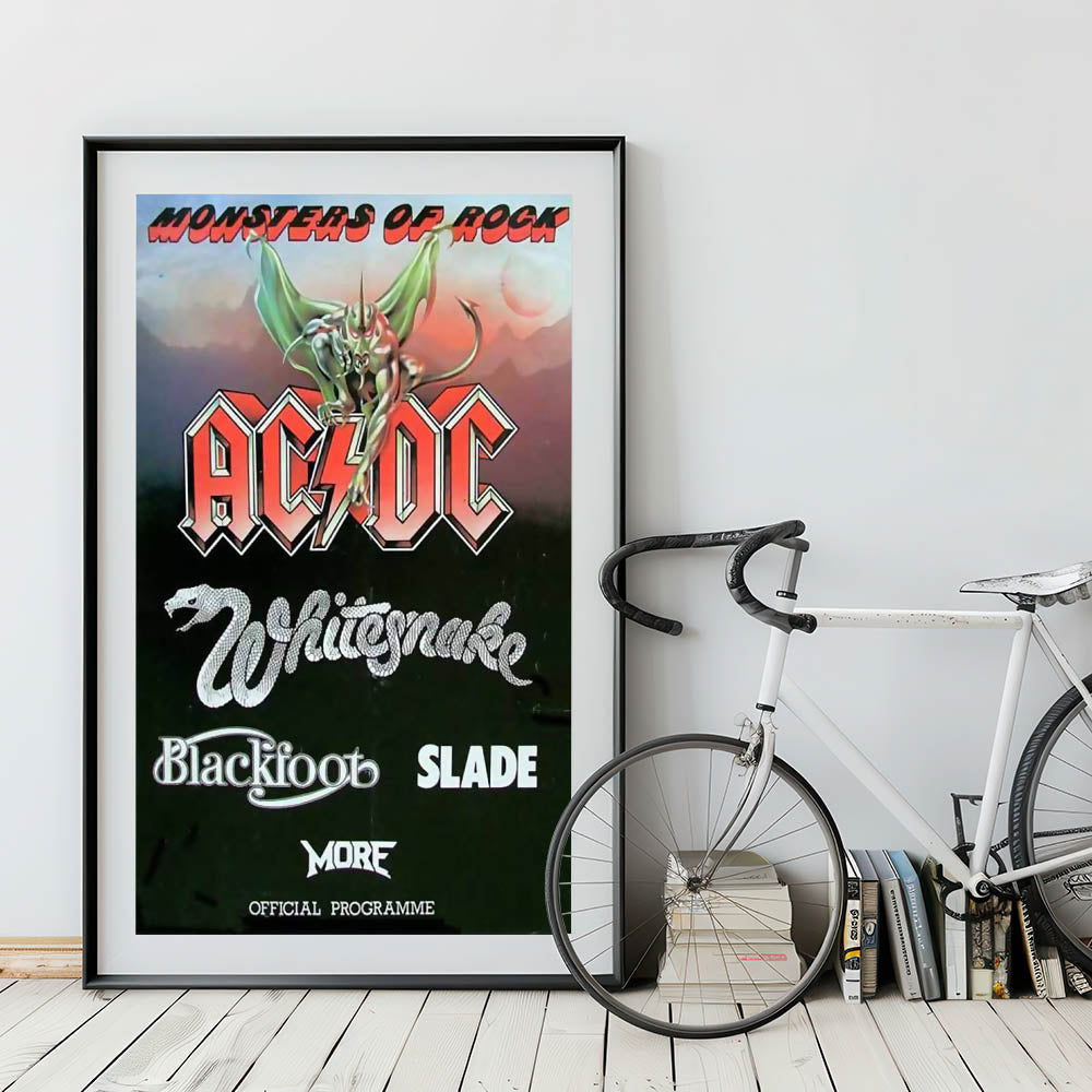 Elevate your space with this iconic Retro Rock Band Poster featuring legendary acts like AC/DC, Whitesnake, Blackfoot, Slade, and More. This vintage print captures the essence of classic rock with bold typography and a dark, atmospheric design, making it a must-have for rock enthusiasts and those who love Retro Aesthetic decor. Perfect for music rooms, home offices, or living spaces, this nostalgic art print brings the energy of a live concert into your home.