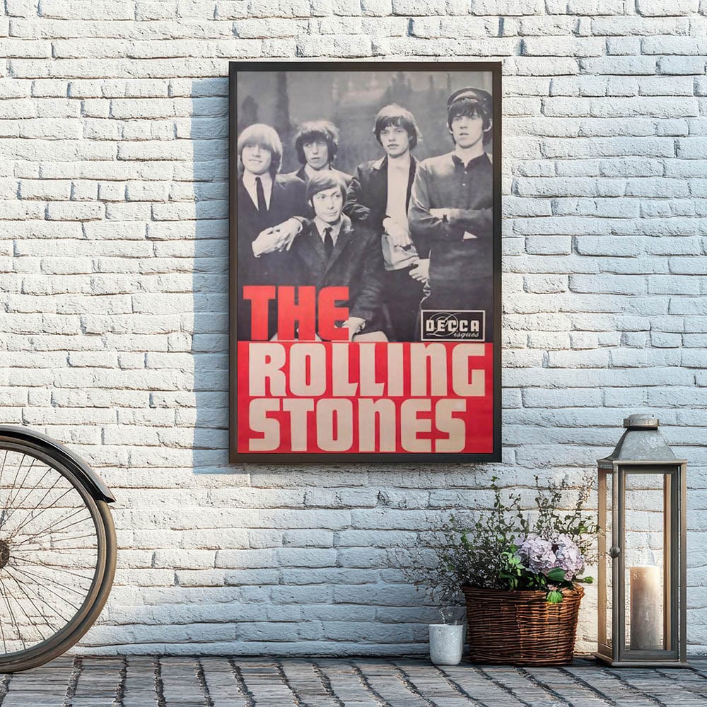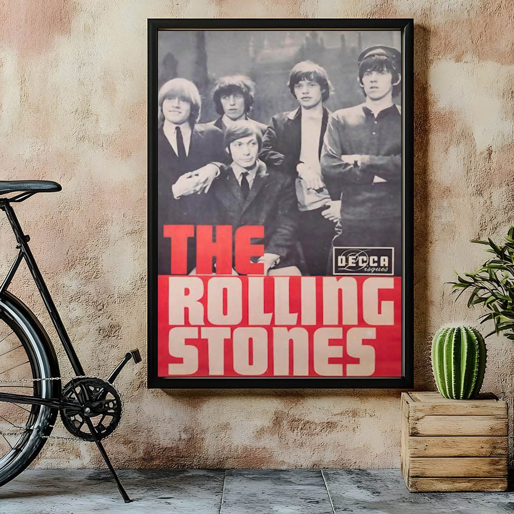 Celebrate the legendary Rolling Stones with this vintage 1960s poster, featuring the iconic black-and-white image of the band in their early days. With bold red text and the classic "Decca" logo, this retro wall art captures the essence of the rock 'n roll era. The timeless image of Mick Jagger, Keith Richards, and the rest of the band will transport you to the height of their musical revolution. Perfect for any music enthusiast or vintage decor collector, this piece serves as both a tribute to the Rolling Stones' legacy and a nod to mid-century modern art.