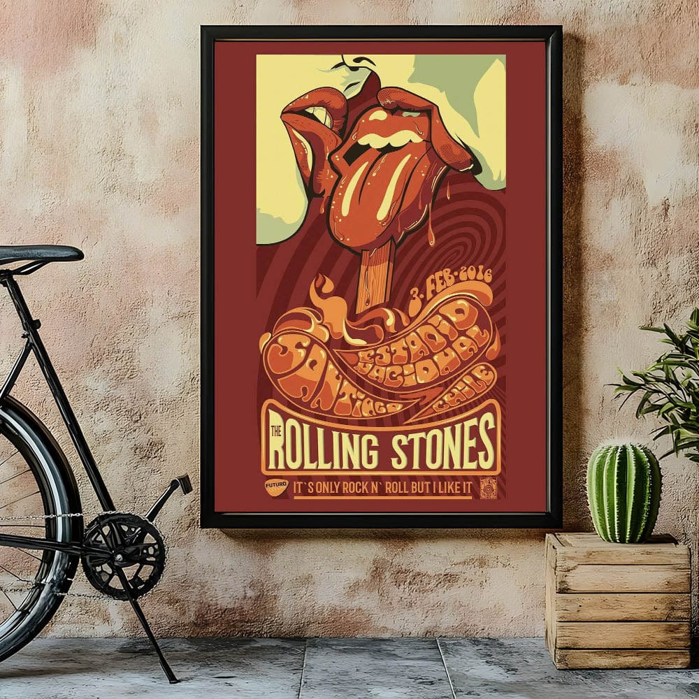 This colorful Rolling Stones concert poster from their 2016 tour in Santiago, Chile, is a bold and dynamic representation of the legendary band’s iconic style. Featuring the famous "tongue and lips" logo dripping with vibrant orange hues, this retro design brings together psychedelic elements with rock ‘n roll. The playful typography and swirling shapes add a unique touch to this tribute poster, perfect for fans of the band and collectors of concert memorabilia. This piece captures the high energy of the Rolling Stones’ live performances while adding a pop of color to any space.