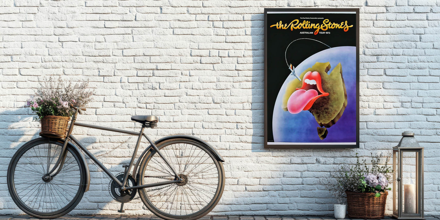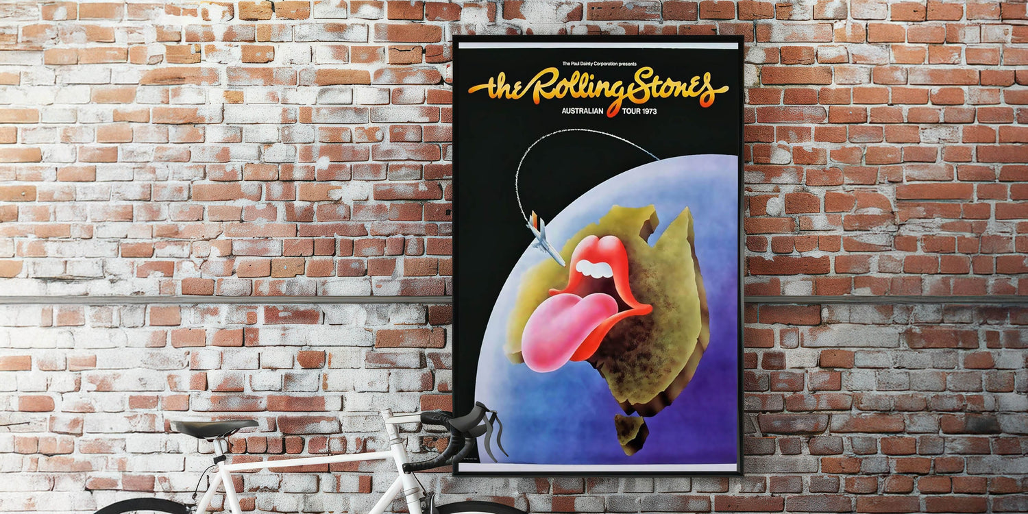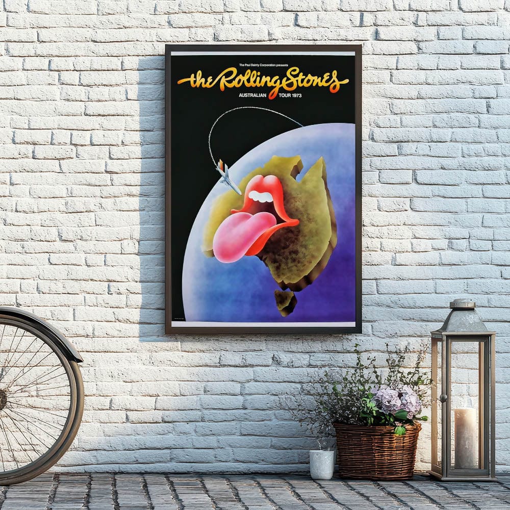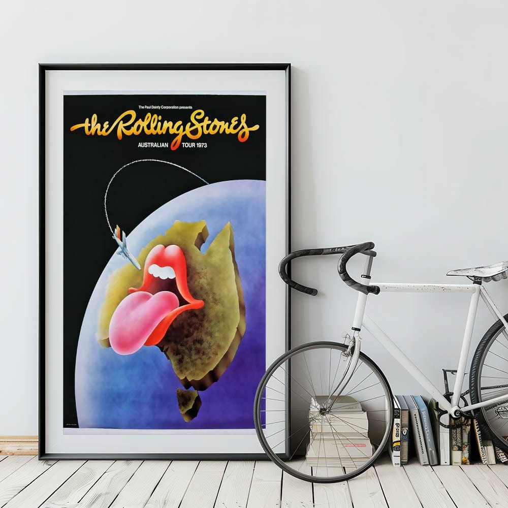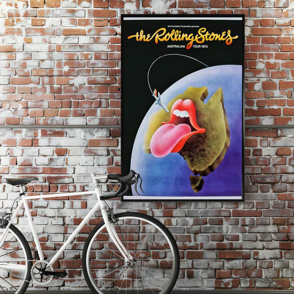 This classic Rolling Stones Australian Tour 1973 poster is a must-have for fans and collectors of vintage rock memorabilia. Featuring the iconic "tongue and lips" logo with a creative twist, this vibrant artwork shows the logo on top of a stylized map of Australia, complete with a jet flying over. The combination of bold, bright colors and iconic imagery perfectly captures the energy and excitement of the Rolling Stones during their legendary tours. It’s an excellent way to add a nostalgic, retro touch to your home or office, and celebrate the legacy of one of the greatest rock bands in history.