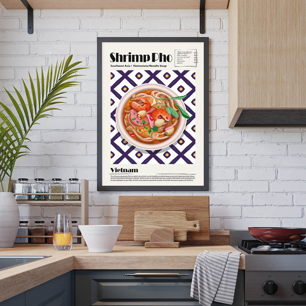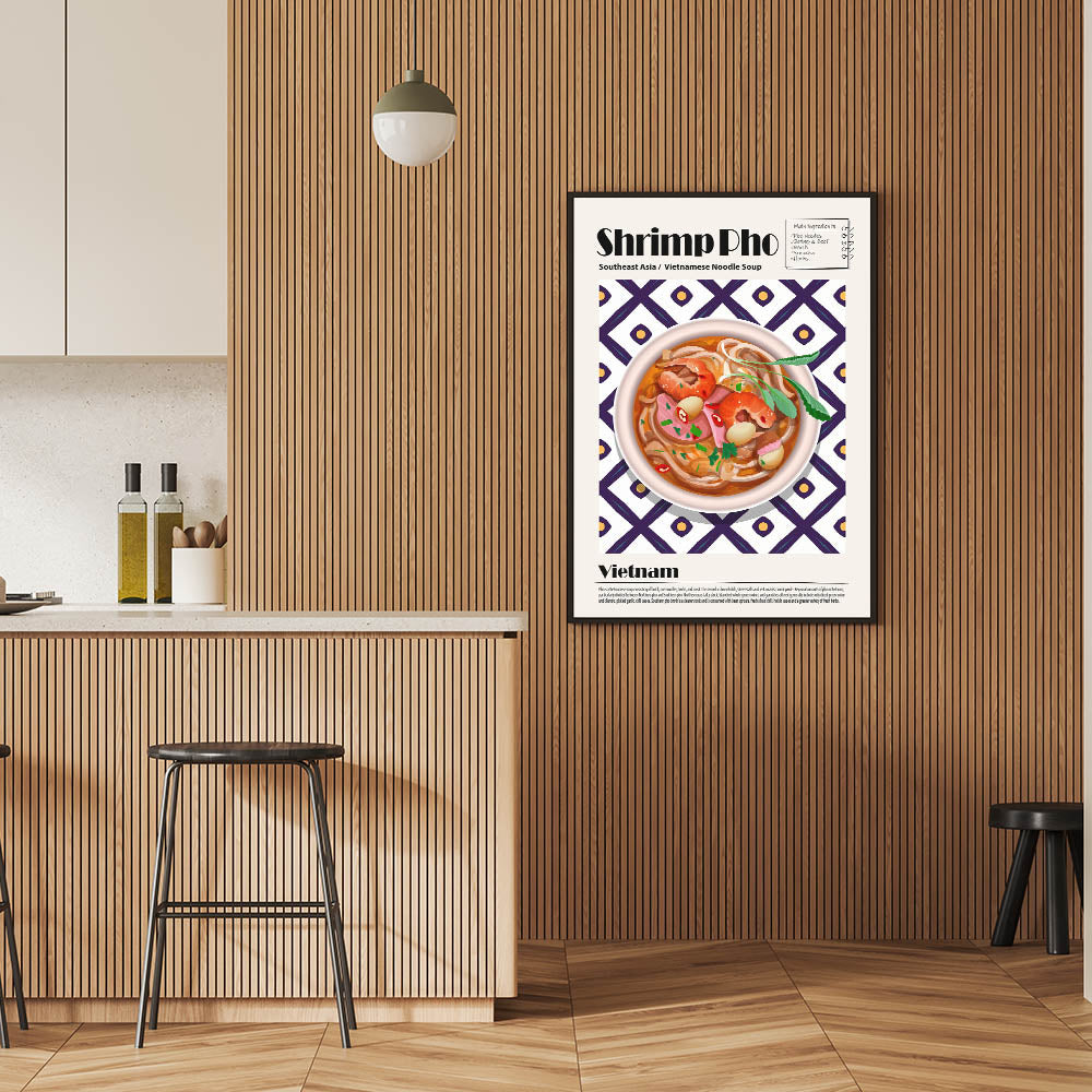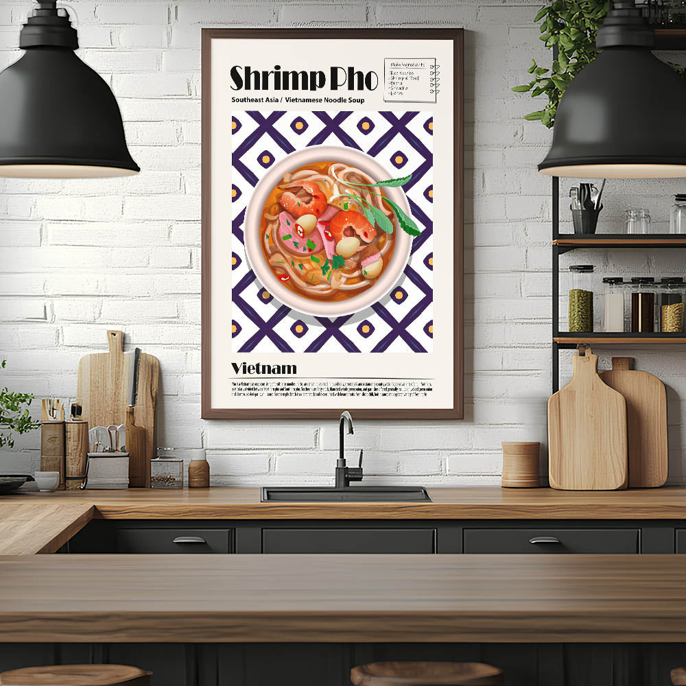 Bring the flavors of Vietnam to your space with this Shrimp Pho Dishes Wall Art, a vibrant and artistic representation of the famous noodle soup. This culinary wall art features a steaming bowl of shrimp pho, with plump shrimp, tender rice noodles, fresh herbs, sliced chili peppers, beef cuts, and rich broth. The bold geometric background enhances the artistic contrast, making this food wall art a perfect statement piece for kitchen decor or dining room wall art collections.