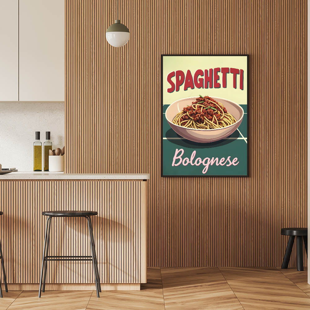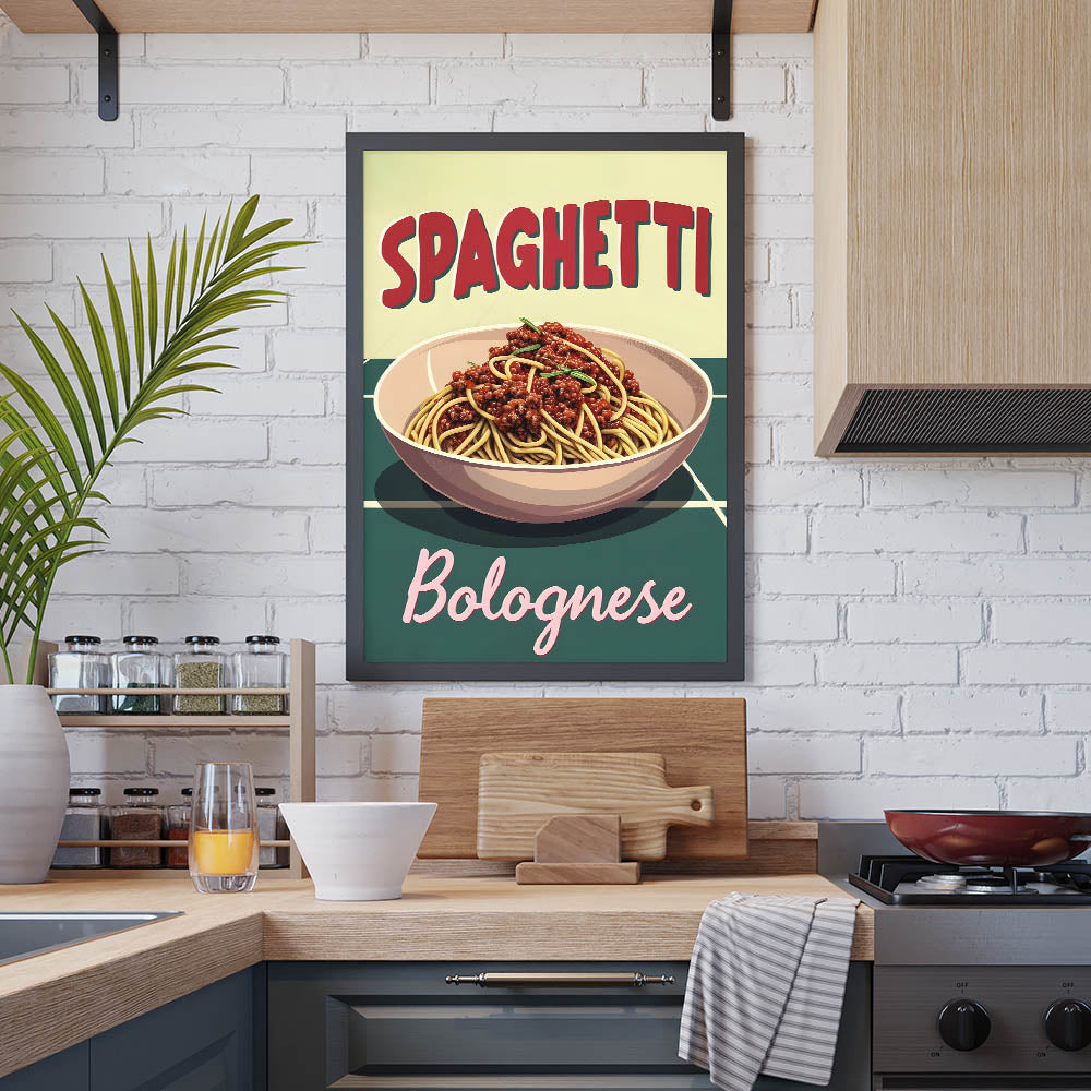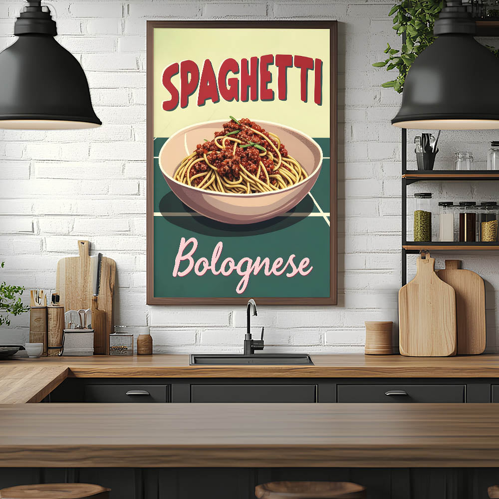 Celebrate the classic flavors of Italian cuisine with this vibrant Spaghetti Bolognese Wall Art. Featuring a bold, retro-inspired illustration of a steaming bowl of spaghetti with rich Bolognese sauce, this Food-Themed Art Print brings warmth and nostalgia to your kitchen or dining area. Perfect for pasta enthusiasts and vintage design lovers, this Kitchen Wall Decor is a standout addition to any space.